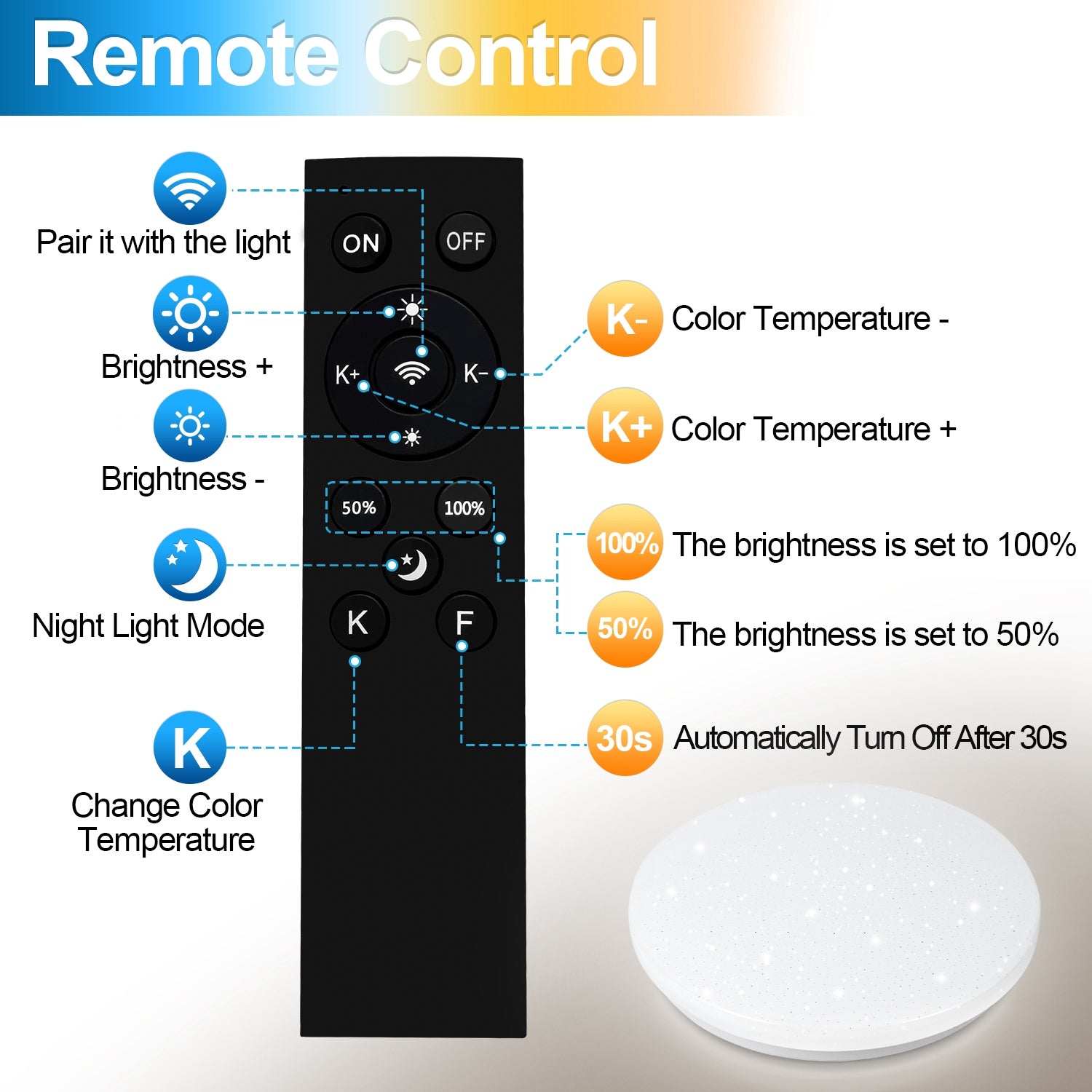 Nachtlicht Funktion & Timer-Funktion: Druecken Sie die Nachtlichttaste, um die Helligkeit auf 10% einzustellen. Die Nachtlichtfunktion kann eine ideale Schlafatmosphaere fuer Sie und Ihre Lieben schaffen. Wenn Sie die Timer-Funktion per Fernbedienung waehlen, schaltet sich die LED-Deckenleuchte nach 30 Sekunden automatisch aus.