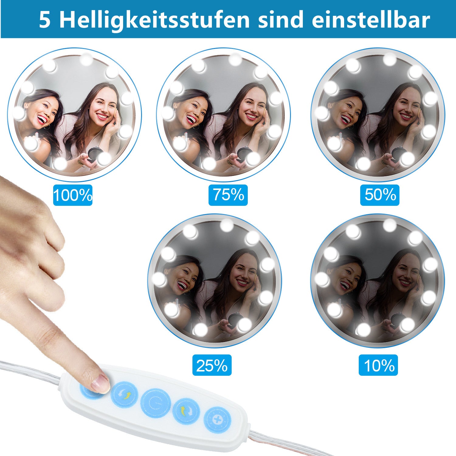 Unsere Spiegelleuchte hat drei Farbtemperaturen, fünf einstellbare Helligkeitsstufen und ist äußerst einfach zu installieren, um sofort einen perfekteren Make-up-Look zu erzielen. Wenn Sie eine professionelle, anspruchsvolle Make-up-Anwendung zu Hause haben möchten, werden unsere Spiegelleuchten im Hollywood-Stil den Zweck erfüllen und dafür sorgen, dass Sie sich wie ein Star fühlen!