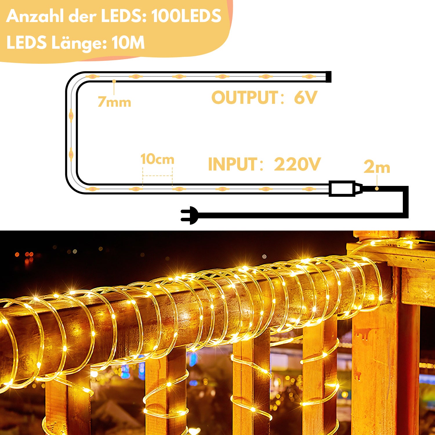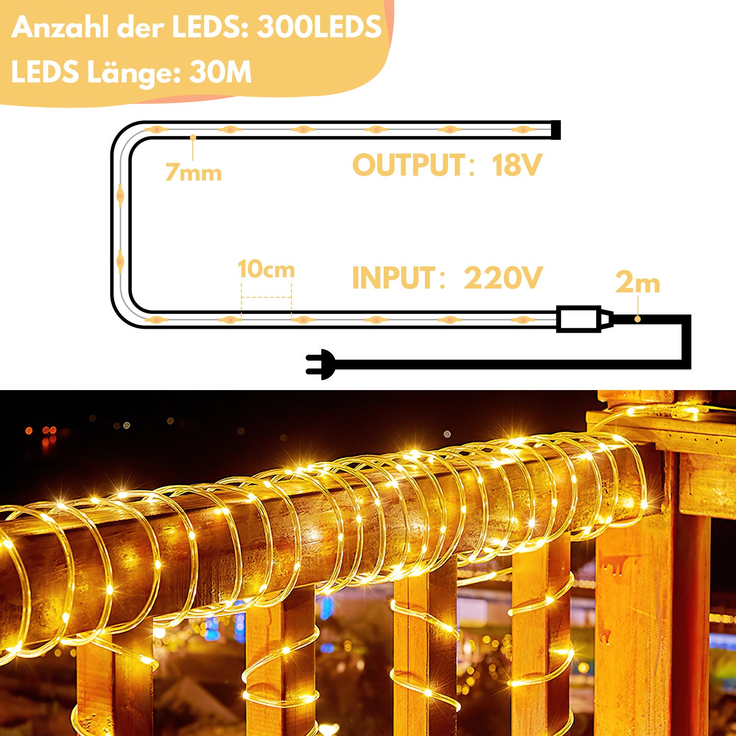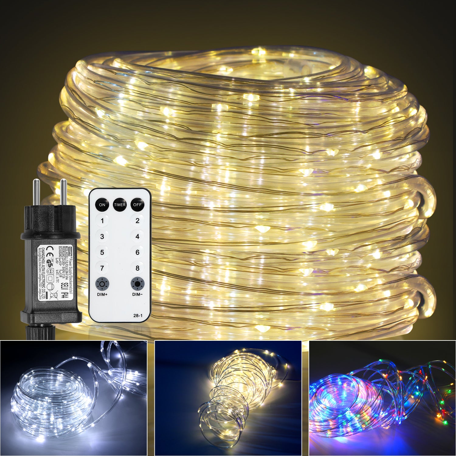 ★Verbesserte Verschleißfestigkeit: Die Lichterkette verfügt über 100/200/300 LEDs auf einer Gesamtlänge von 10/20/30 Metern. Die äußere, transparente Röhre besteht aus hochwertigem PVC und hat verbesserte Reibradgetriebe, die die LEDs im Inneren besser schützen und damit haltbarer und sicherer machen. Die Lichterkette kann aufgrund des geringen Verformungswiderstands in jede gewünschte Form gebracht werden.