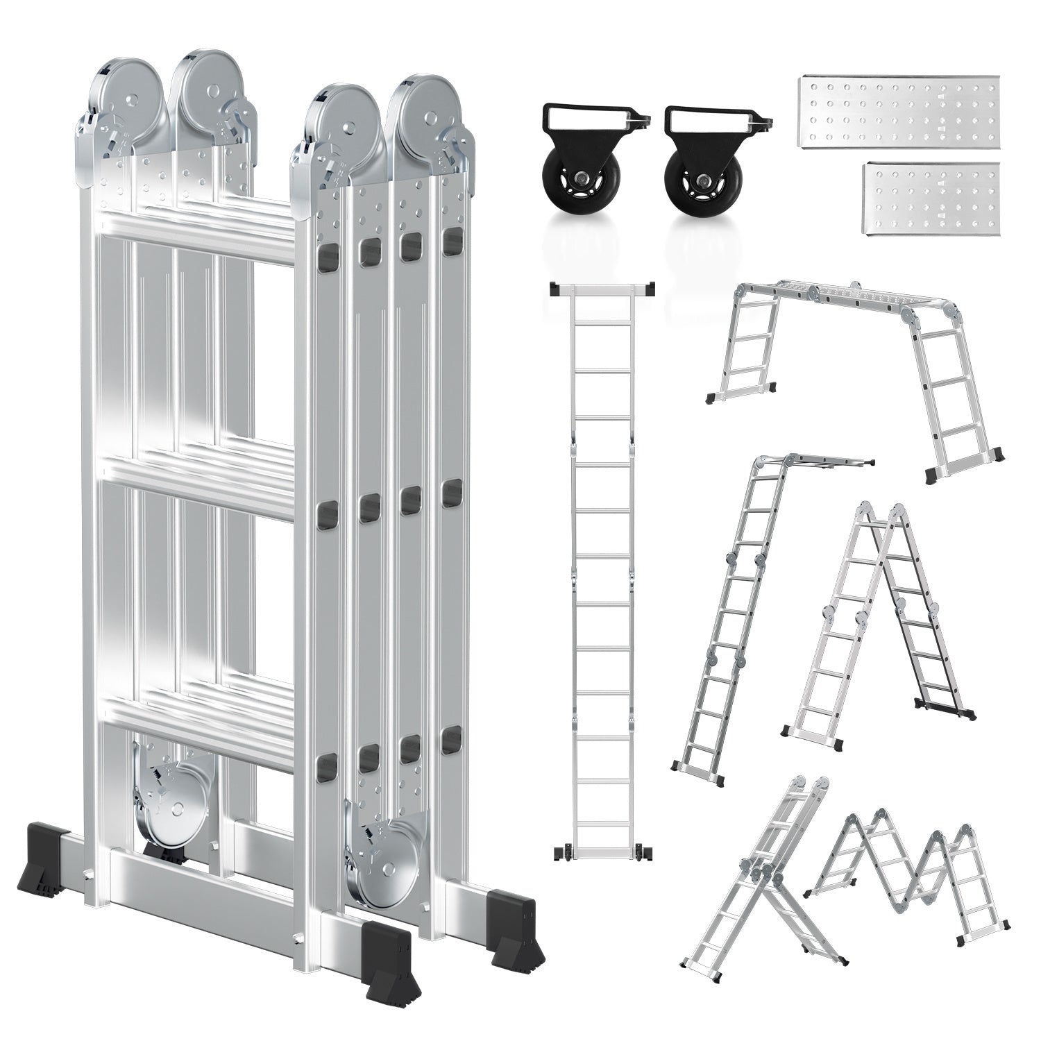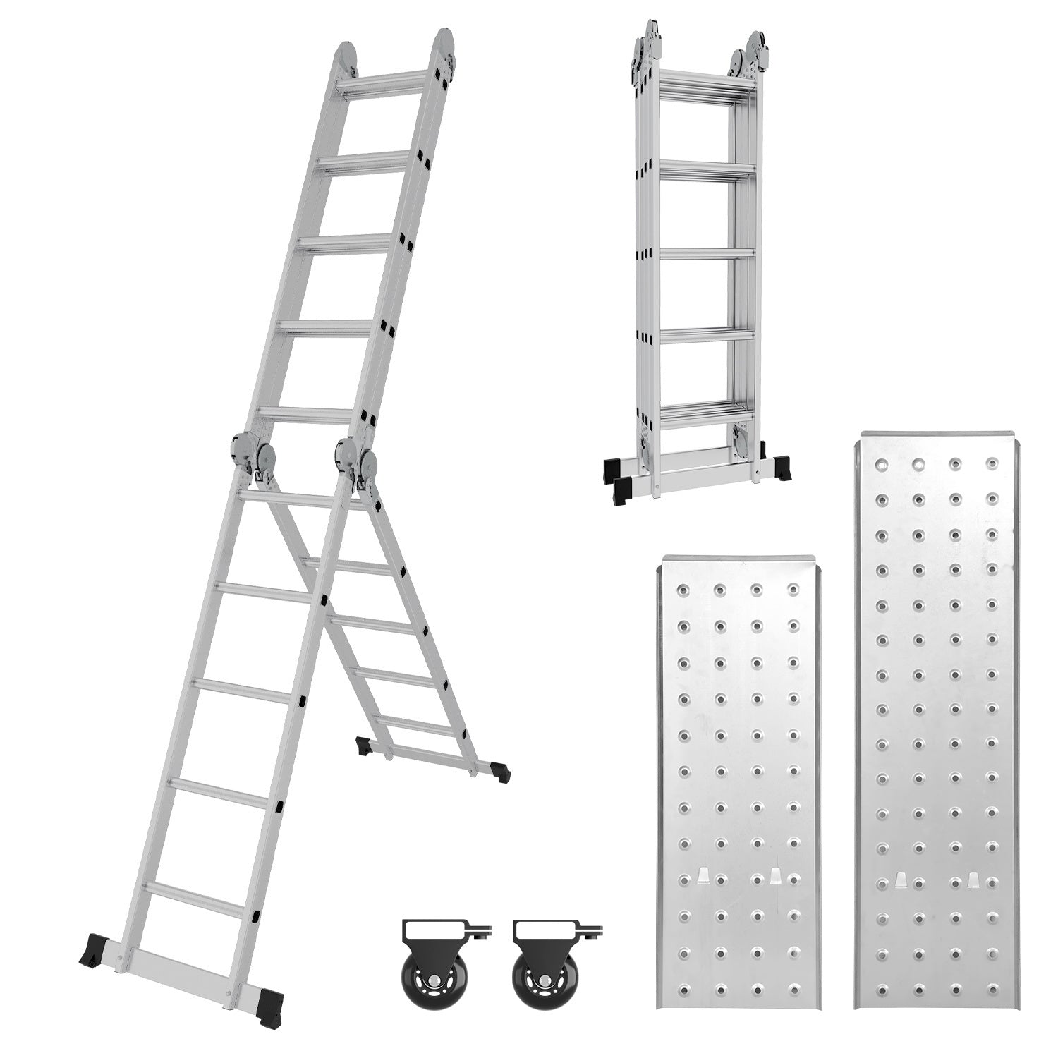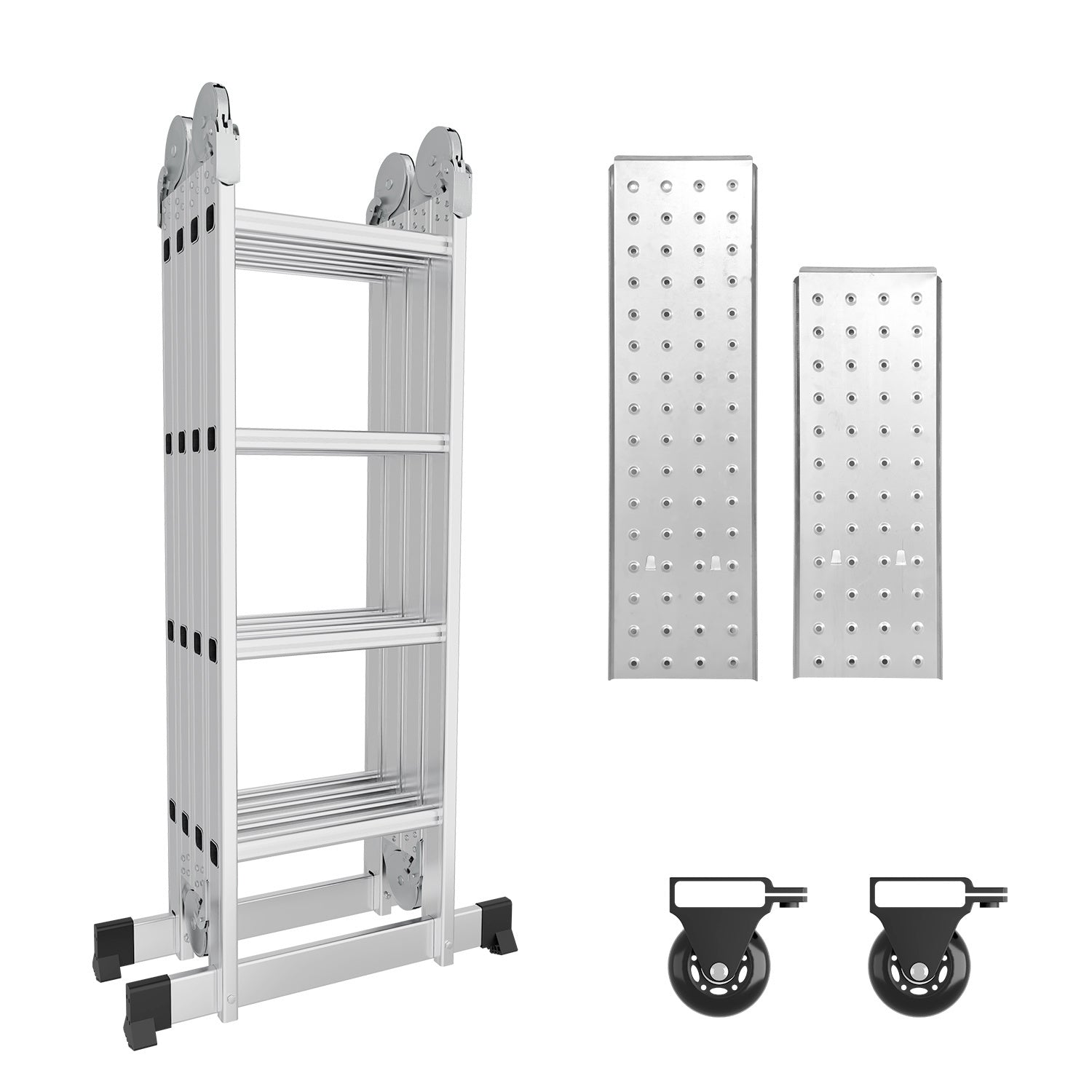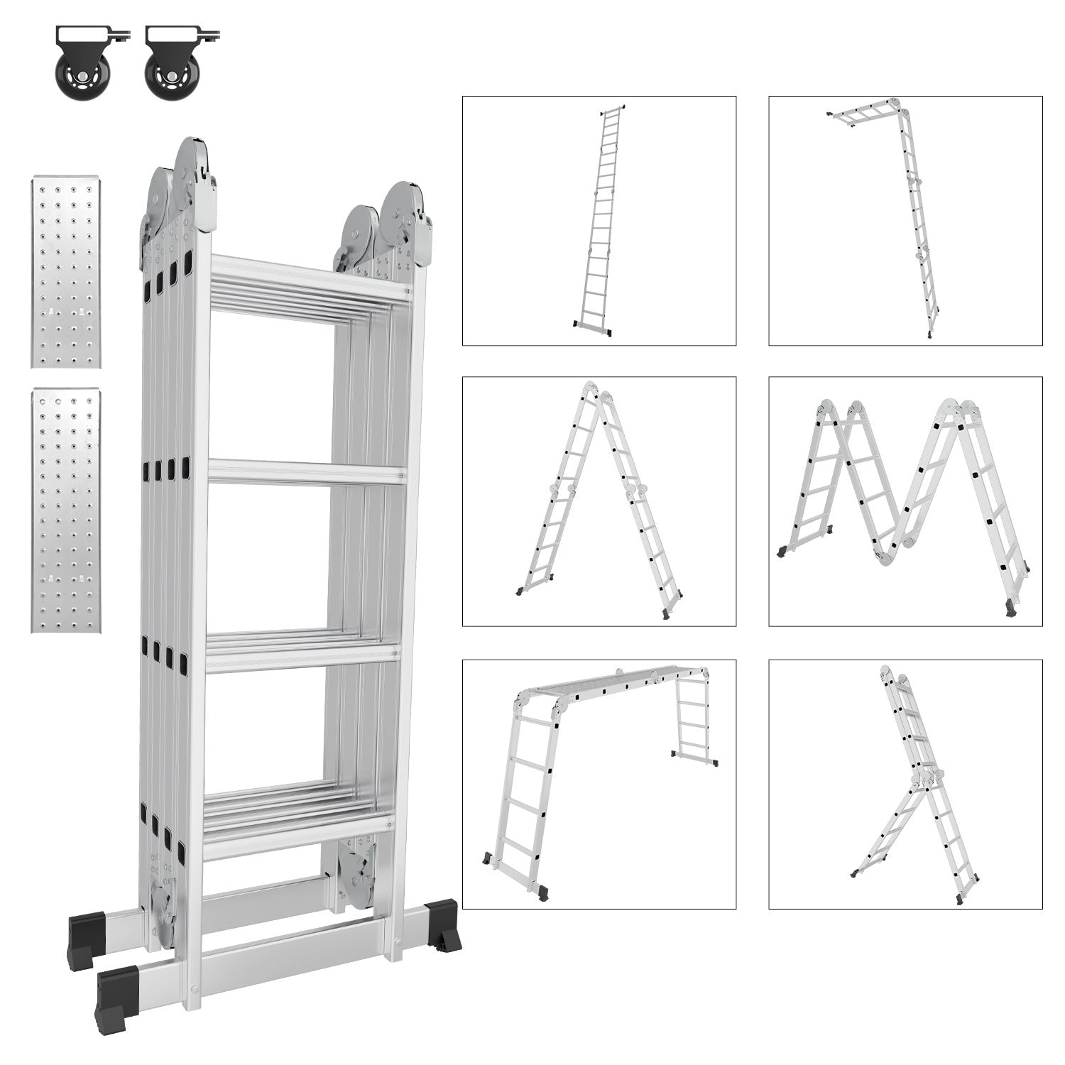 Hochwertige&langlebige Materialien: Aluminium-Mehrzweckleiter mit einer Gesamtlänge von 3,6/4,7/5,8 m und einer Tragfähigkeit von bis zu 150 kg. Die Leiter verfügt über 4x3/4x4/4x5 Stufen mit einem Sprossenabstand von 28 cm, 2 Rollen und Plattform, und besteht aus hochwertigem Aluminium.