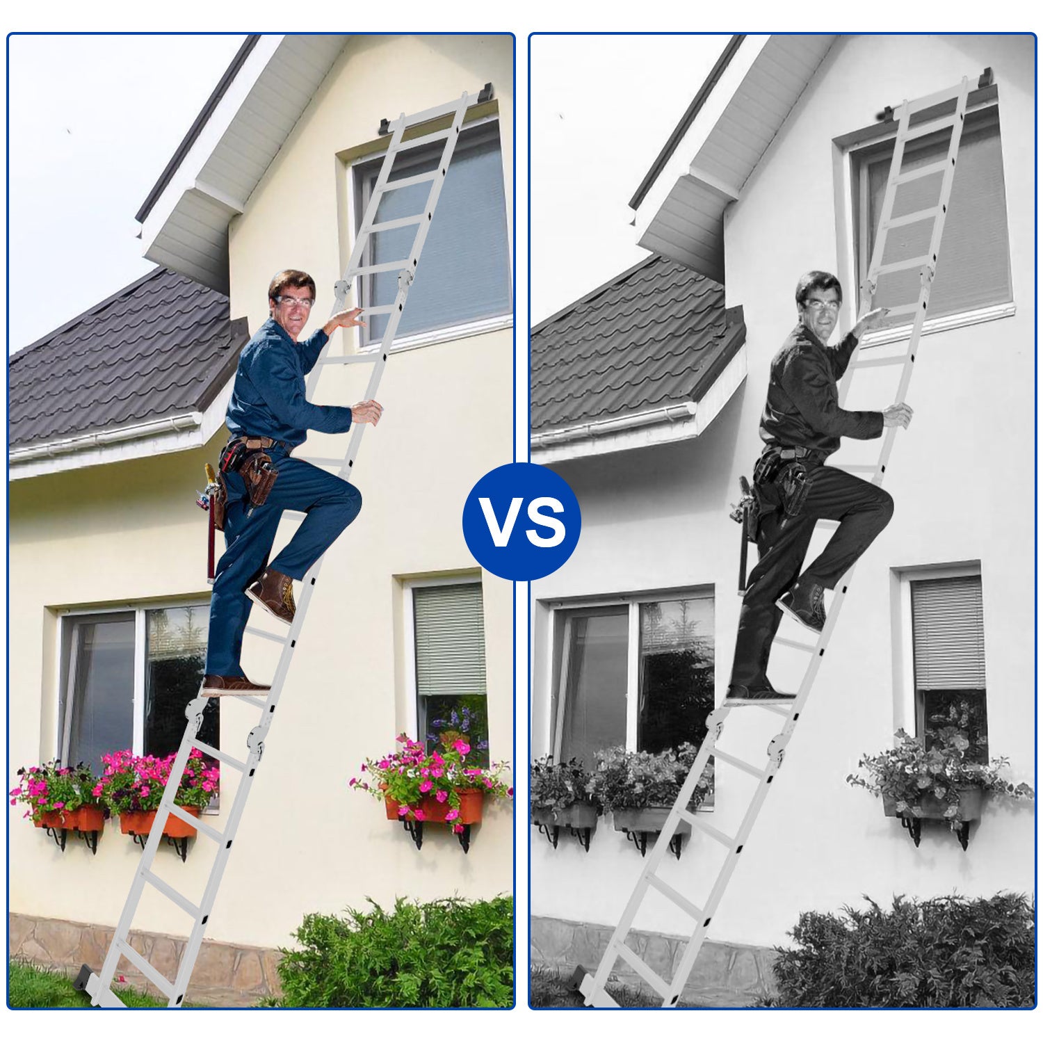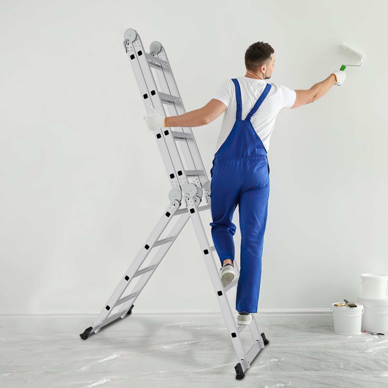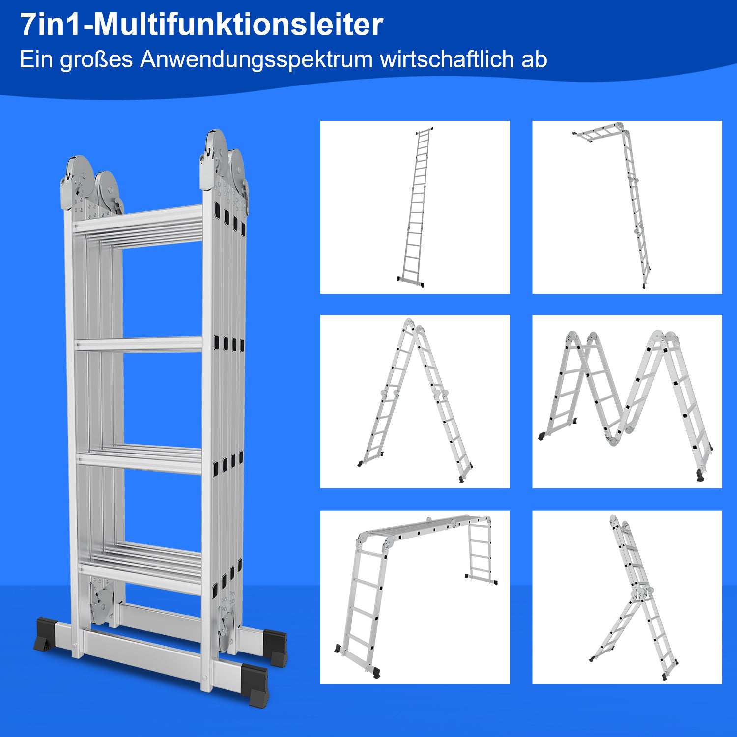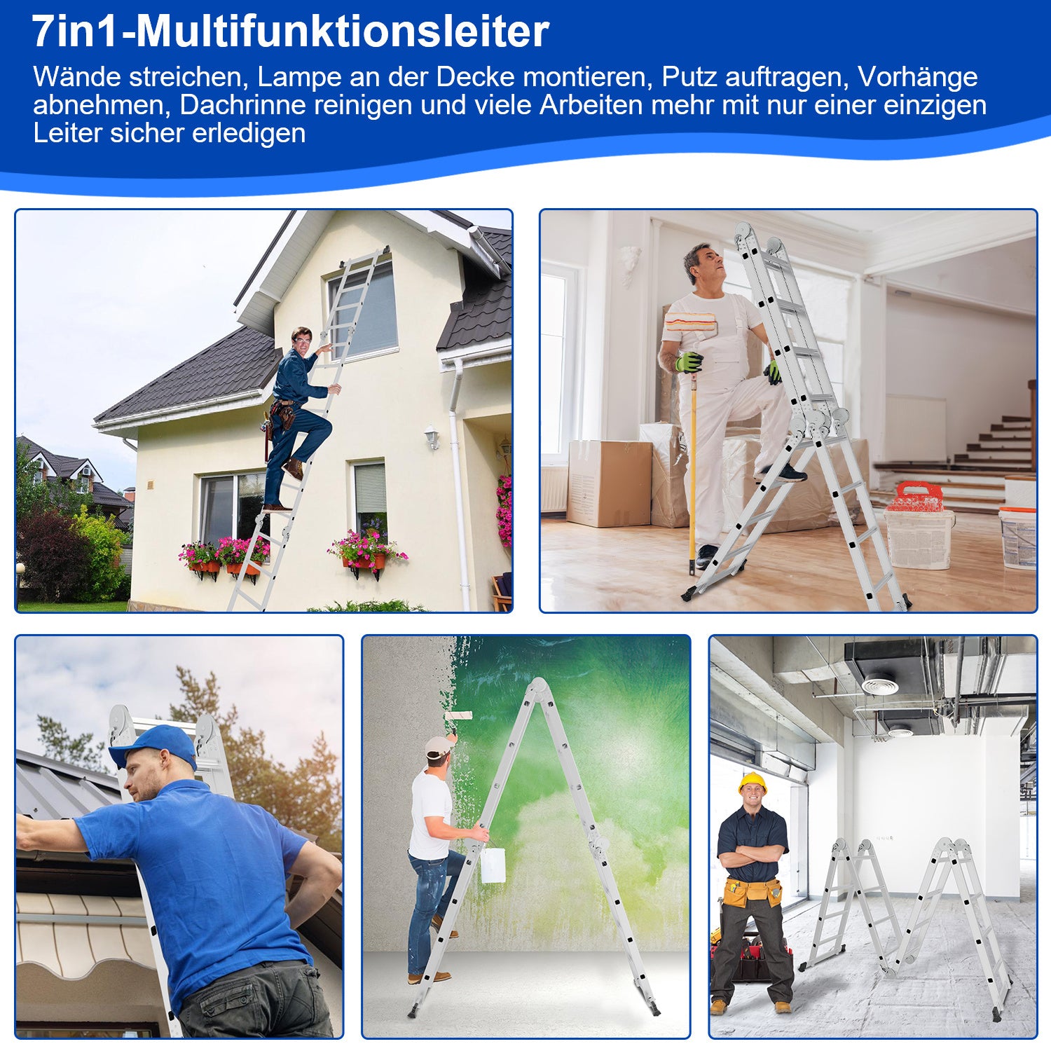 Mehrere Sicherheitsmaßnahmen: Diese Multifunktionsleiter ist stabil und langlebig, da sie aus einer rostfreien Aluminiumlegierung gefertigt ist und mit rutschfesten Gummiauflagen und automatischen Sicherheitsverschlüssen ausgestattet ist, Das gibt Ihnen mehrfache Sicherheit, um Stabilität und Langlebigkeit zu gewährleisten.