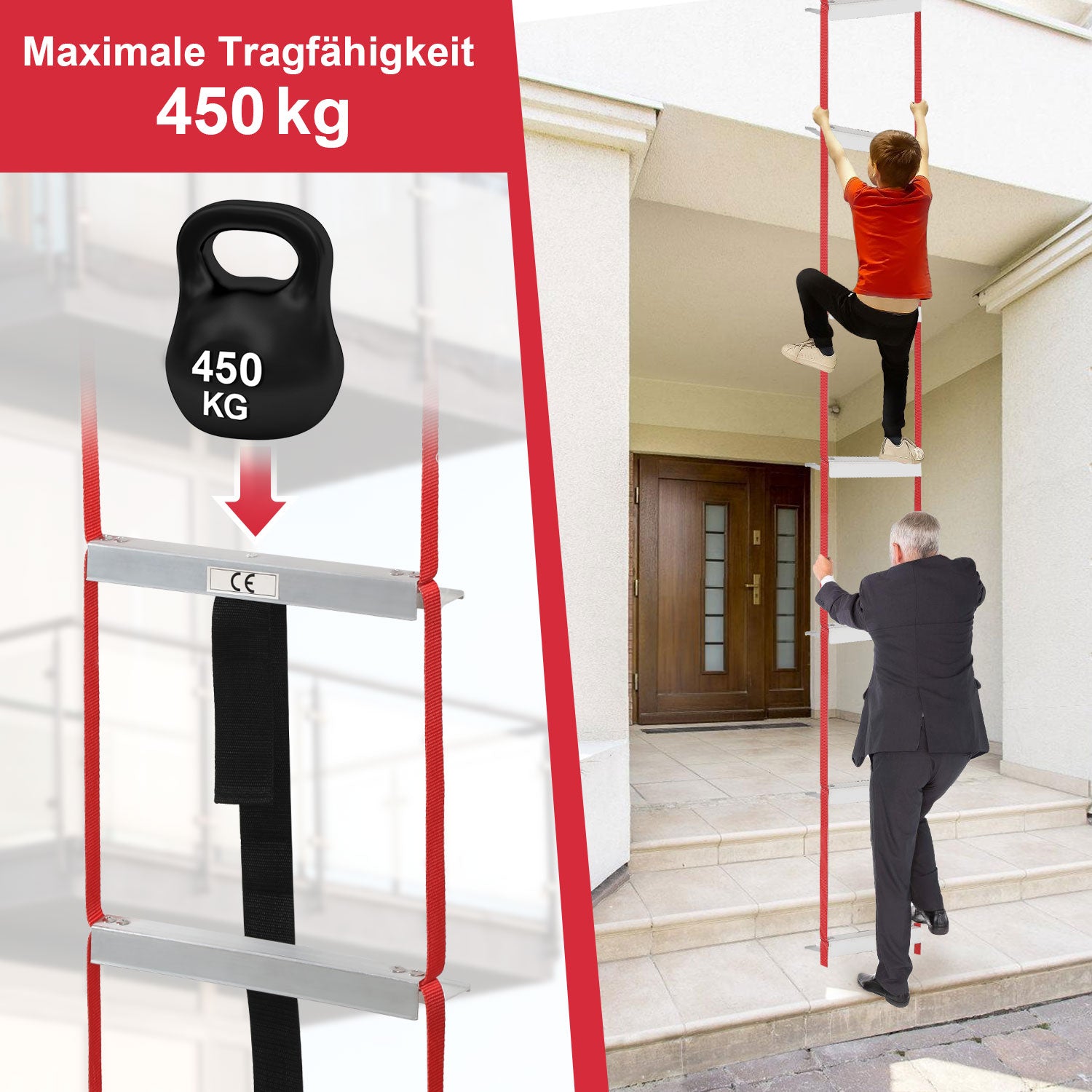 ð¡ãHochbelastbarkeit & Sicherheitã Diese 4,5 Meter lange Feuerresistente Rettungstreppe aus Hochleistungsaluminiumlegierung bietet eine TragfÀhigkeit von bis zu 450 kg. Sie ermöglicht die gleichzeitige Evakuierung von 2-3 Personen. Durch die robuste Struktur und Rostfrei-Beschichtung wird StabilitÀt und Sicherheit in Notsituationen gewÀhrleistet.
