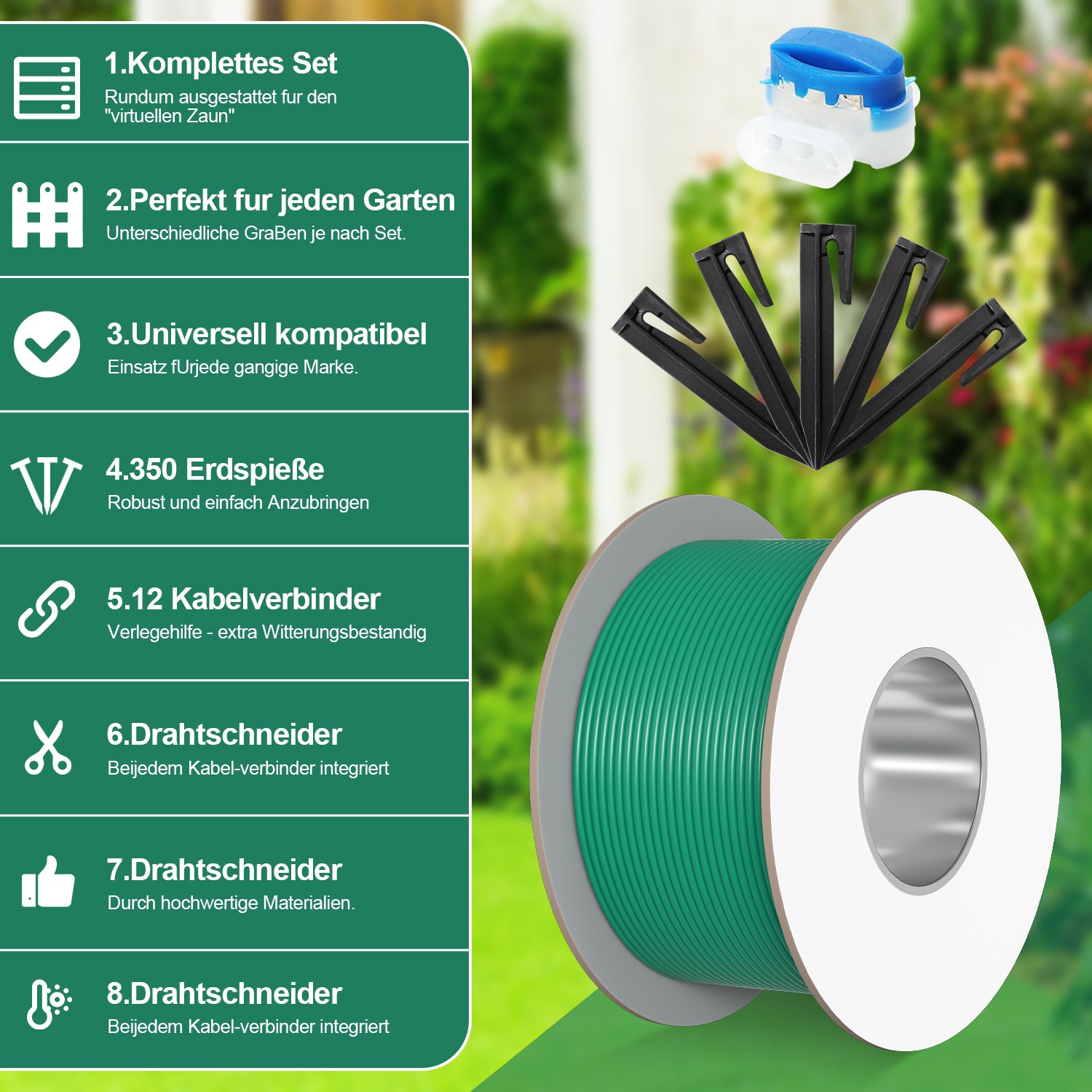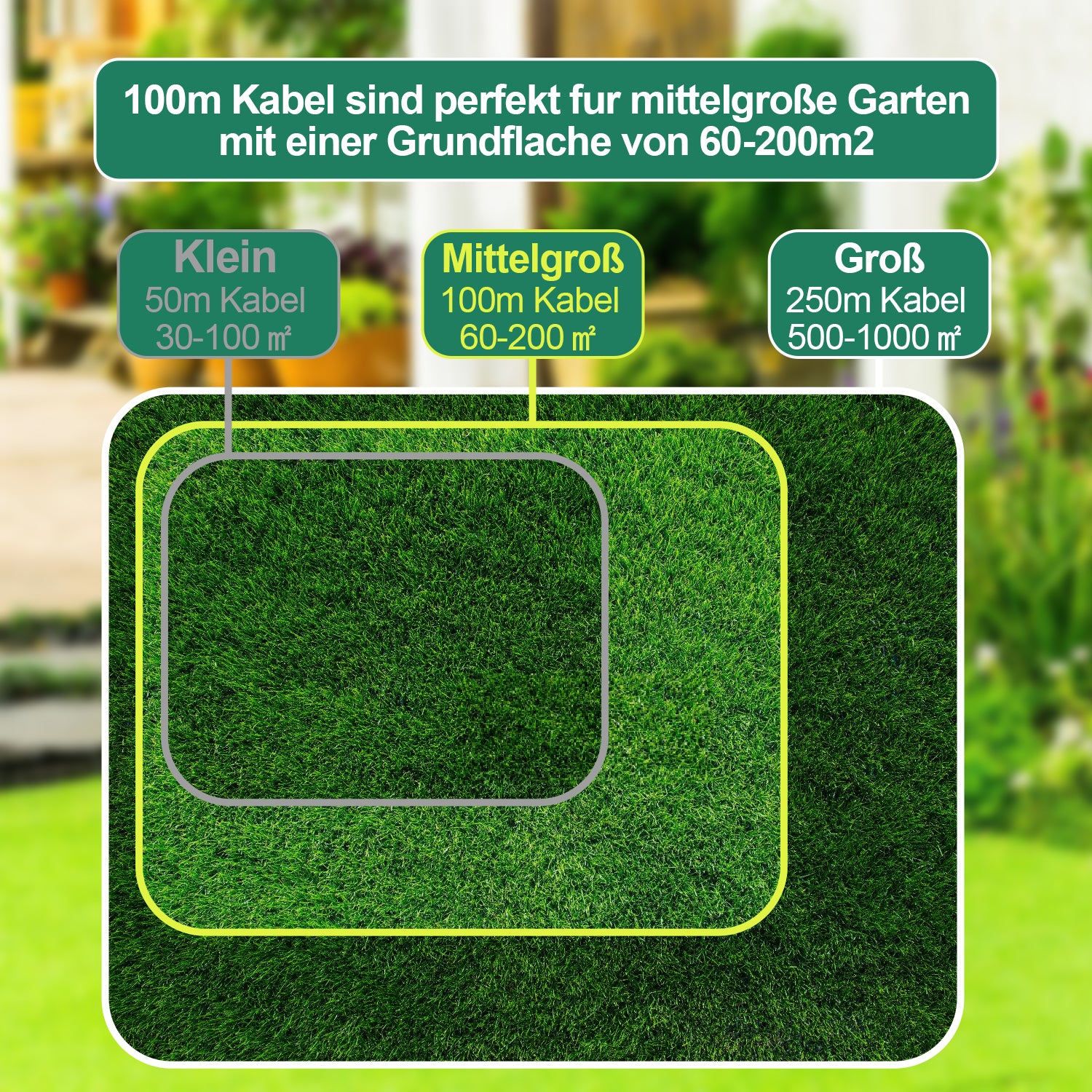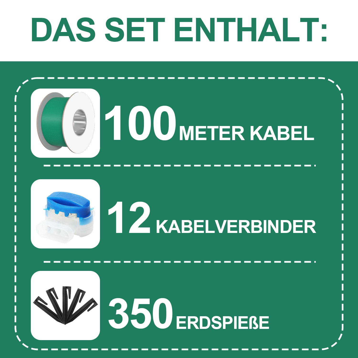 ✔️Für mittelgroße Gärten: Der 150 m lange Borderline ist für kleine Gärten mit einer Rasenfläche von 60 m² bis 200 m² geeignet. Das Set enthält 100 Meter Kabel und 350 Spikes + 12 Kabelverbinder; für größere Flächen verbinden Sie einfach mehrere Kabel mit unseren Kabelverbindern.