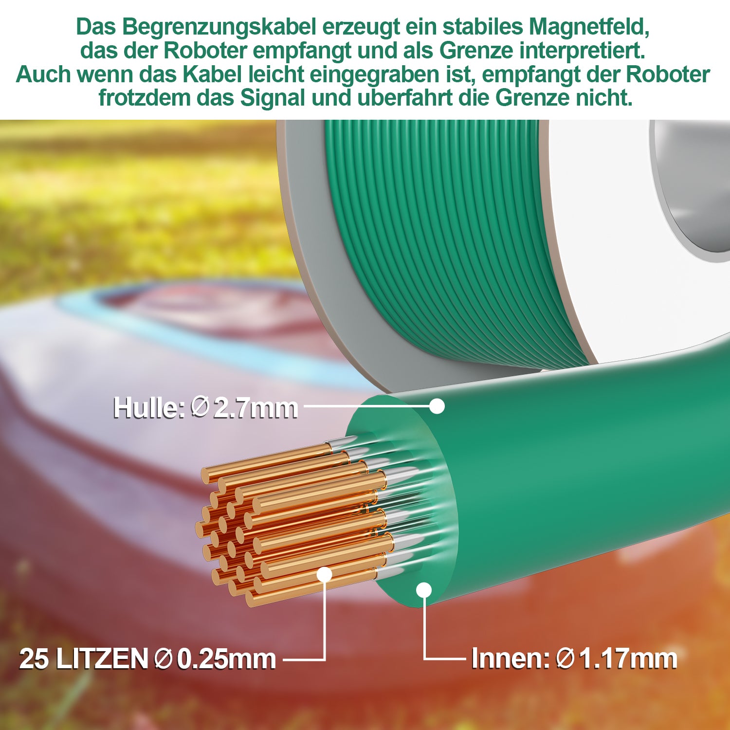 ✔️Feuchtigkeits- und witterungsbeständig: Das Begrenzungskabel des Mähroboters besteht aus 24 Einzelteilen aus hochwertigem, verzinntem, verkupfertem Aluminium mit hervorragender elektrischer Leitfähigkeit; der Hülsendurchmesser beträgt nur 2,7 mm und der Innendurchmesser 1,17 mm, was es stark, langlebig und witterungsbeständig macht.