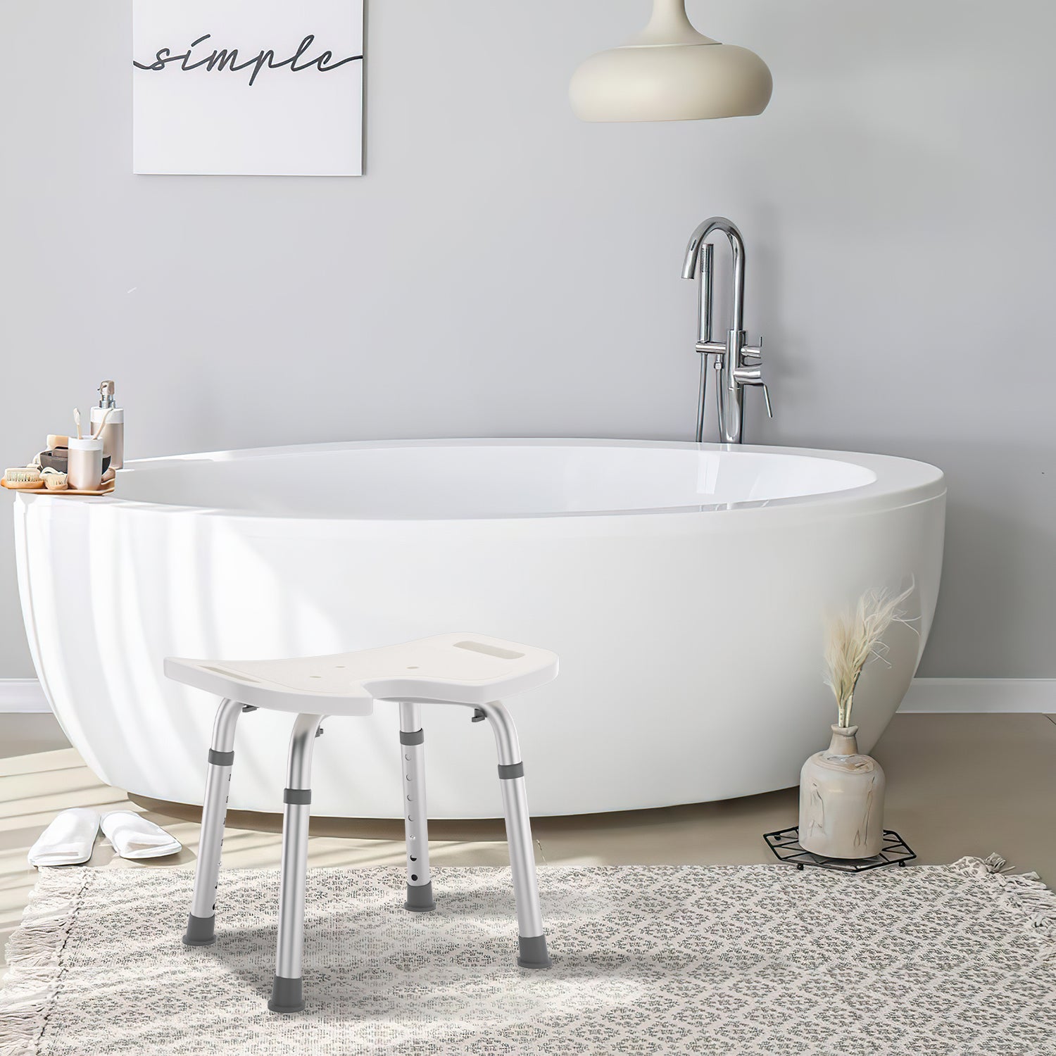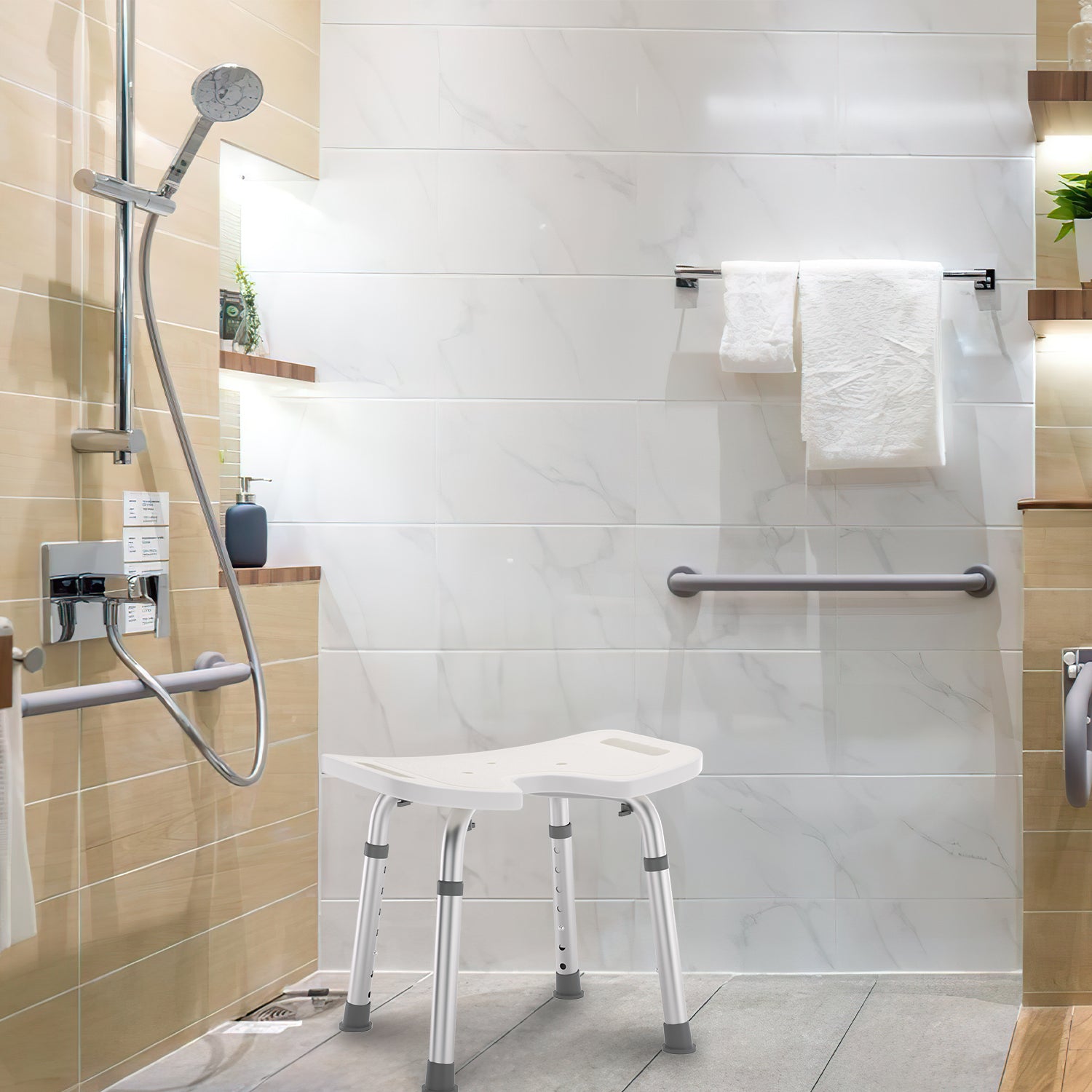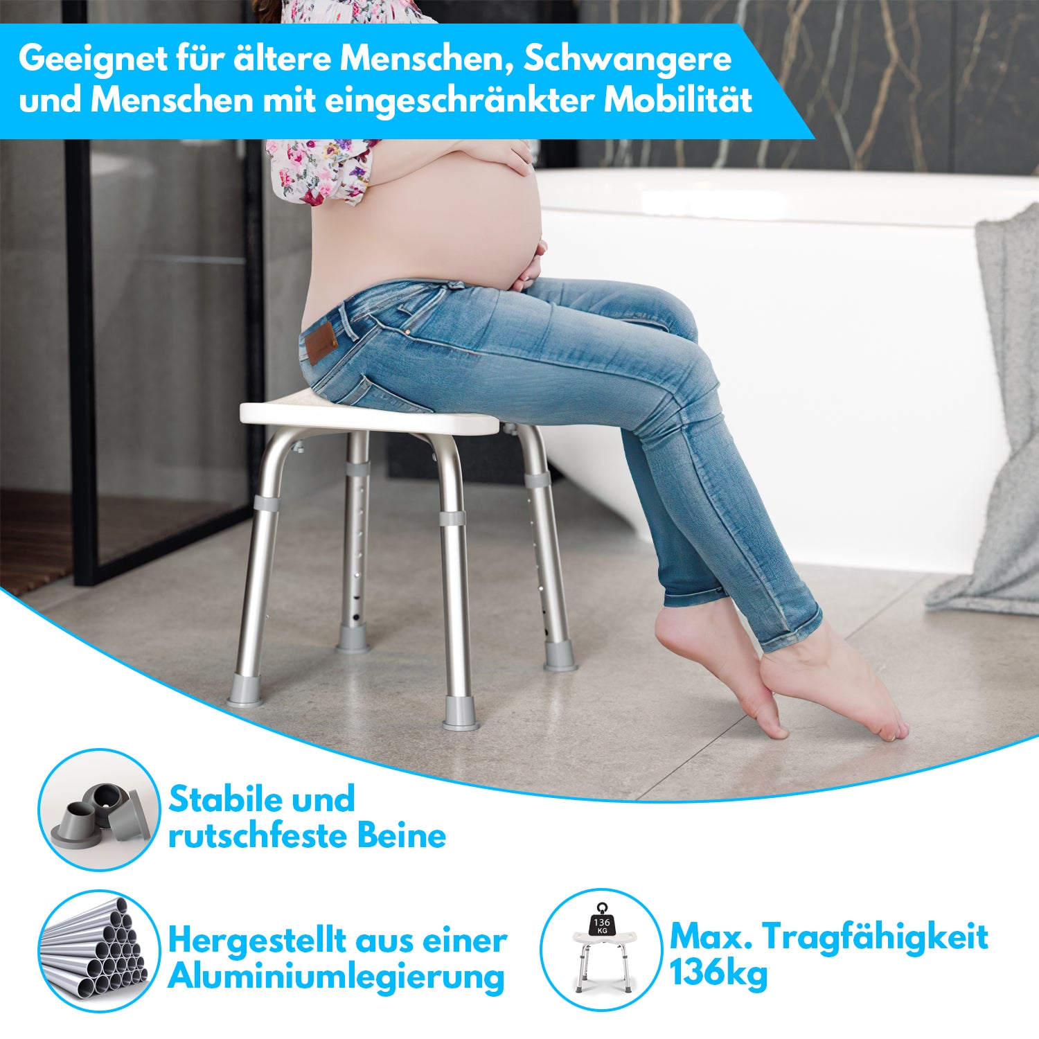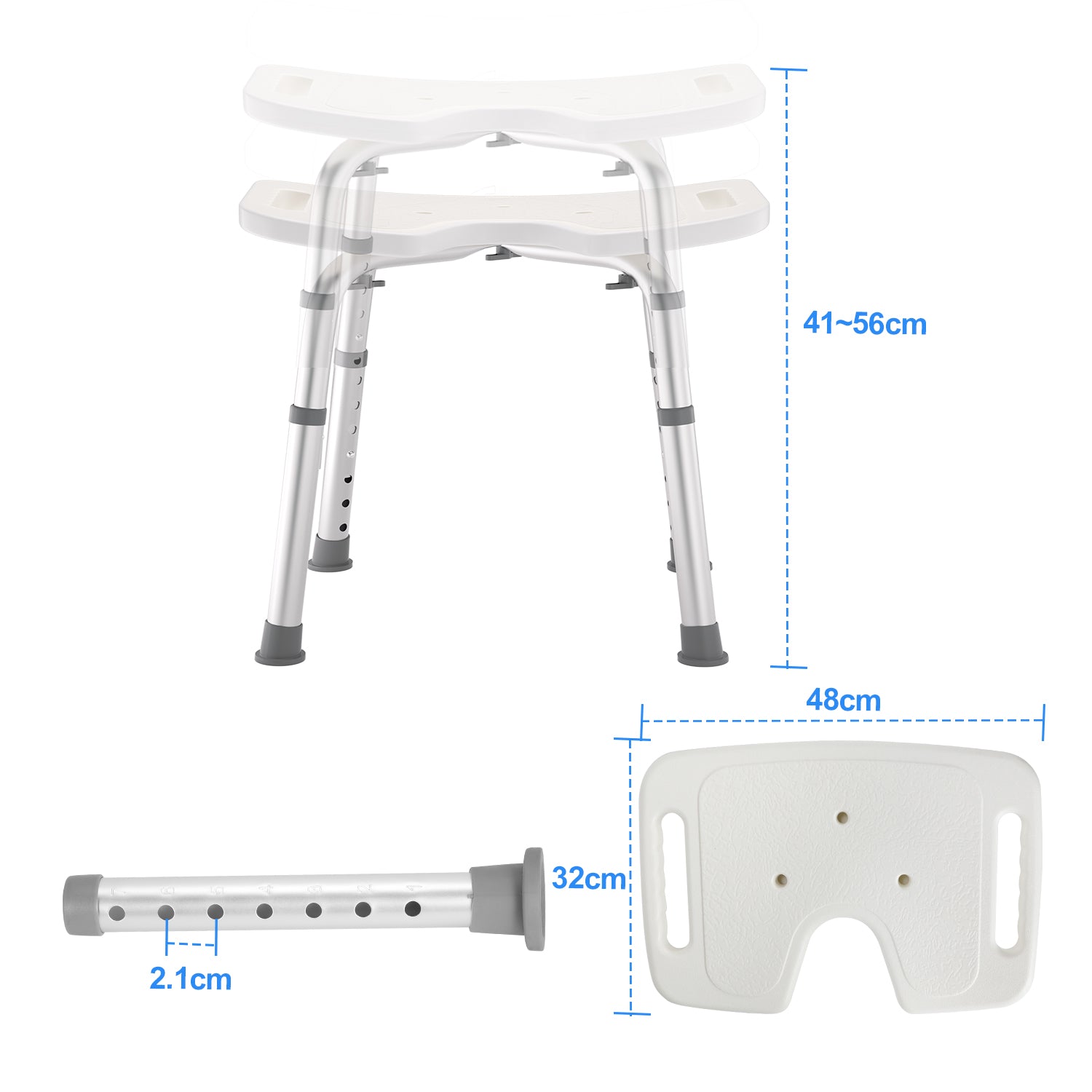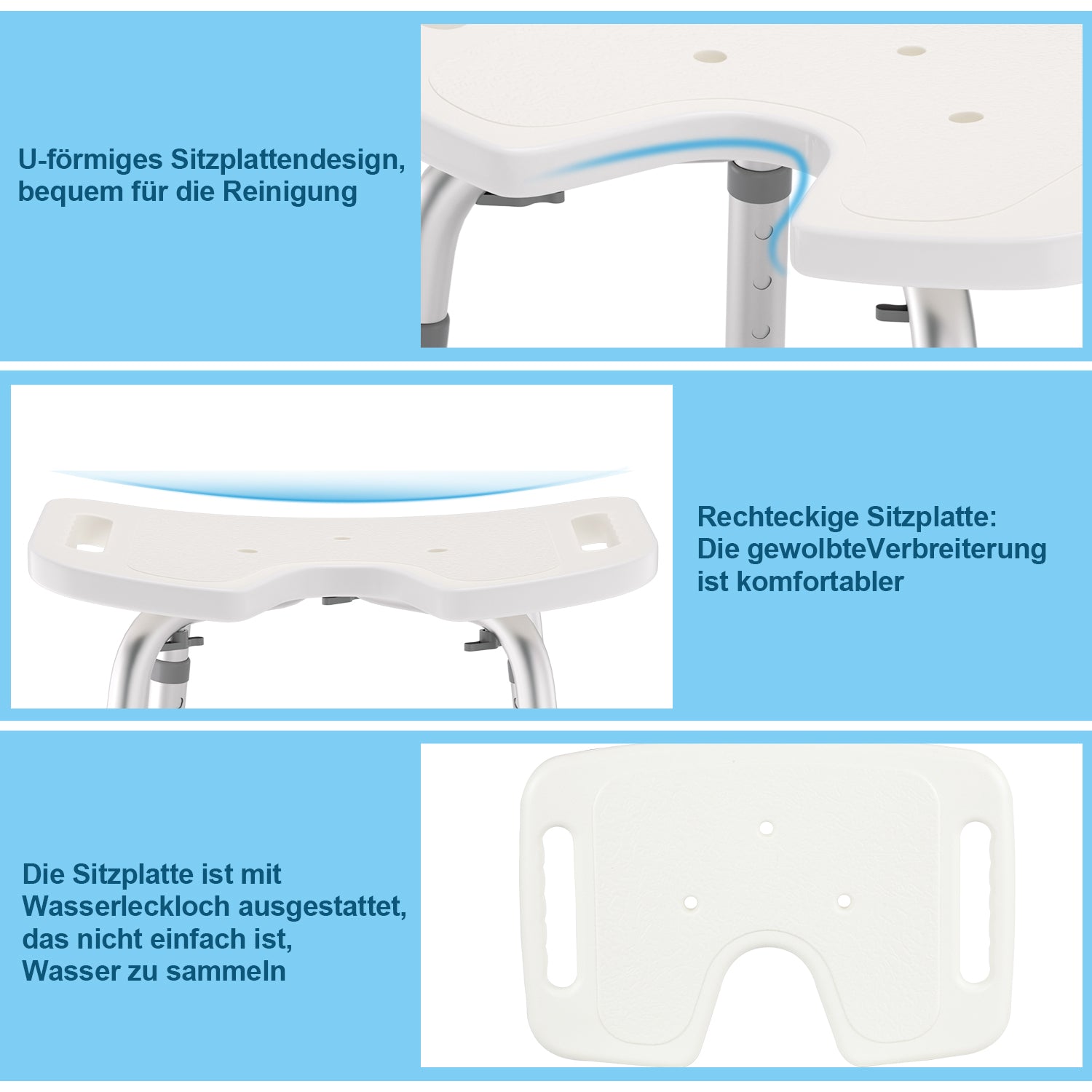 【7 Höhenverstellbar】Die Höhe des Duschstuhls kann von 41-56cm eingestellt werden, geeignet für ältere Menschen, Senioren, Erwachsene, Behinderte und schwangere Frauen. U-förmiges Design der Sitzplatte für einfache Reinigung.