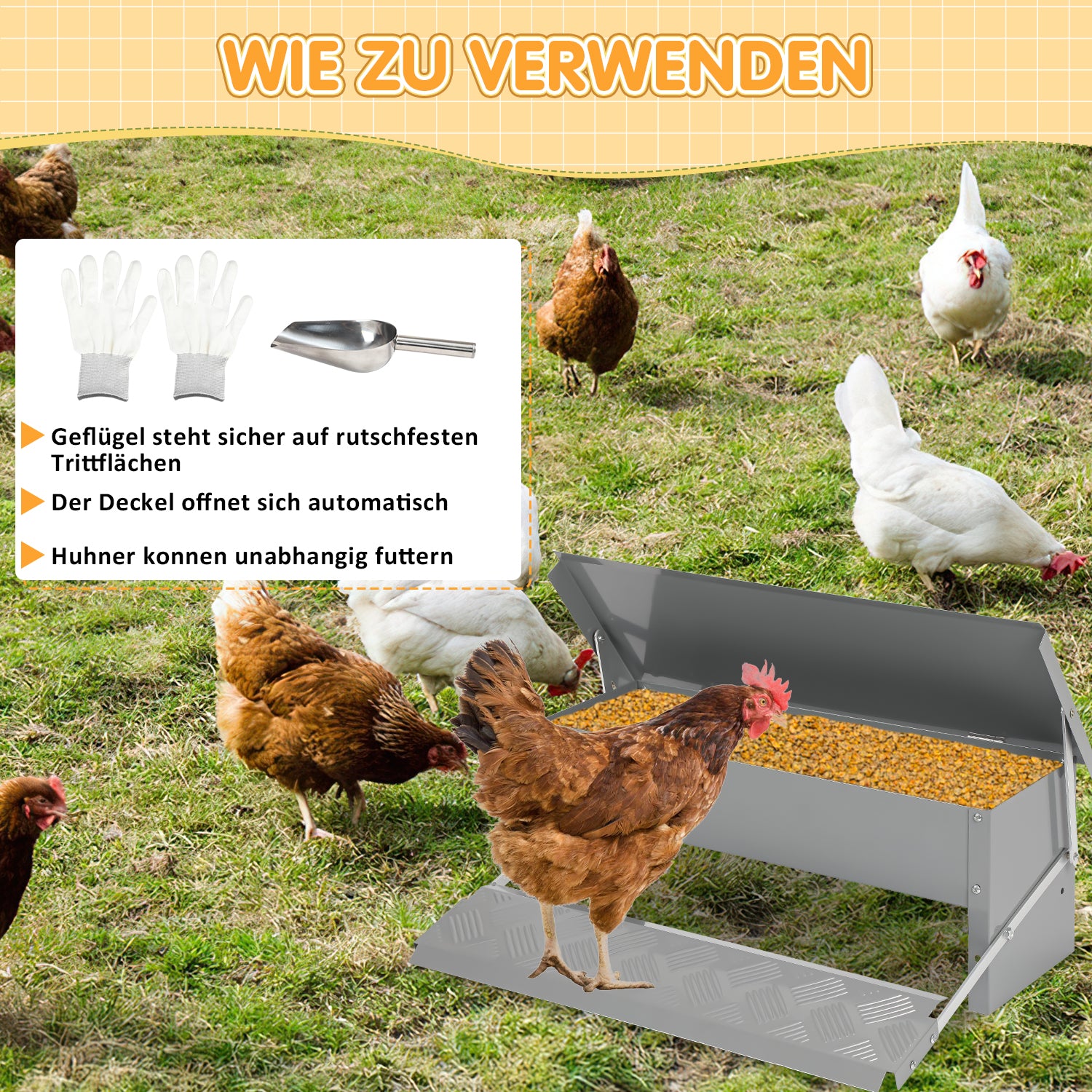🐥 Hygienische Fütterung: Der automatische Futterspender gewährleistet Sauberkeit, indem er Futter nur dann freigibt, wenn das Geflügel aktiv auf das Pedal tritt. So bleibt das Futter geschützt und sauber, während Ihre Tiere in einer gesunden Umgebung gefüttert werden.