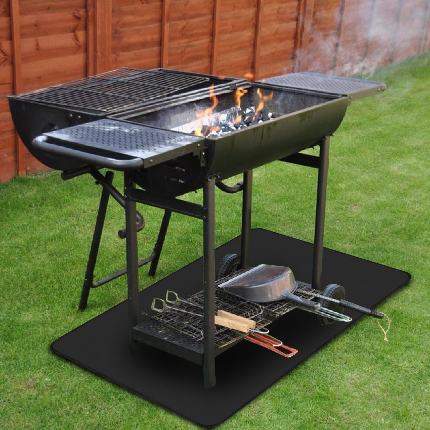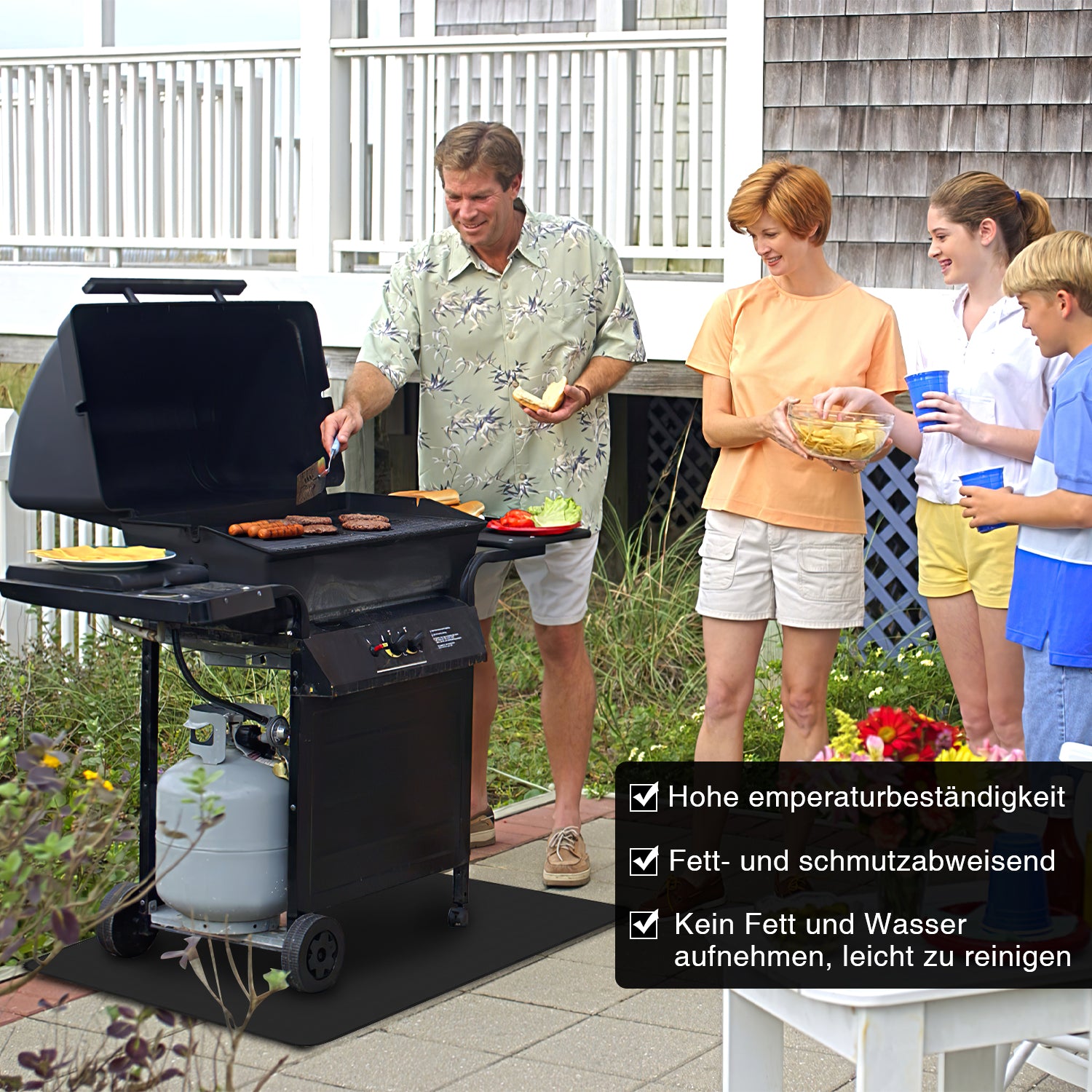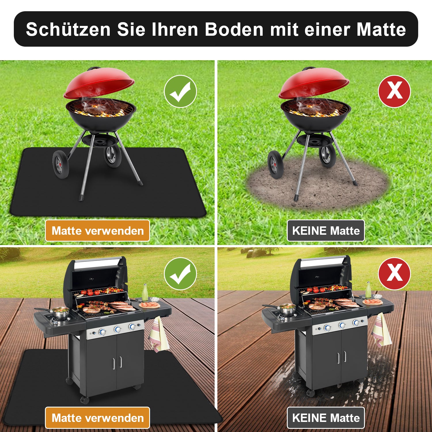 🌱【Rutschfest und Stabil】Die Grillmatte Grillunterlage ist mit einer rutschfesten, gerippten Oberfläche ausgestattet und bietet einen festen Halt, damit Grillgeräte wie Smoker, Kugelgrills oder Elektrogrills nicht mehr verrutschen und der Boden vor Fett, Öl und Brandflecken geschützt wird!