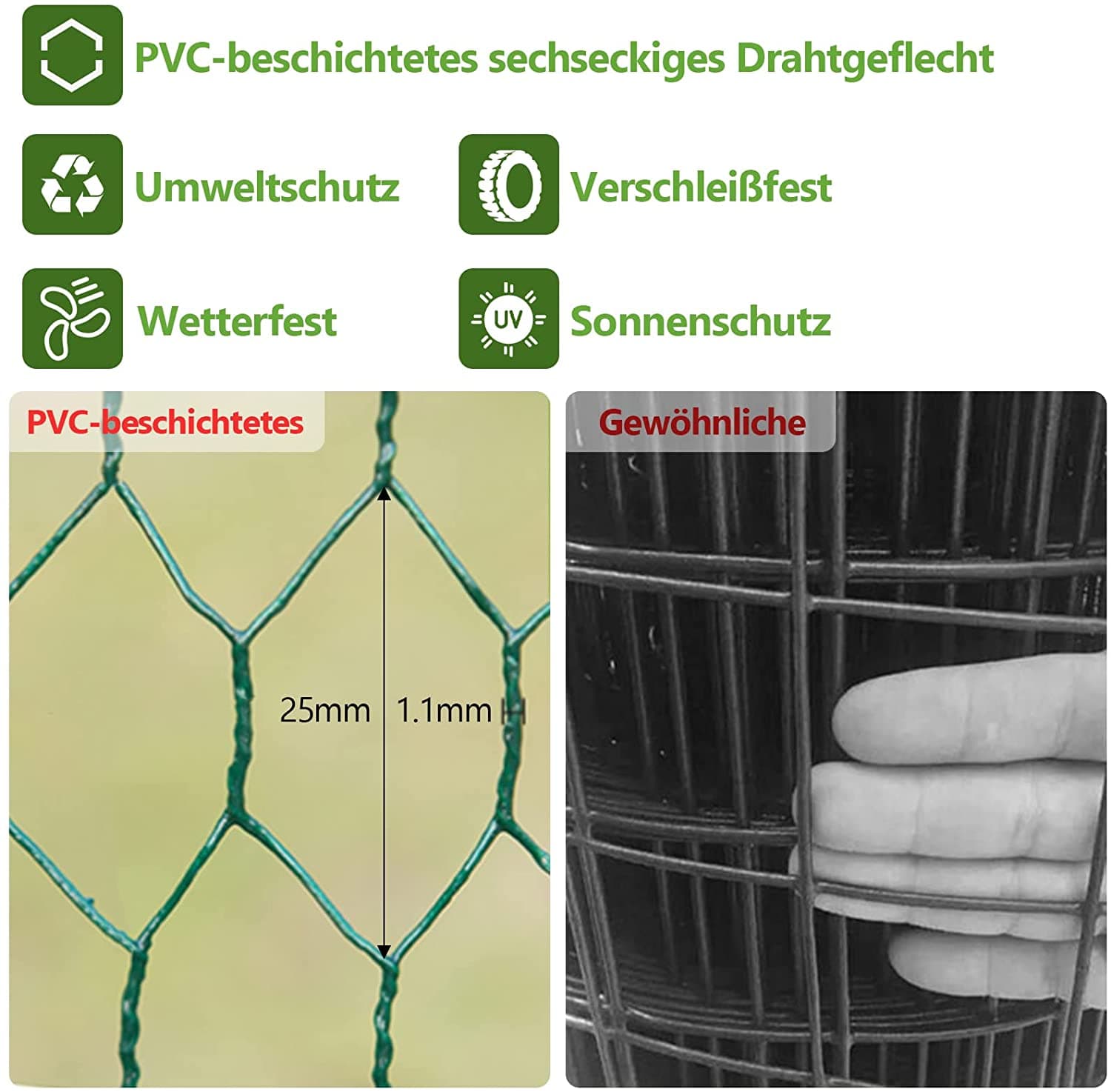 ➣PVC-beschichtetes sechseckiges Drahtgeflecht:Hühnerstall aus PVC beschichtetem sechseckigem Drahtgeflecht, stark und langlebig. Kleine Lücken zwischen den Gittern erhöhen die Sicherheit Ihrer Hühner und schützen sie vor einigen Raubtieren.