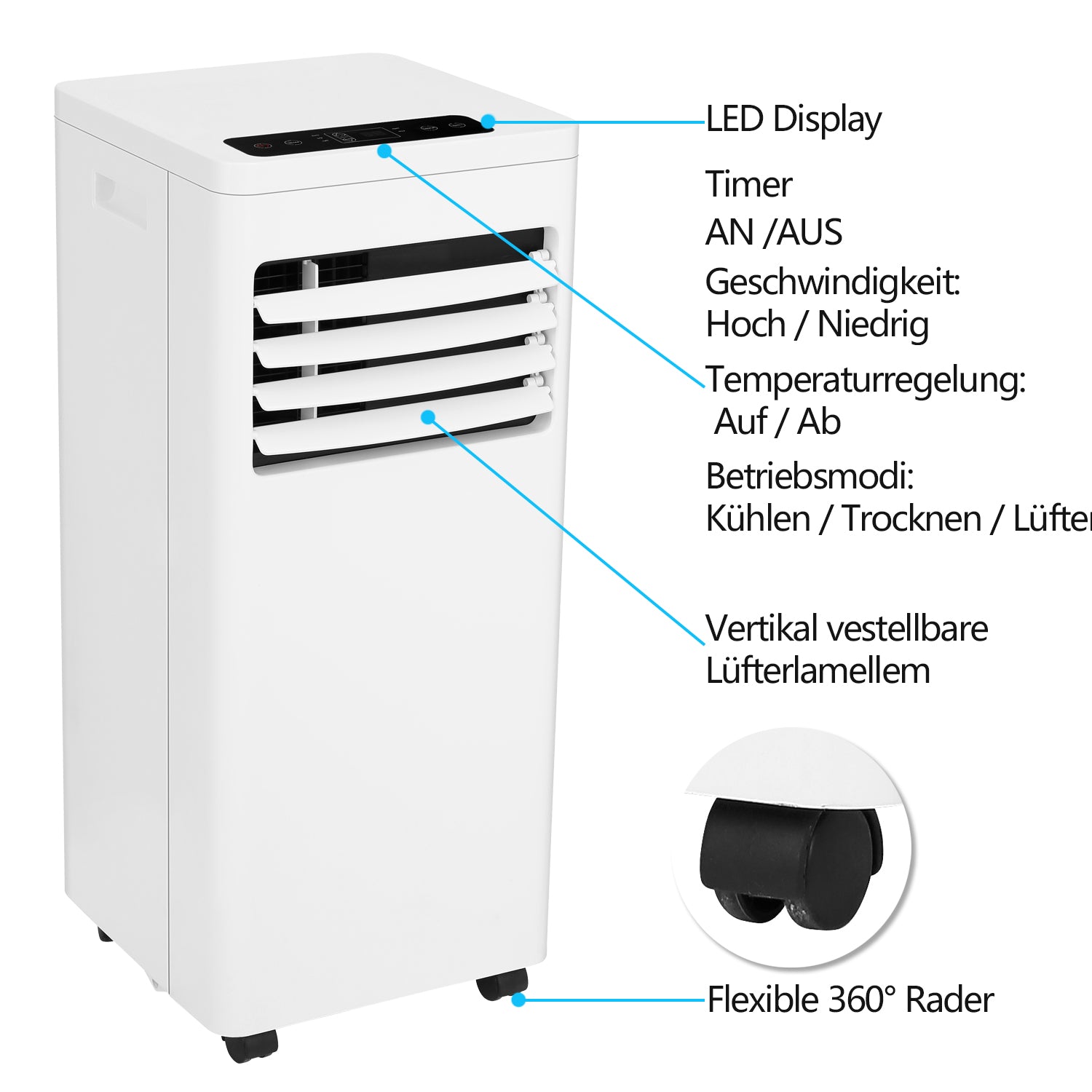 Dank der drehbaren Räder kann diese mobile Klimaanlage in jeder Ecke des Hauses geschoben und sofort verwendet werden.