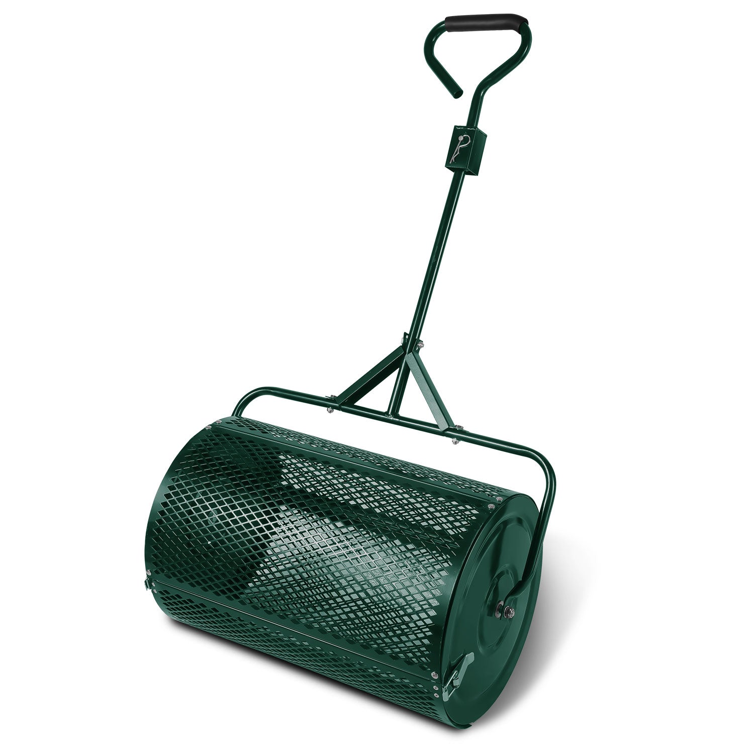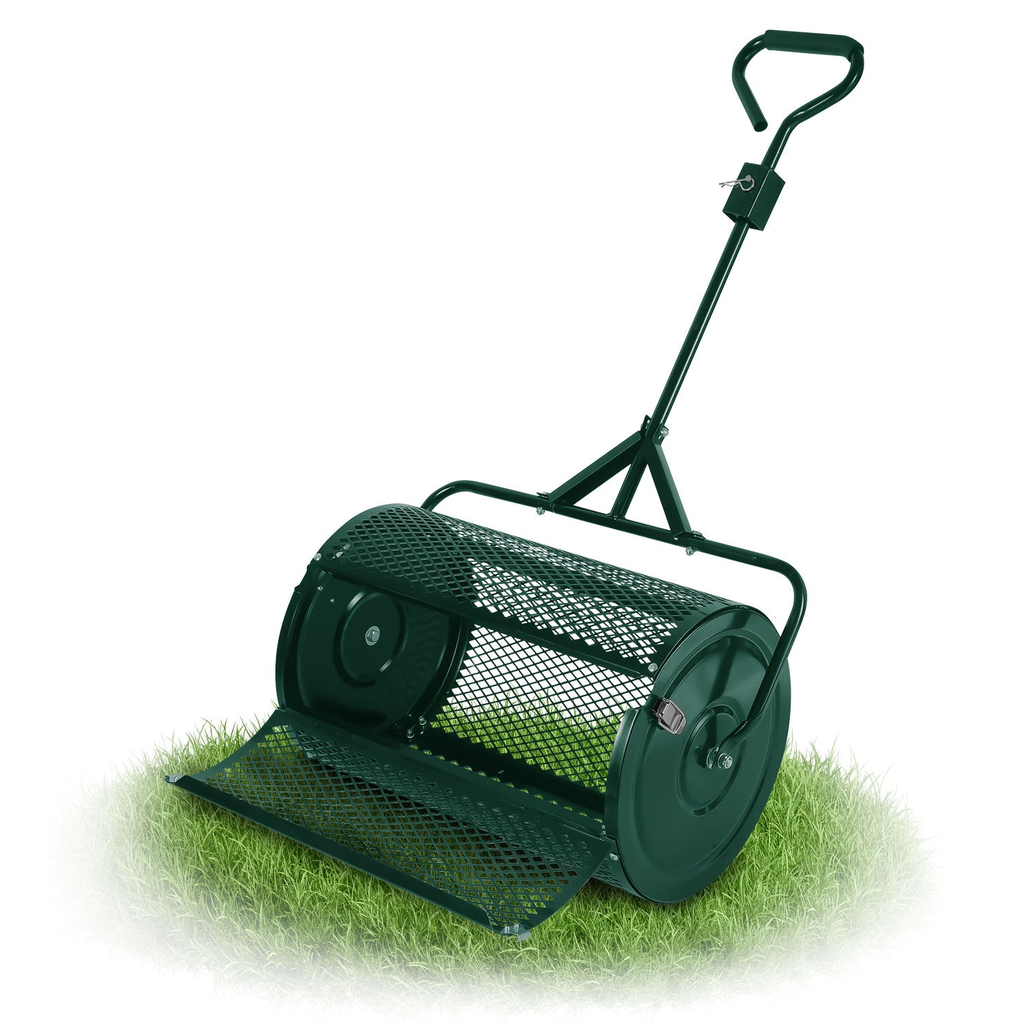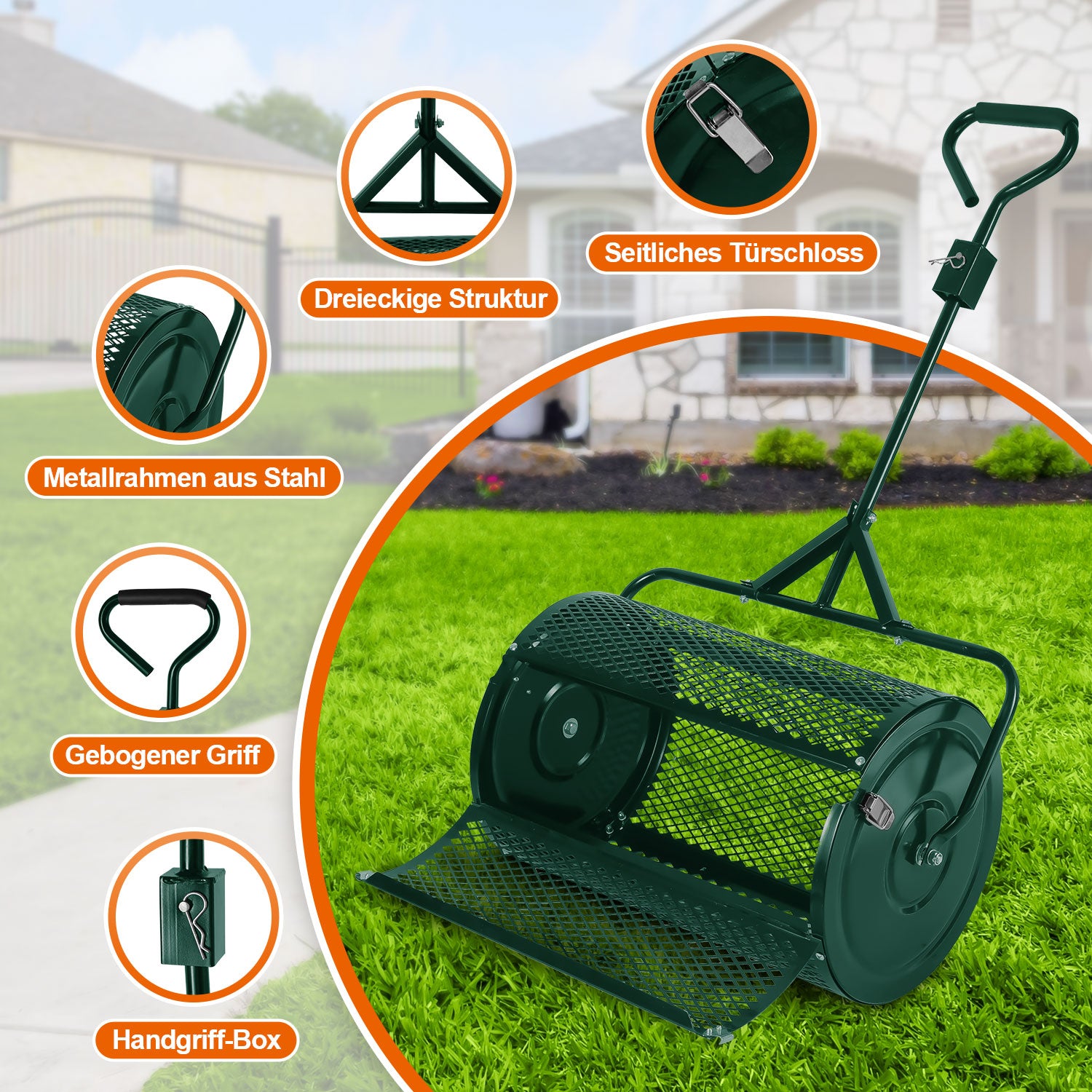 WALZENDESIGN FÜR GLEICHMÄßIGE AUSSAAT: Das einzigartige Walzendesign und die gleichmäßige Maschenstruktur helfen dem Kompoststreuer, Saatgut und Dünger gleichmäßig zu verteilen, und gleichzeitig kann er größere Partikel effektiv trennen, um ungleichmäßige Aussaat zu vermeiden.