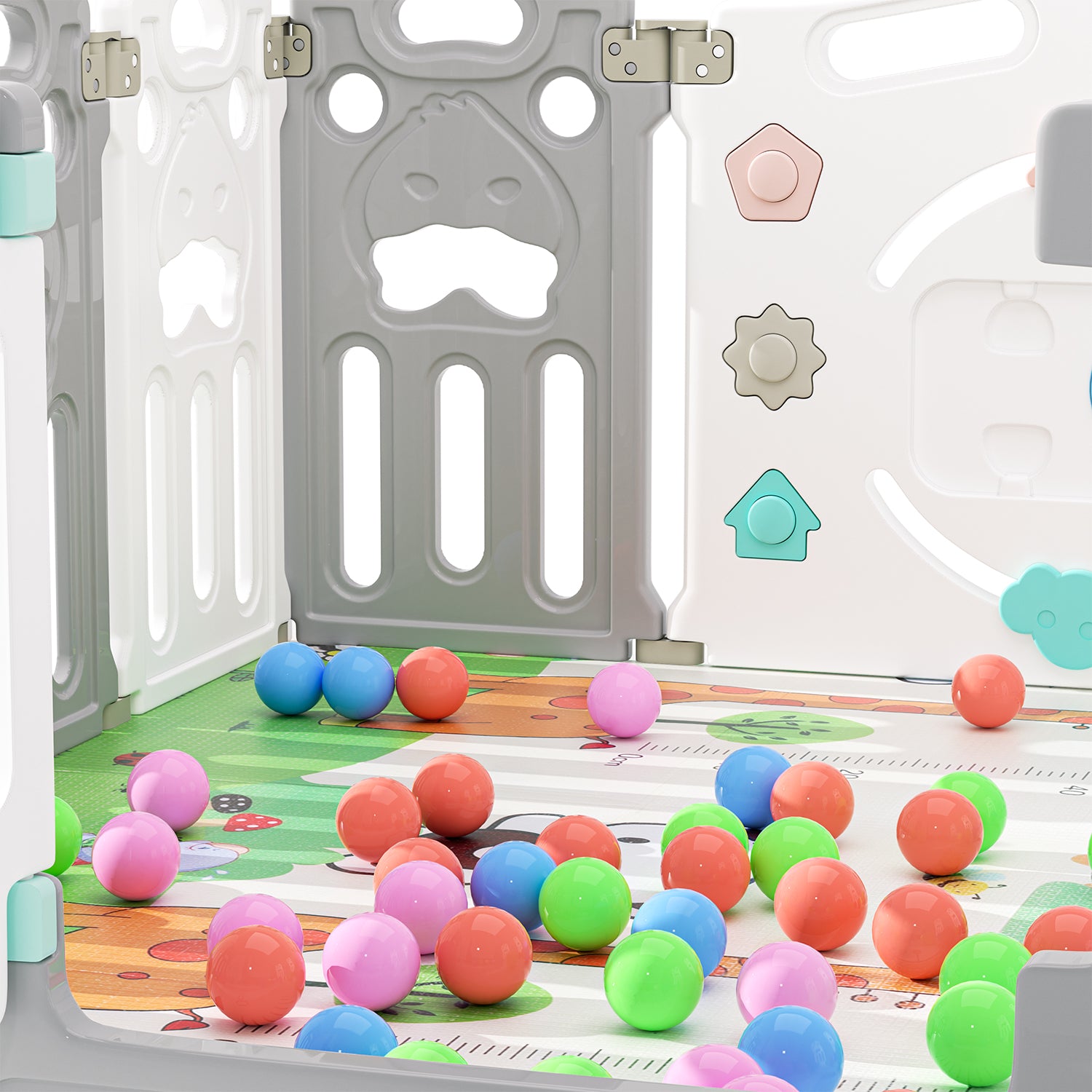 👼【Türverkleidung und Spielpanel】Das Spielpanel enthält rotierende Bälle und einen Soundknopf für zusätzlichen Spaß.Zusätzlich verfügt der Zaun über eine weiche, gepolsterte Spielmatte, die Ihrem Kind einen sicheren und komfortablen Spielbereich bietet.