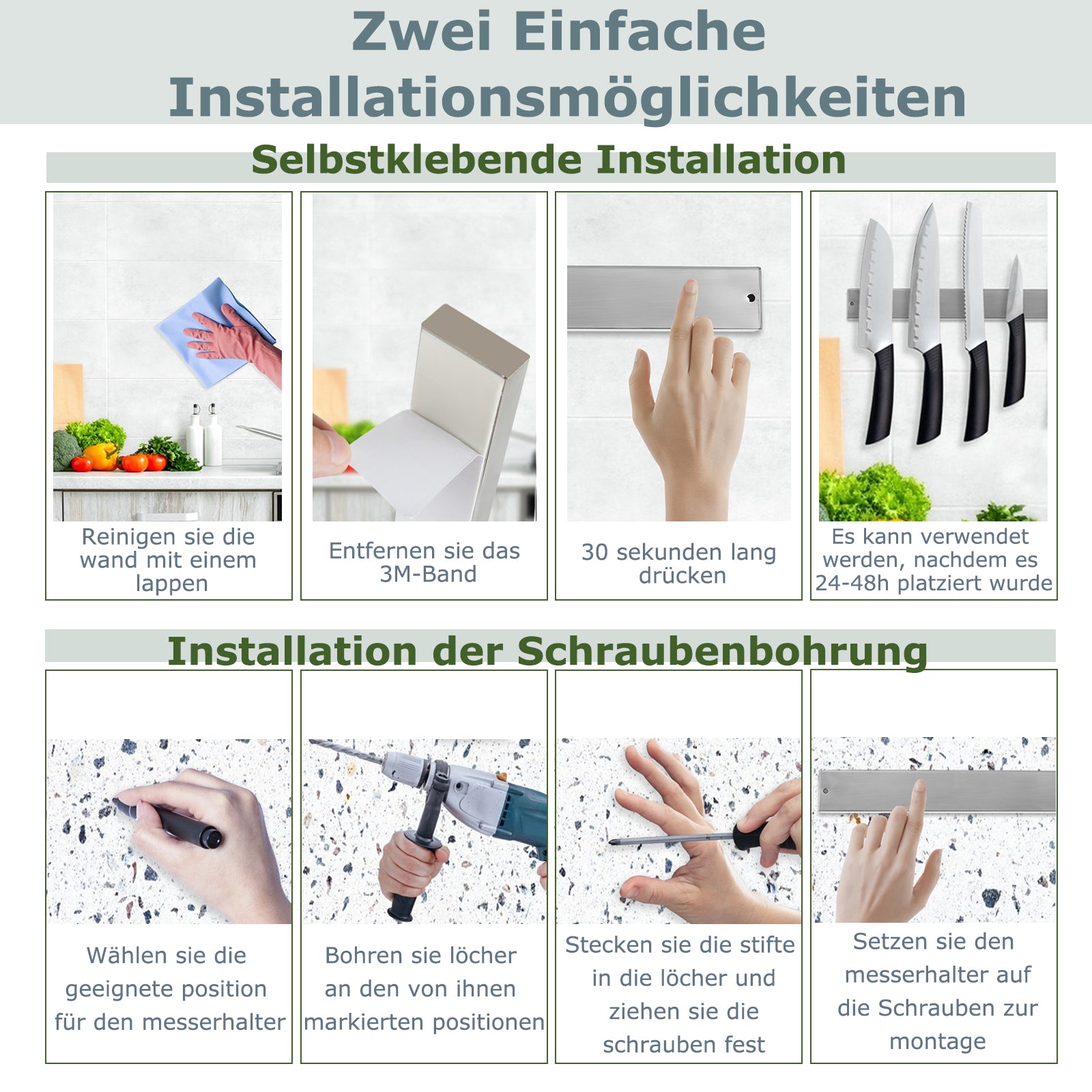 Kleben oder Bohren Installation: Starkes Klebeband (3M) auf der Rückseite, kein Stanzen erforderlich. Einfach zu installieren und einfach zu bedienen. (Tipps: Reinigen Sie die Wand vor der Installation mit einem Handtuch. Nach dem Anbringen eines starken Klebebands müssen Sie 24 Stunden stehen, bevor Sie es verwenden können.) Sie können den Messerhalter auch durch Bohren installieren. Unser einfacher magnetischer Messerblock hält Ihre Klingen sicher an der Wand. Die Installation ist einfach, alle Dehnschrauben sind im Lieferumfang enthalten, es werden nur 2 kleine Bohrlöcher benötigt, Sie müssen sich keine Sorgen machen, dass es von der Wand rutscht.