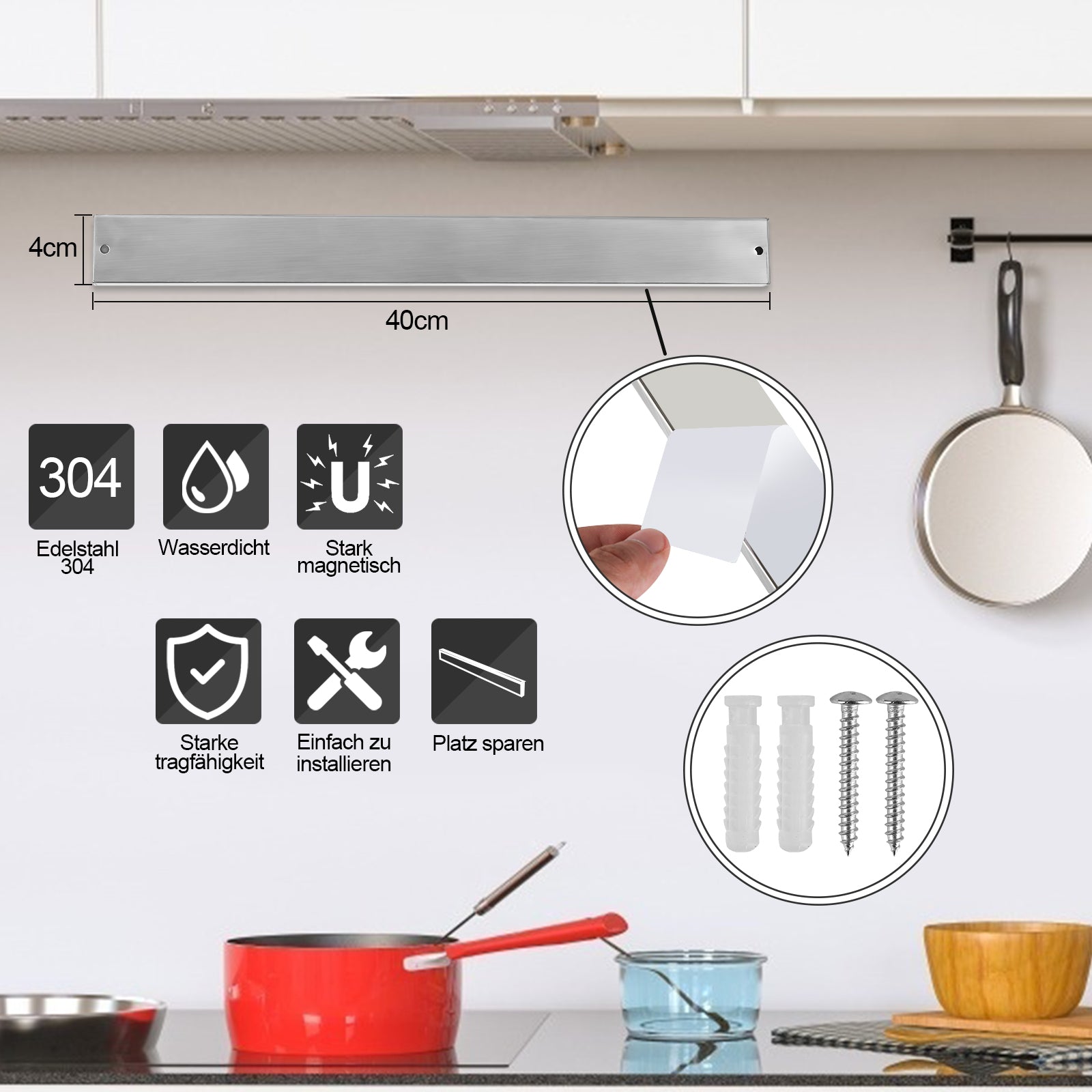 Schlicht und elegant: Unsere Magnetstreifen für Messerhalter sind aus hochwertigem SUS 304 Edelstahl gefertigt, schlichtes, modernes, hochwertiges und strukturiertes Design spart wertvollen Platz auf der Arbeitsplatte und Werkbank und akzentuiert jede Kücheneinrichtung, die Ihre Kücheneinrichtung ergänzt. Dieses Küchenutensil ist eine tolle Möglichkeit, die Messer platzsparend aufzubewahren.