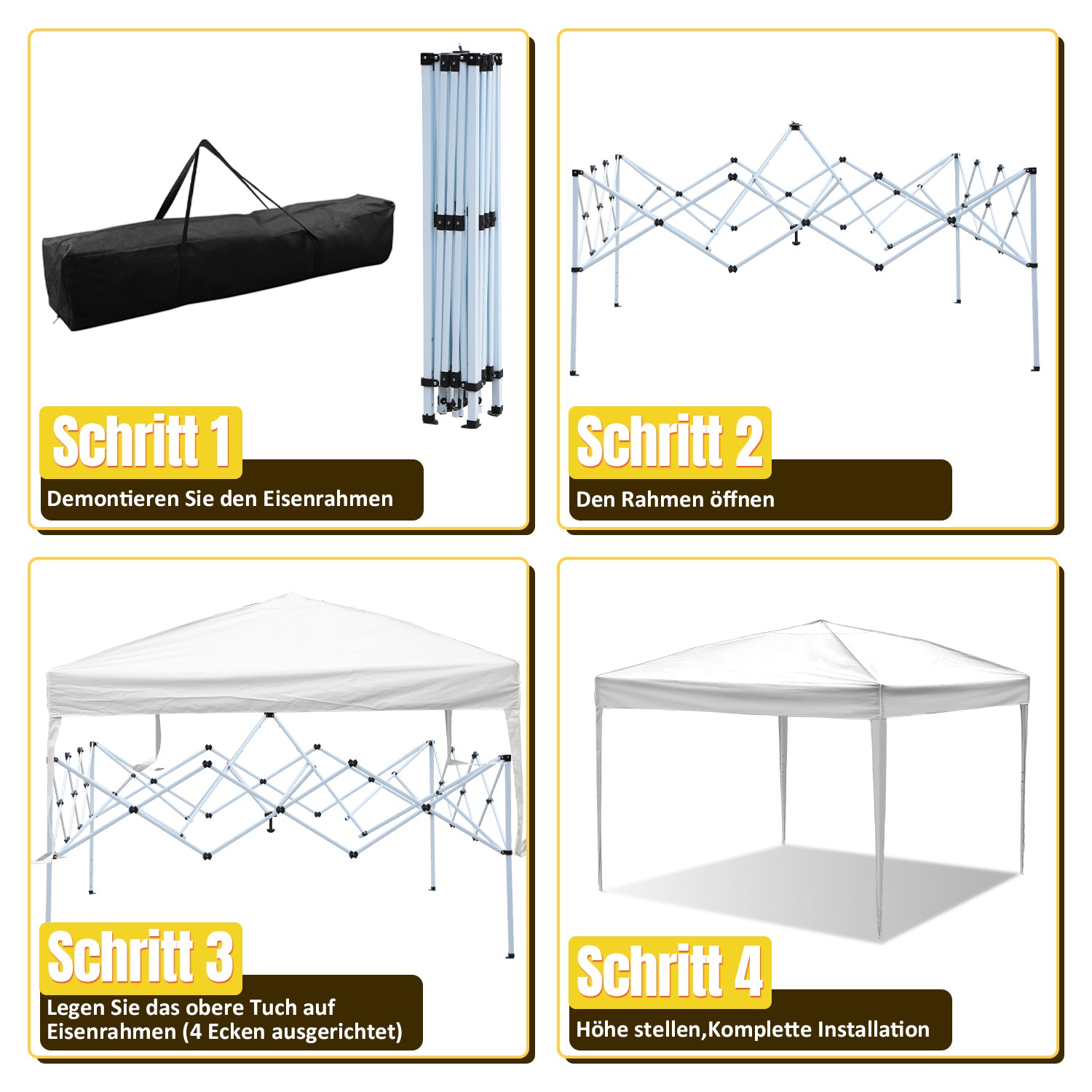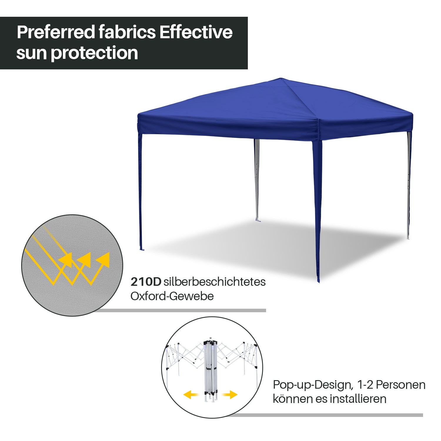 Pop-up-Design: Der faltbare Pavillon nimmt ein Pop-up-Design an, das nur 1-2 Leute ein paar Minuten braucht, um das Zelt zu öffnen und die Installation ohne Werkzeug abzuschließen, was große Bequemlichkeit bietet.