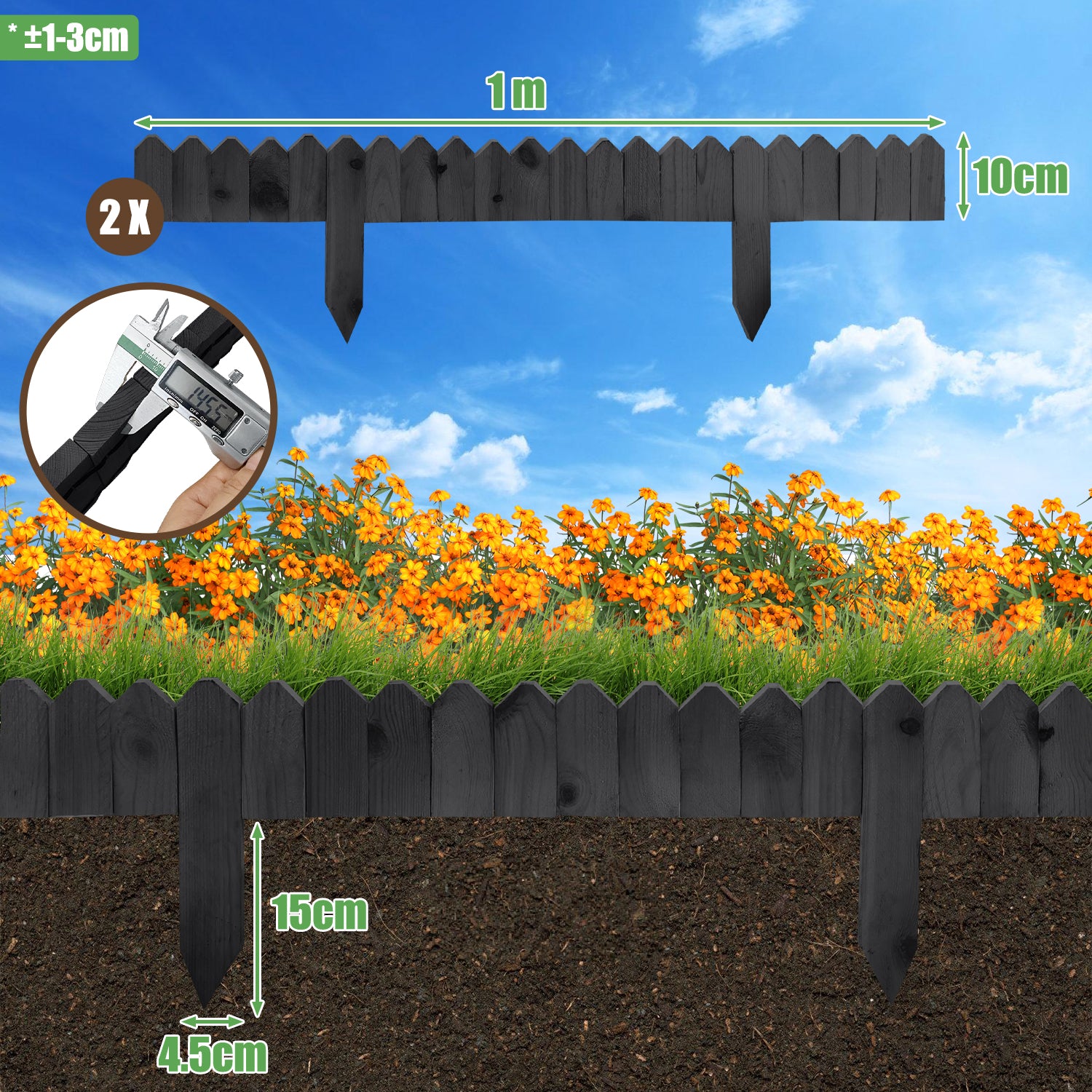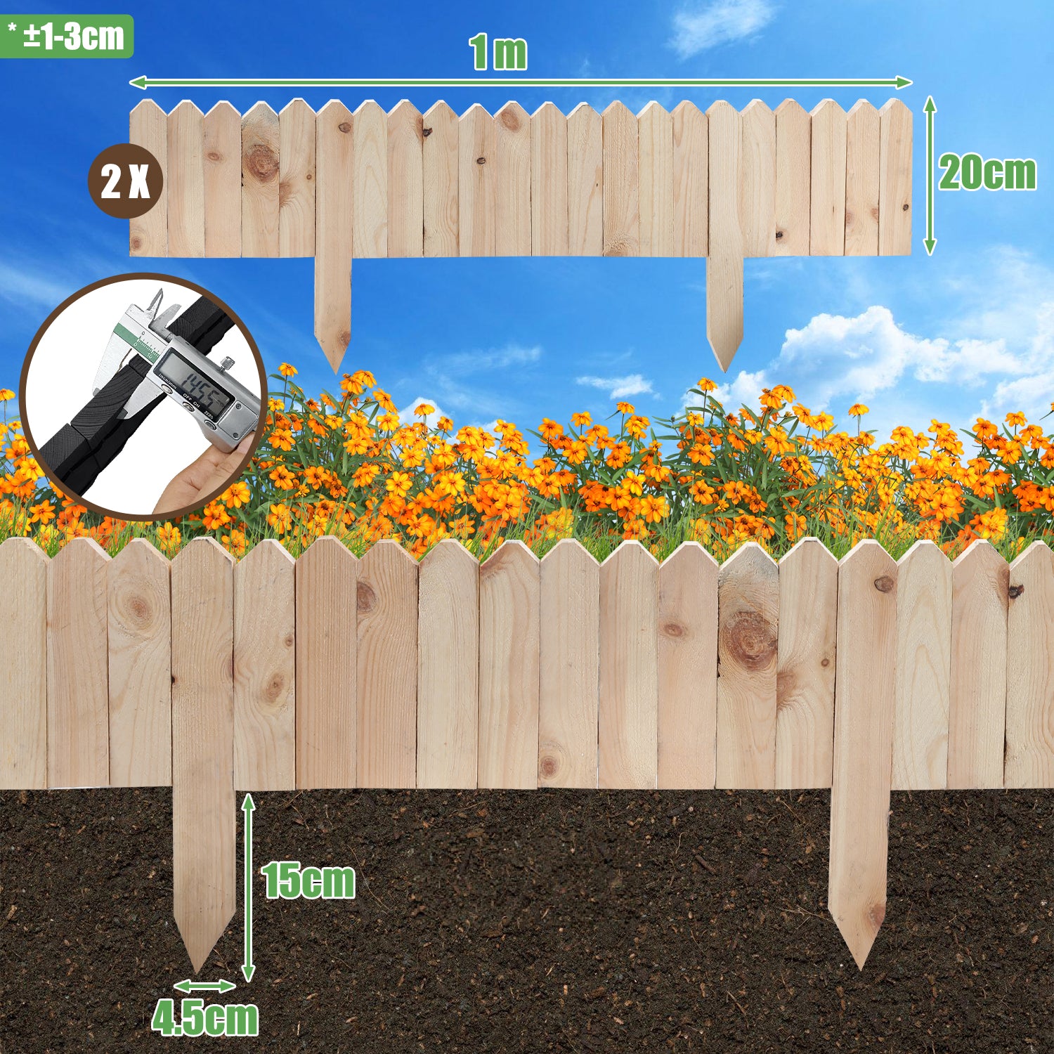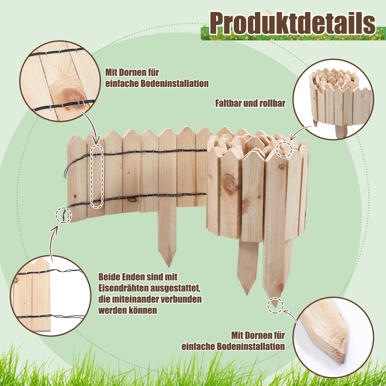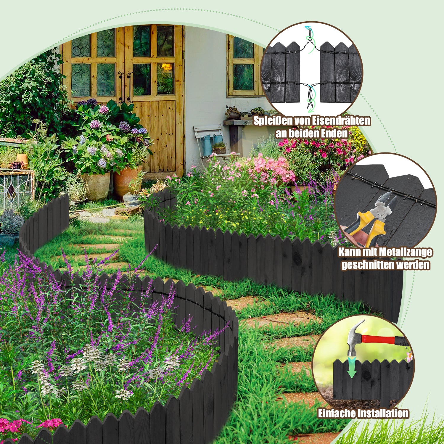 Kundenspezifischer Entwurf: Dieser Zaun bietet flexibles kundenspezifisches Design, und Sie können die Form oder Länge entsprechend Ihren Bedürfnissen anpassen. Wir stellen zwei 100cm Zäune mit Draht an beiden Enden für einfache Verbindung zur Verfügung. Der Verbindungsdraht kann verkürzt werden, um individuelle Anpassungen an das Layout oder spezielle Bedürfnisse des Gartens zu ermöglichen.