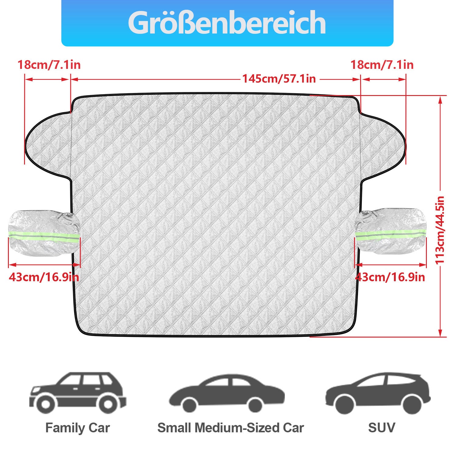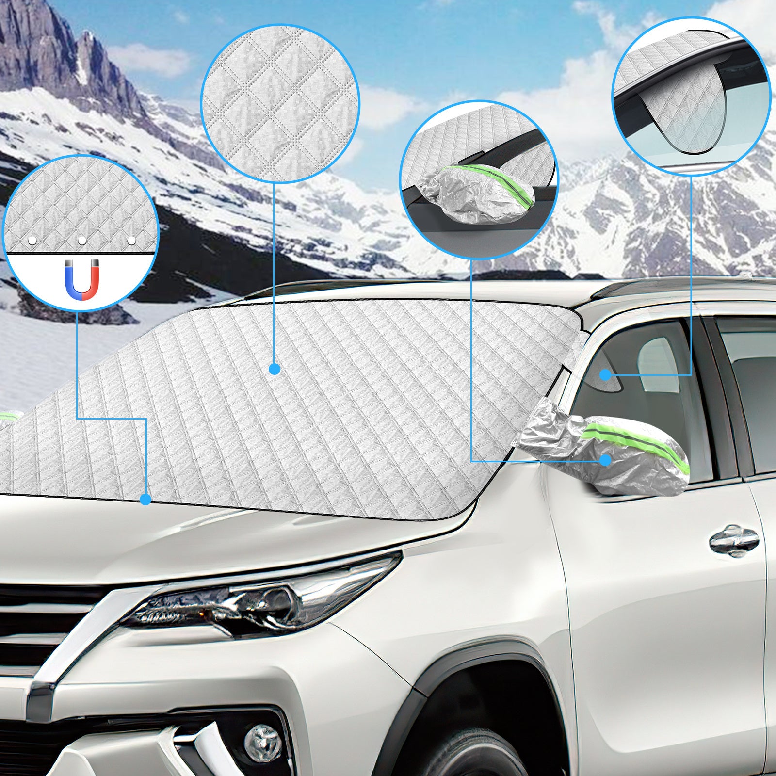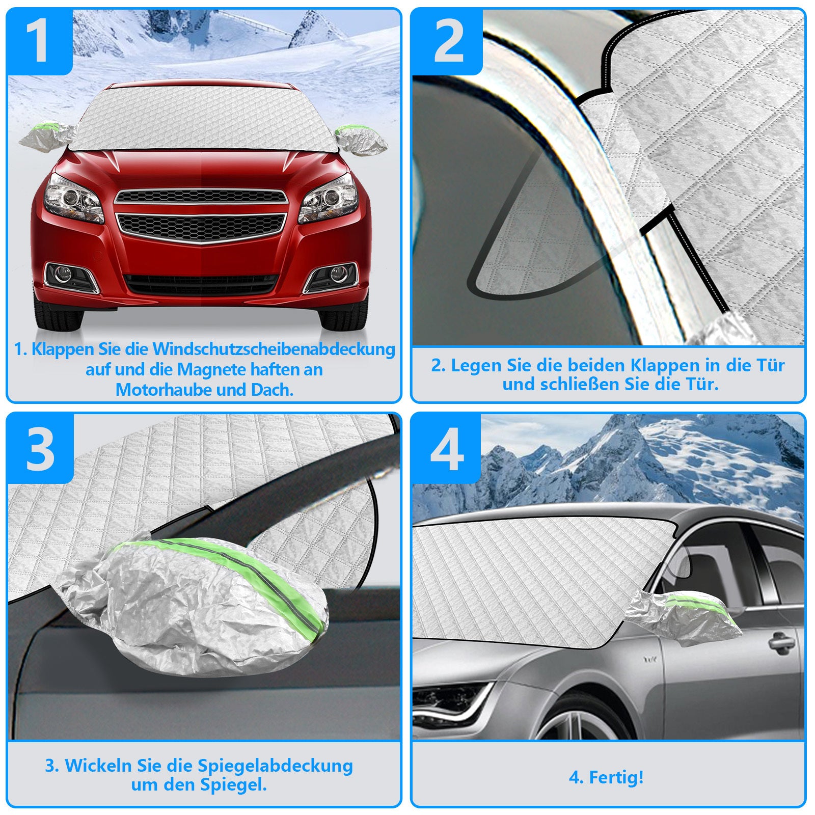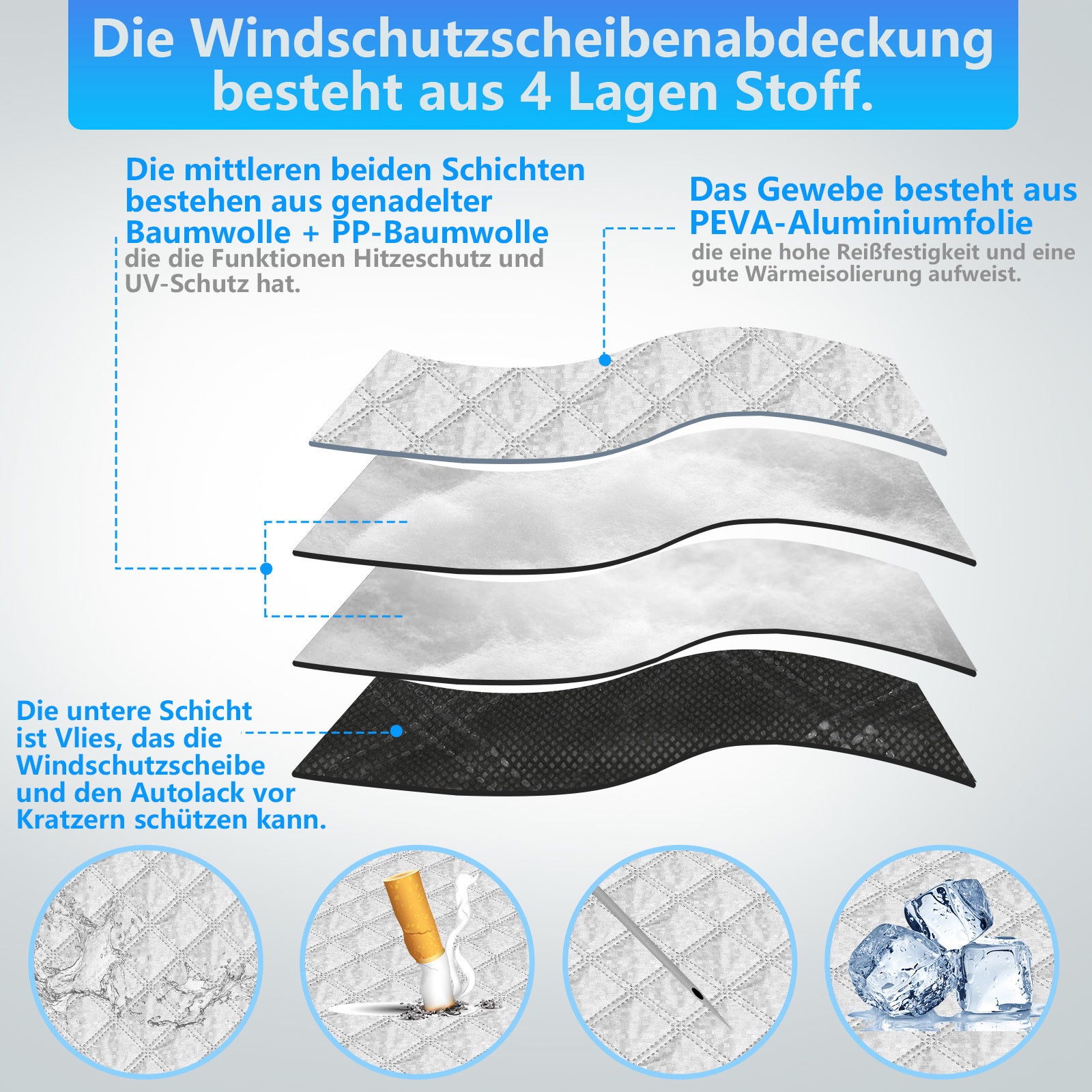4 Materiallagen: Unsere Windschutzscheibenabdeckungen bestehen aus Polsterschichten, Aluminiumfolienschichten, Flockschichten und Vliesstoffen. Extra dickes Material, doppelseitige Aluminiumbeschichtung, hohe Temperatur- und Reißfestigkeit machen unsere Windschutzscheibenabdeckungen langlebiger.