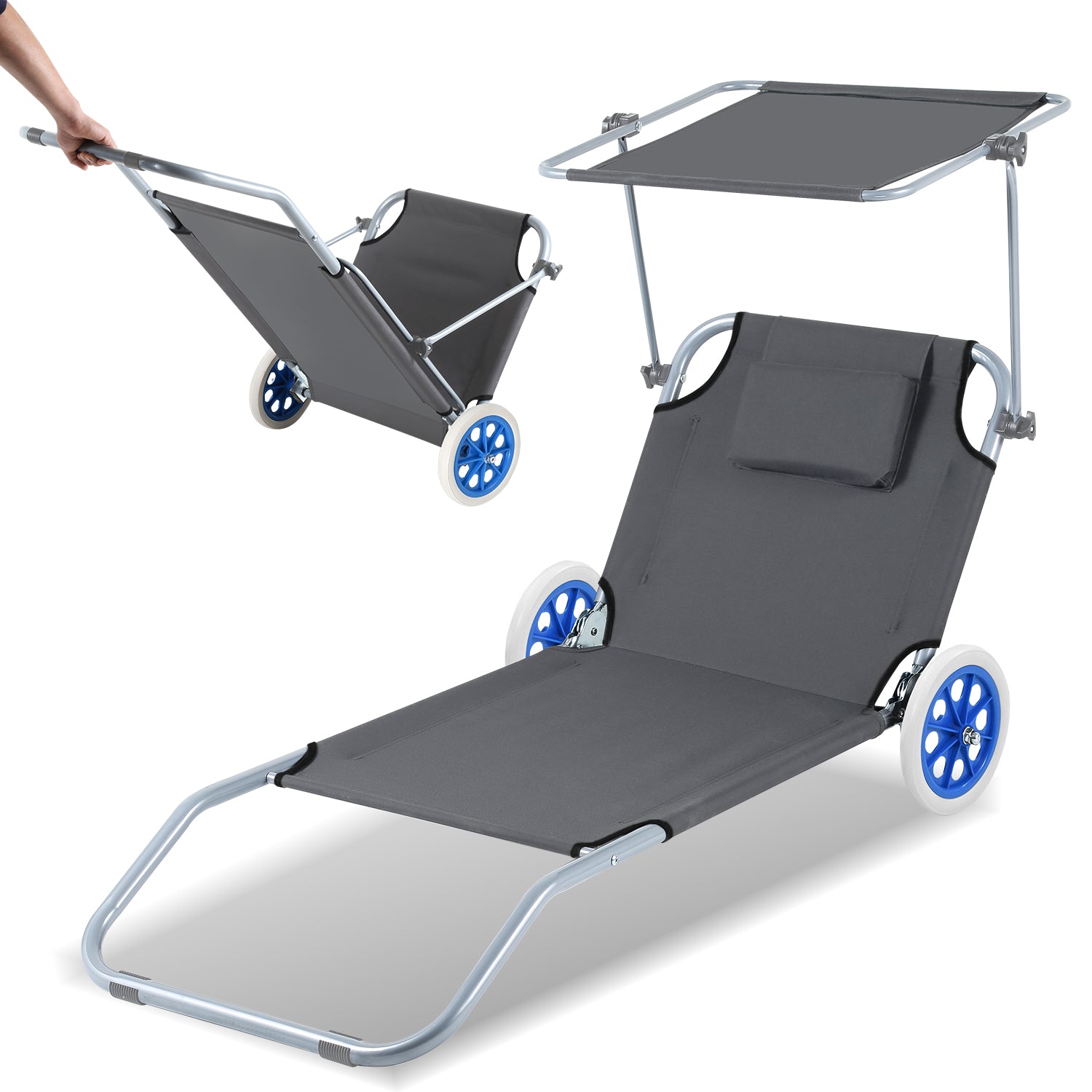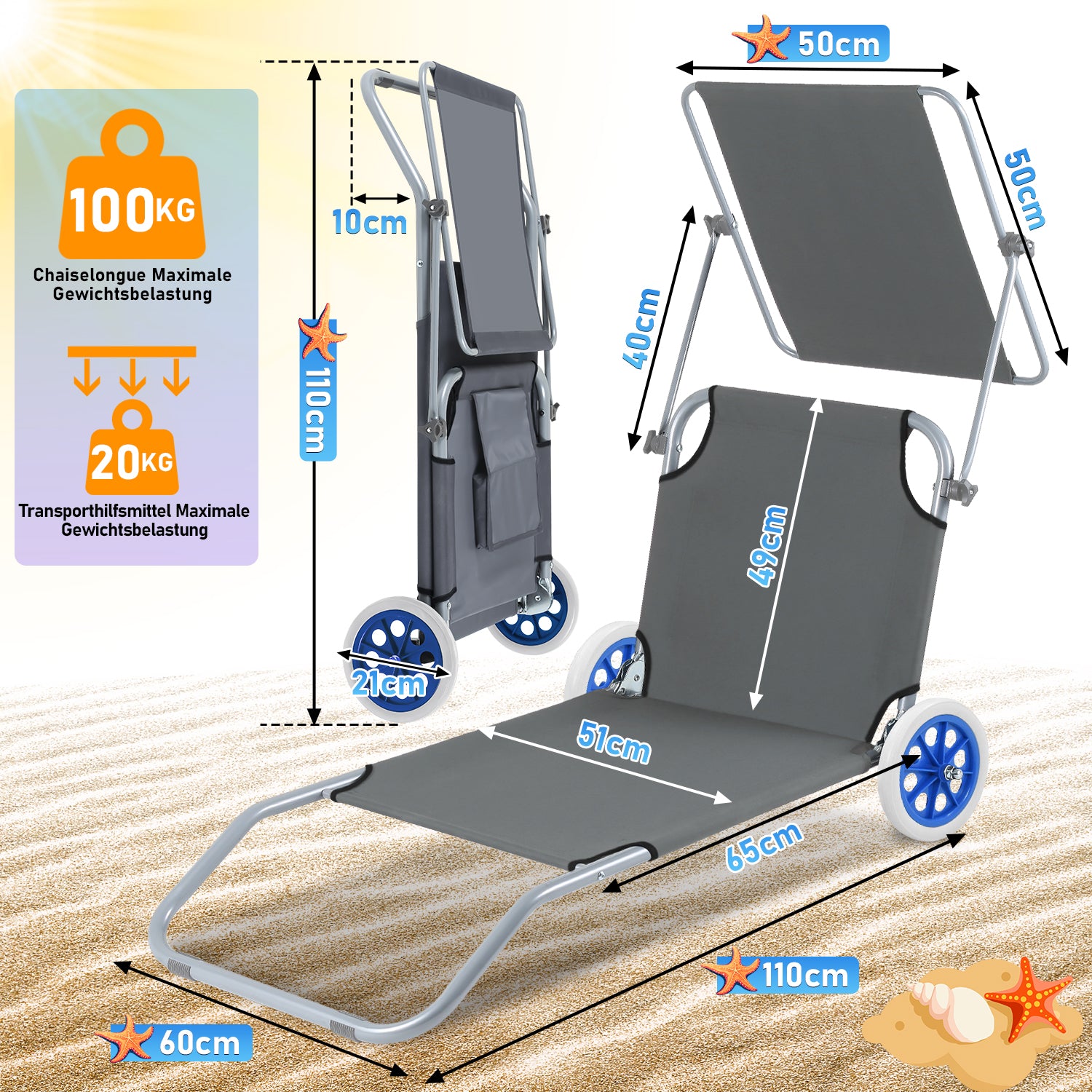 🌞2-in-1 Strandliege: Das faltbare Design spart Stauraum, erleichtert den Transport und die beiden Räder sowie die praktische Funktion eines Handwagens dienen als Transportunterstützung.