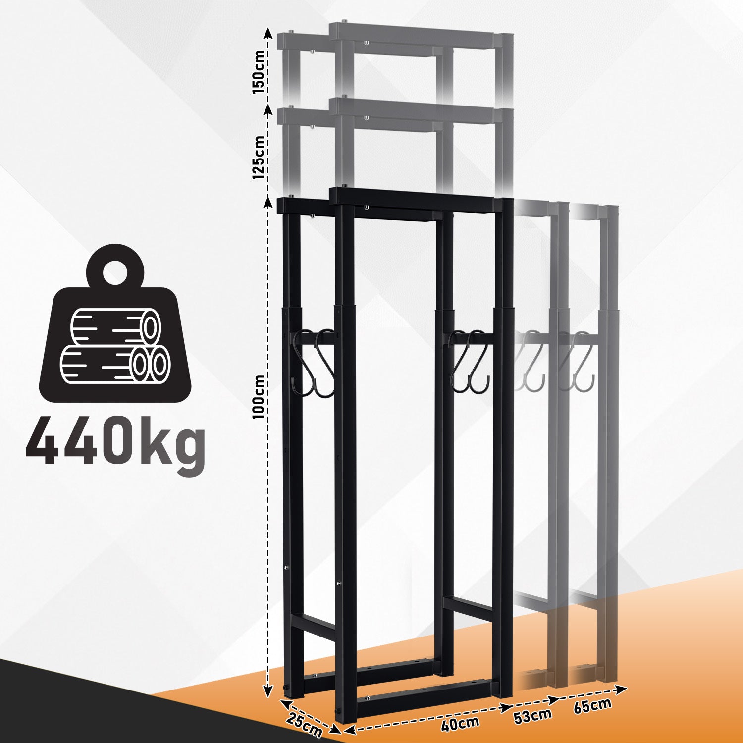 ✅ Robust & Hochbelastbar: Gefertigt aus stabilem Brennholzregal mit schwarzen pulvermetallbeschichteten Rohren – langlebig und trägt 440 kg bei den Maßen Einstellbare Länge: 40/53/65 cm, Einstellbare Höhe: 100/125/150 cm, Feste Breite: 25 cm für einfachen Holztransport.