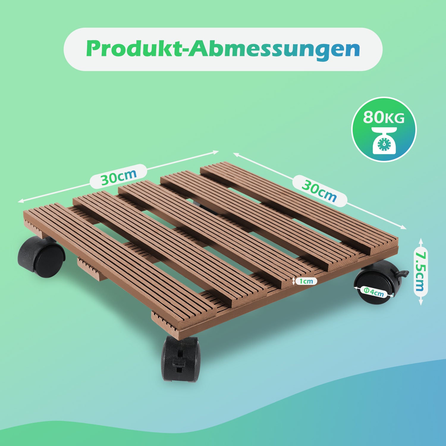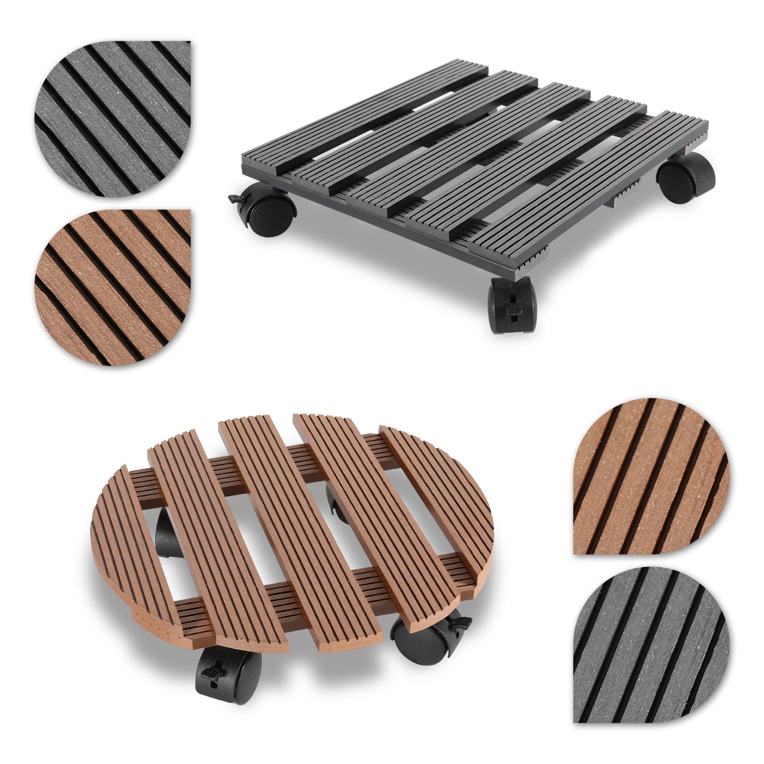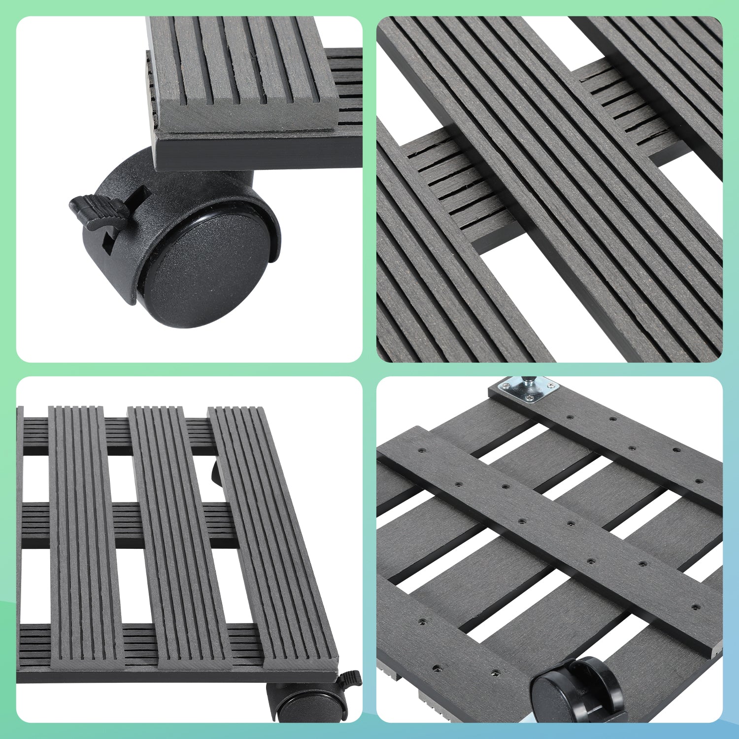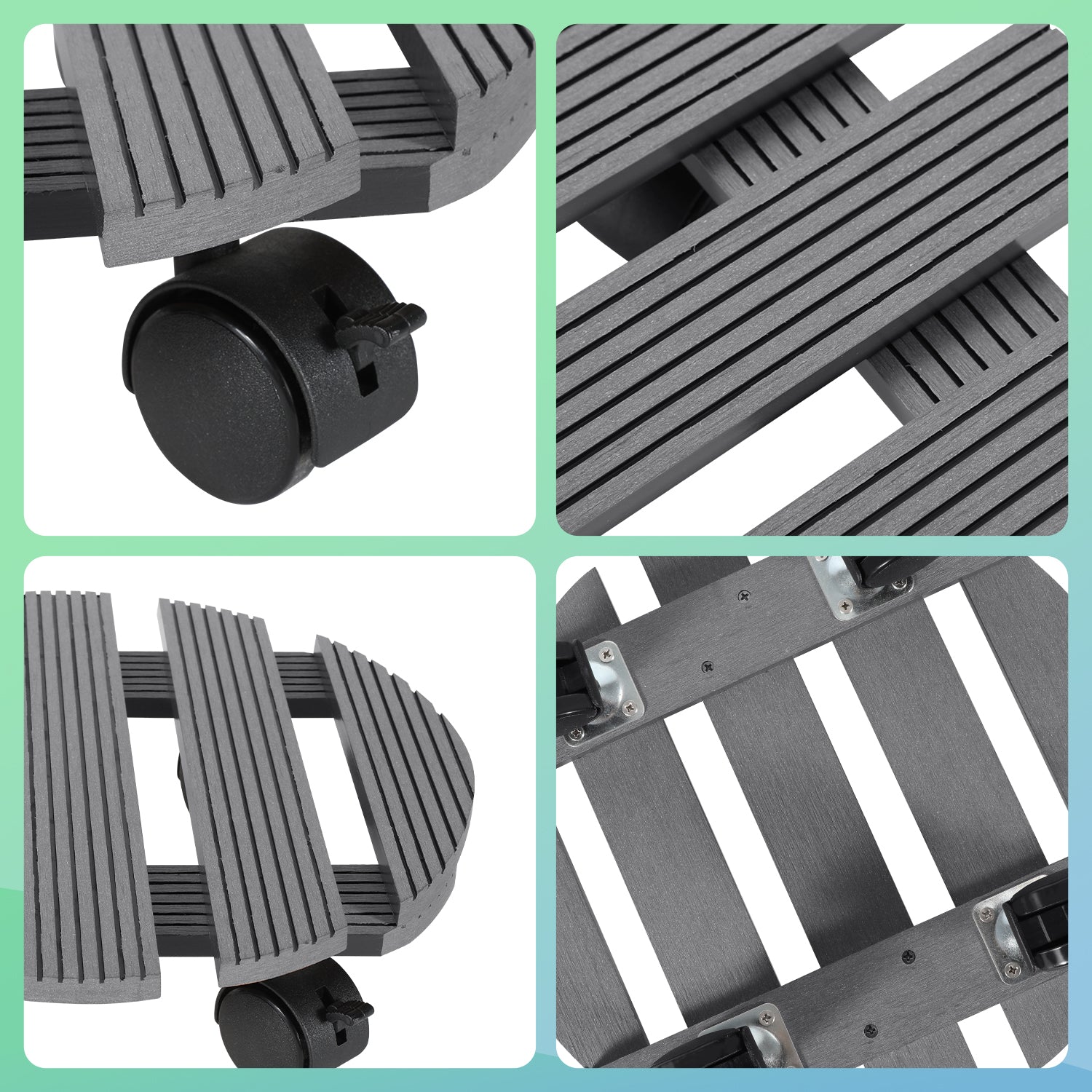 Der Pflanzenroller besteht aus wasserfestem und langlebigem WPC-Material. Die geriffelte Oberfläche sorgt für optimalen Halt ohne zu verrutschen und ist für alle Witterungsbedingungen geeignet.