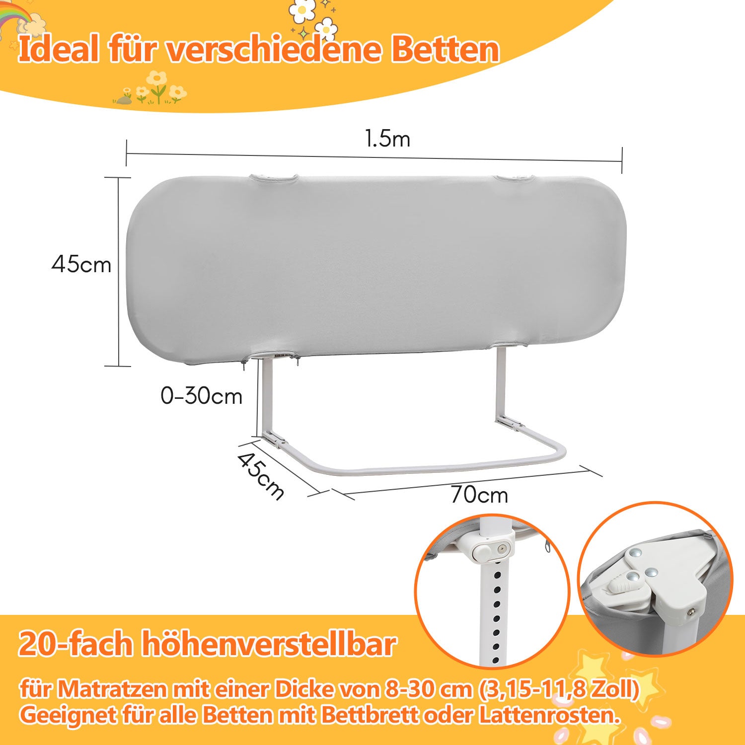 Höhenverstellbar: Die Kinderbettgitter bieten 20 einstellbare Höhenpositionen und sind für Matratzen mit einer Dicke von 8 bis 30 cm geeignet. So passt es sich optimal den unterschiedlichsten Betthöhen an.