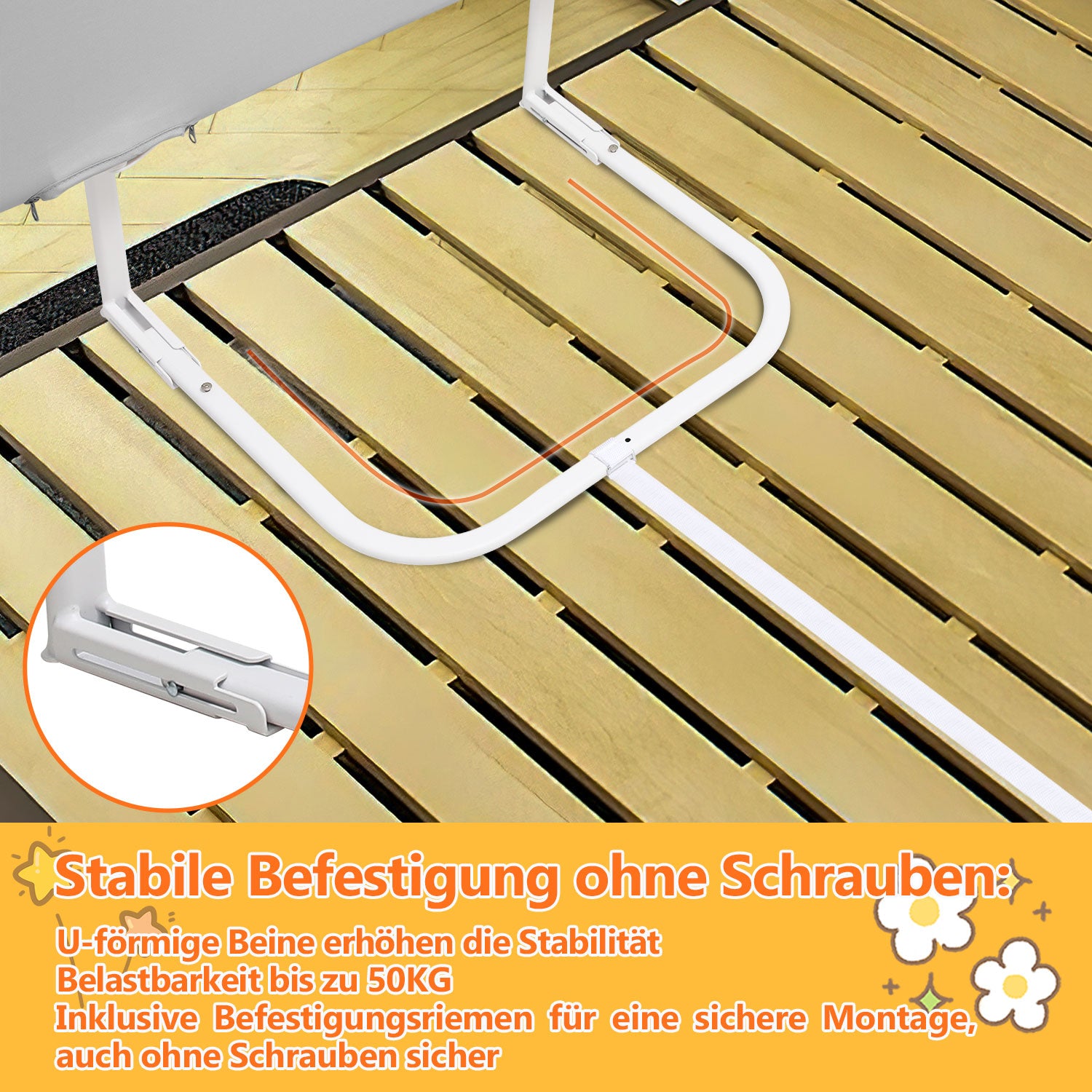 Schnelle Montage: Kein Werkzeug oder aufwendige Installation erforderlich. Einfach das Bettgitter aufklappen, die Basis unter die Matratze schieben und bei Bedarf mit den mitgelieferten Gurten zur zusätzlichen Stabilität fixieren – unkompliziert und zeitsparend.