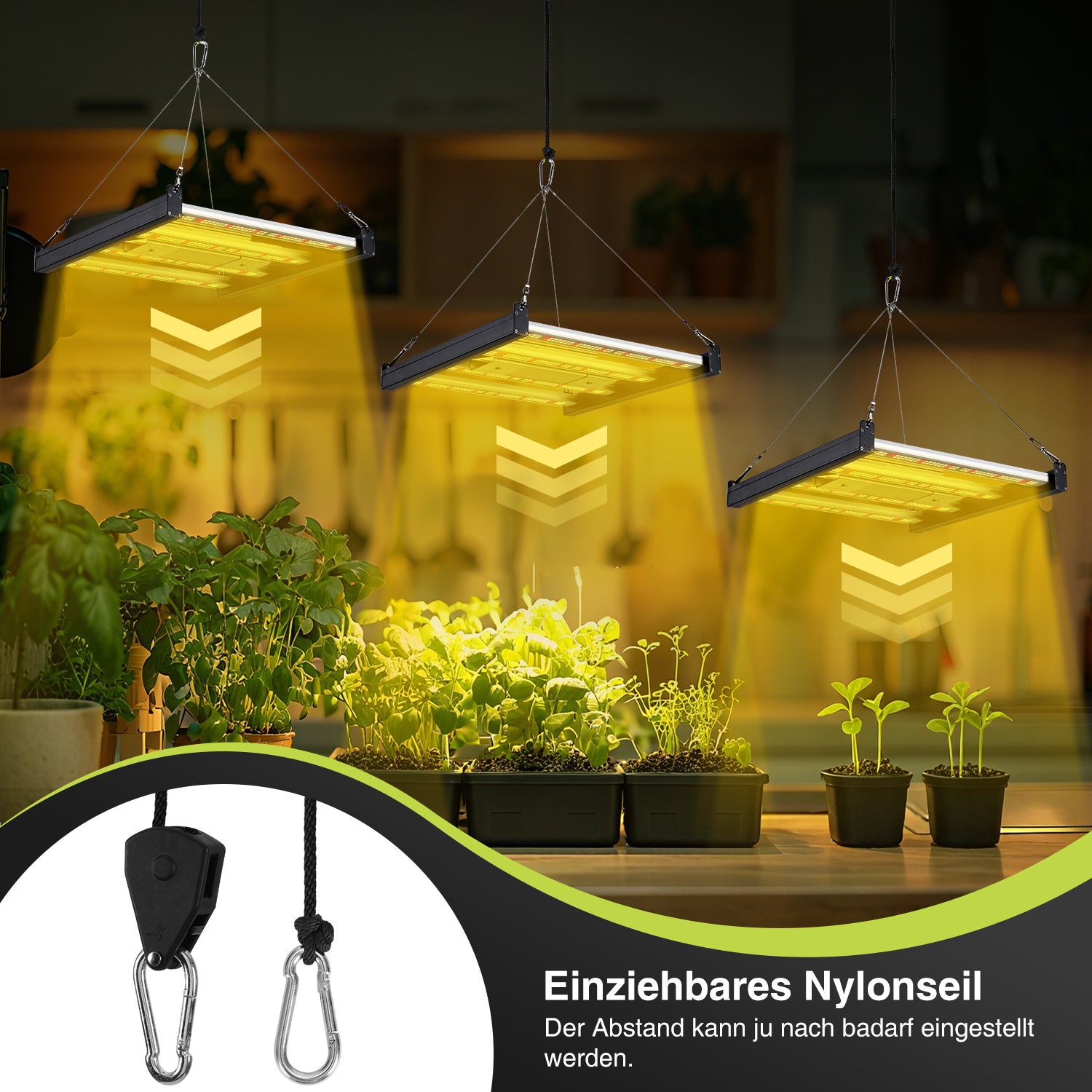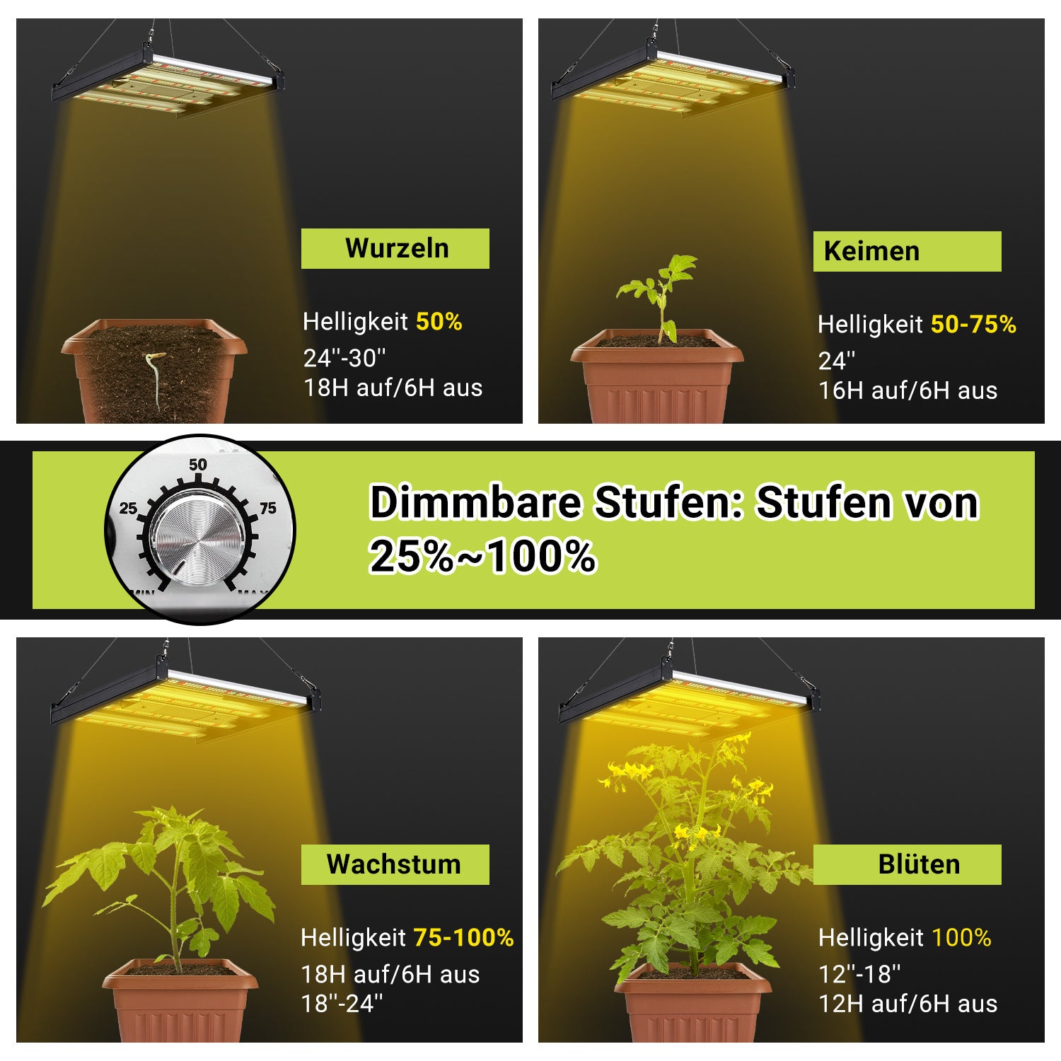 Wachstumslampe Dimmeoptionen: Helligkeit stufenlos (0%/25%/50%/75%/100%) per Drehregler für präzise Lichtsteuerung in jeder Phase. Light Bar und Aluminiummaterial haben einen besseren Luftstrom und eine große Wärmeableitung für niedrigere LED-Temperatur, die längere Nutzungszeit gewährleisten.