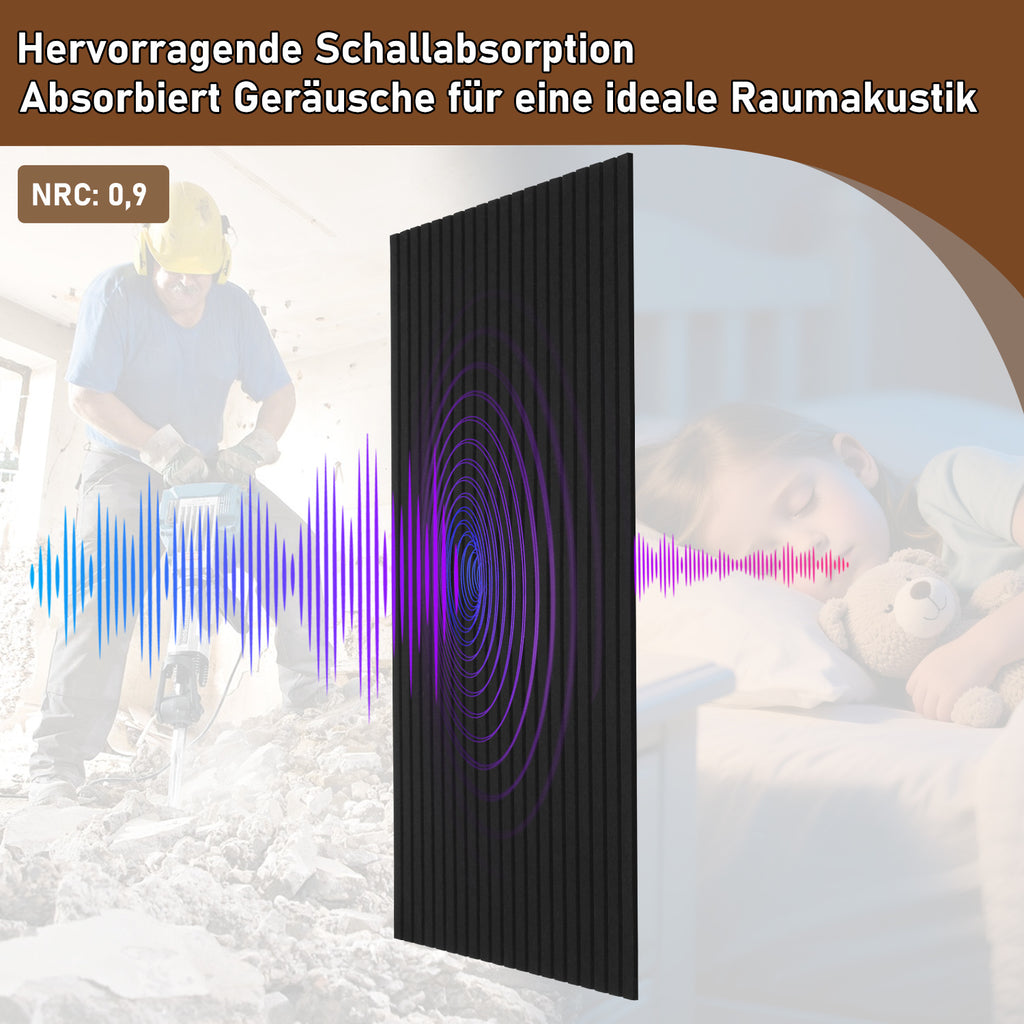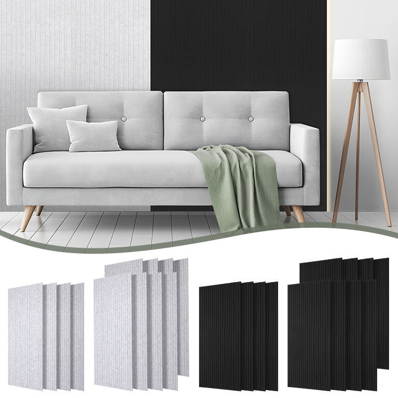 Design für moderne Räume: Mit dezenten Rillen und zwei Trendfarben (Schwarz/Hellgrau) passen sich die Akustikpaneele elegant an Wohnräume, Büros und Studios an. Jedes Wandpaneele deckt 0,72 m² Wandfläche.