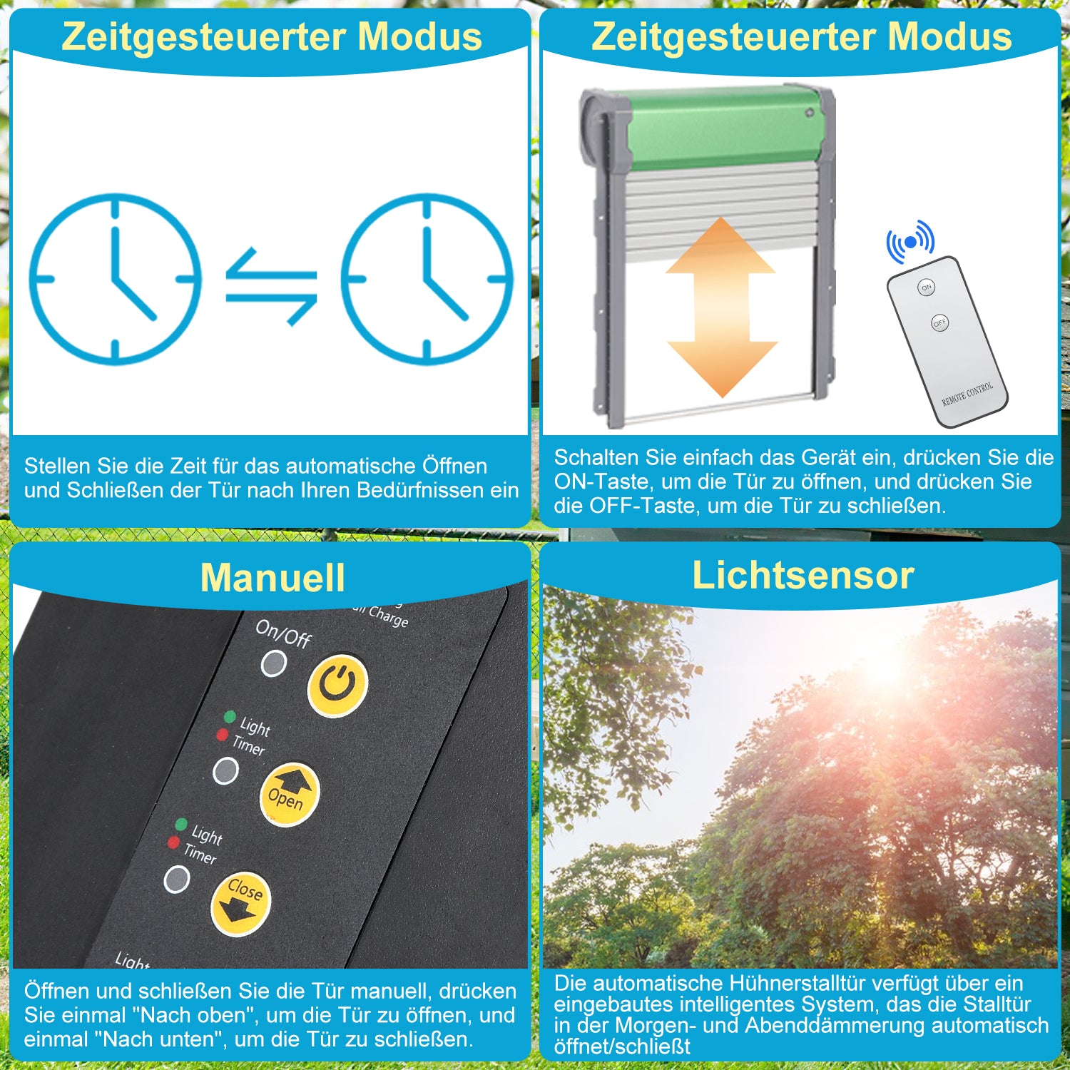 🐓 【Lichtempfindlich, Timing, Fernbedienung und manuelle Bedienung】: Unsere Hühnerklappe Automatisch ermöglicht es Ihnen, Türen automatisch je nach Helligkeit oder zu einer bestimmten Zeit zu öffnen und zu schließen. Mit einer Fernbedienung können Sie die Hühnertür aus der Ferne steuern, und natürlich können Sie auch jederzeit manuell eingreifen.