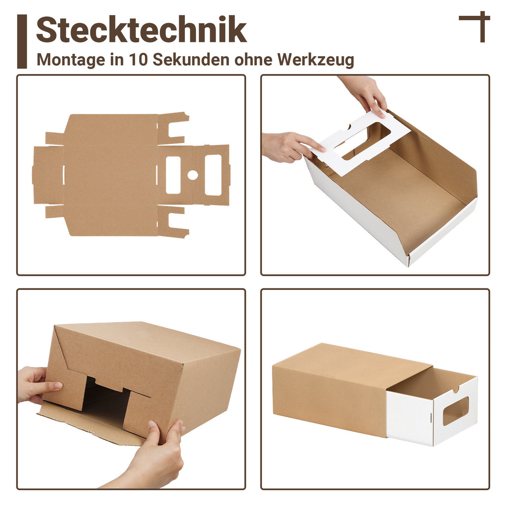 Einfache und schnelle Montage: Dank der vorgefalteten Konstruktion lässt sich jeder Schuhkarton mit einem einfachen "Drucksystem" schnell zusammenbauen.