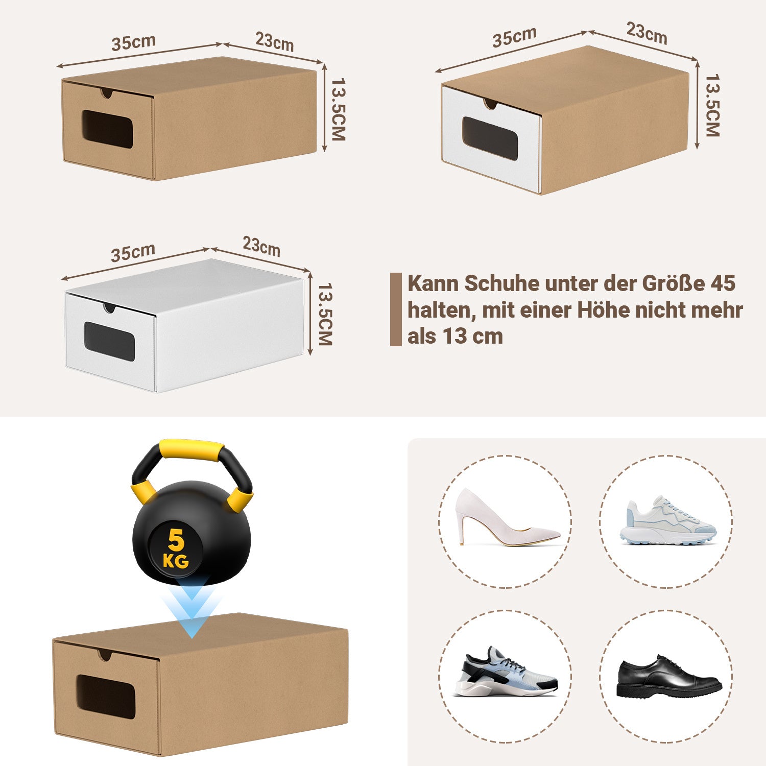 Material der Schuhkartons: Die Außenmaße des Schuhkartons betragen ca.: 35*23*13,5 cm. Hergestellt aus 3-lagigem Wellpappe und verstärktem Kraftpapier, jeder Schuhkarton hat eine Tragkraft von bis zu 6 kg.