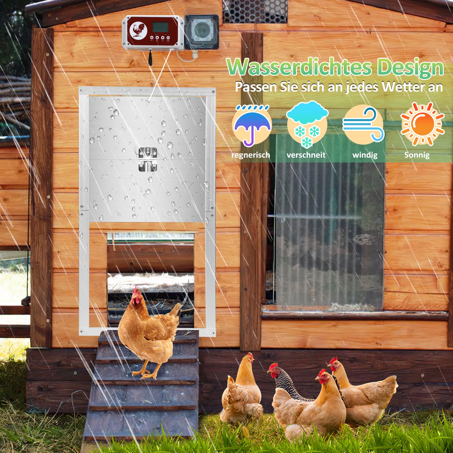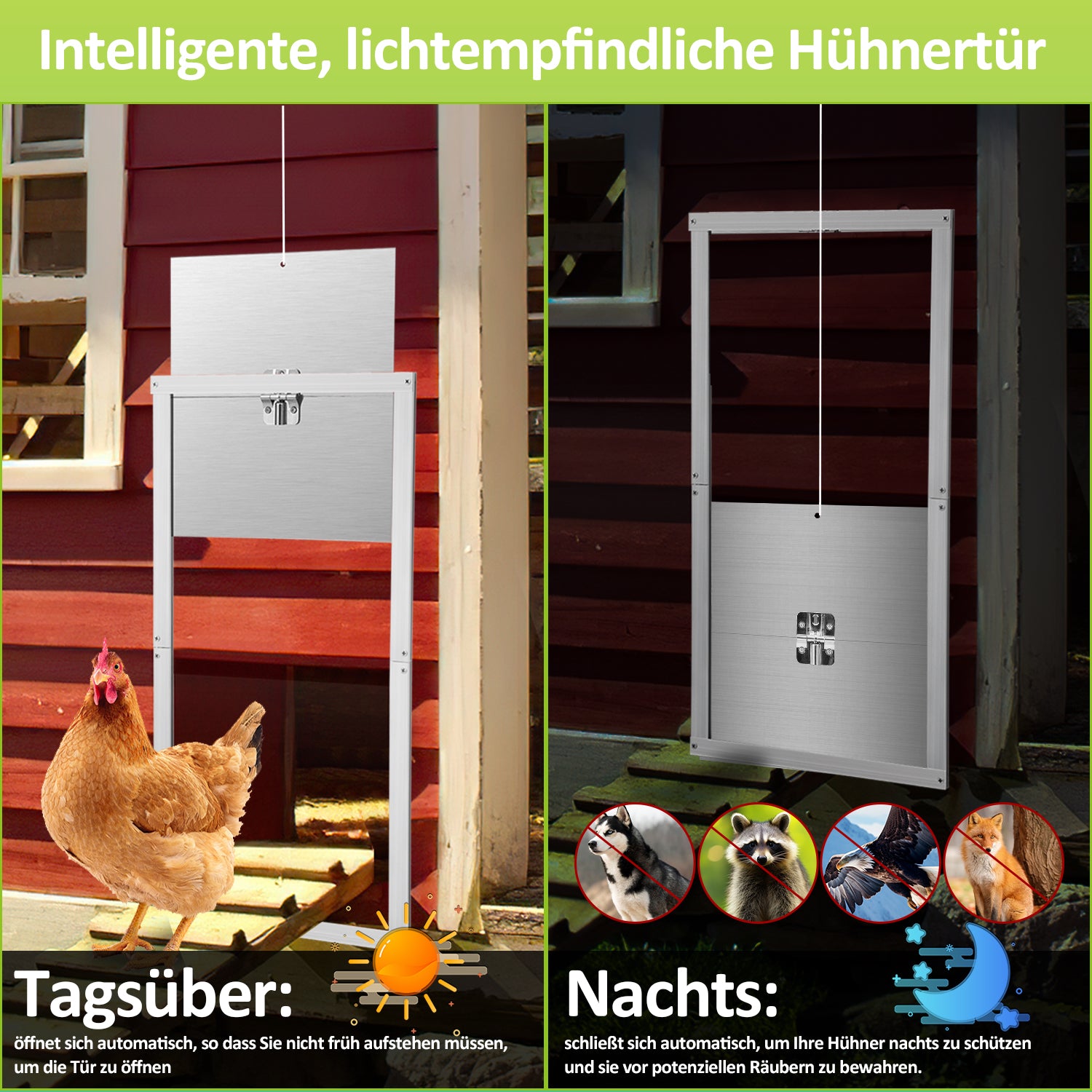 🐓【Breites Einsatzspektrum】: Geeignet für die meisten Geflügel oder Haustiere, sowohl drinnen als auch draußen. Automatische Hühnerstalltür ist im Innen und Außenbereich weit verbreitet und kann verschiedene Nutztiere wie Hühner, Enten und Gänse aufnehmen.