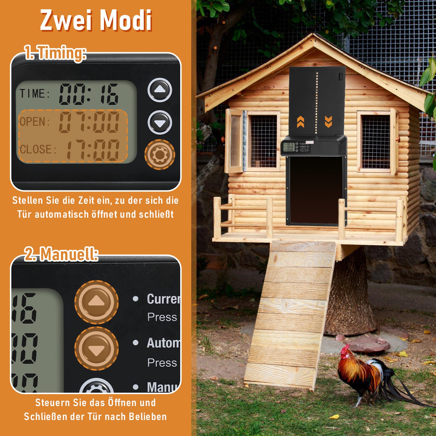 【Timing Sensor & manuelle Steuerung】 Die elektrische Hühnerklappe öffnet und schließt automatisch gemäß einer voreingestellten Zeit, was Ihre Arbeitsbelastung verringert und Ihnen mehr Freizeit ermöglicht. Im manuellen Modus können Sie die Tür des Hühnerstalls jederzeit kontrollieren, was die Verwaltung noch bequemer macht.