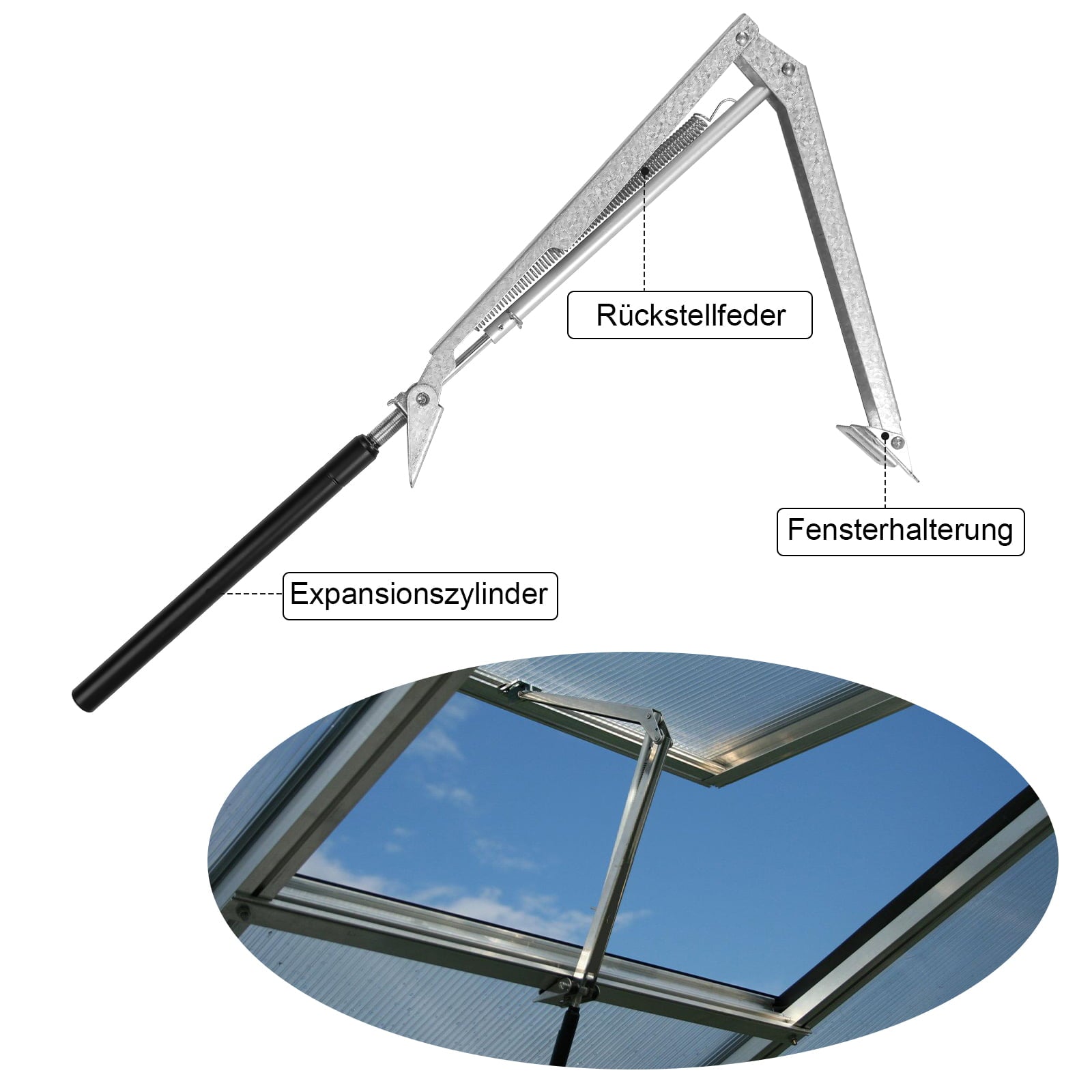 Passend für alle Gewächshäuser inklusive Befestigung, der Öffnungswinkel lässt sich leicht verstellen.