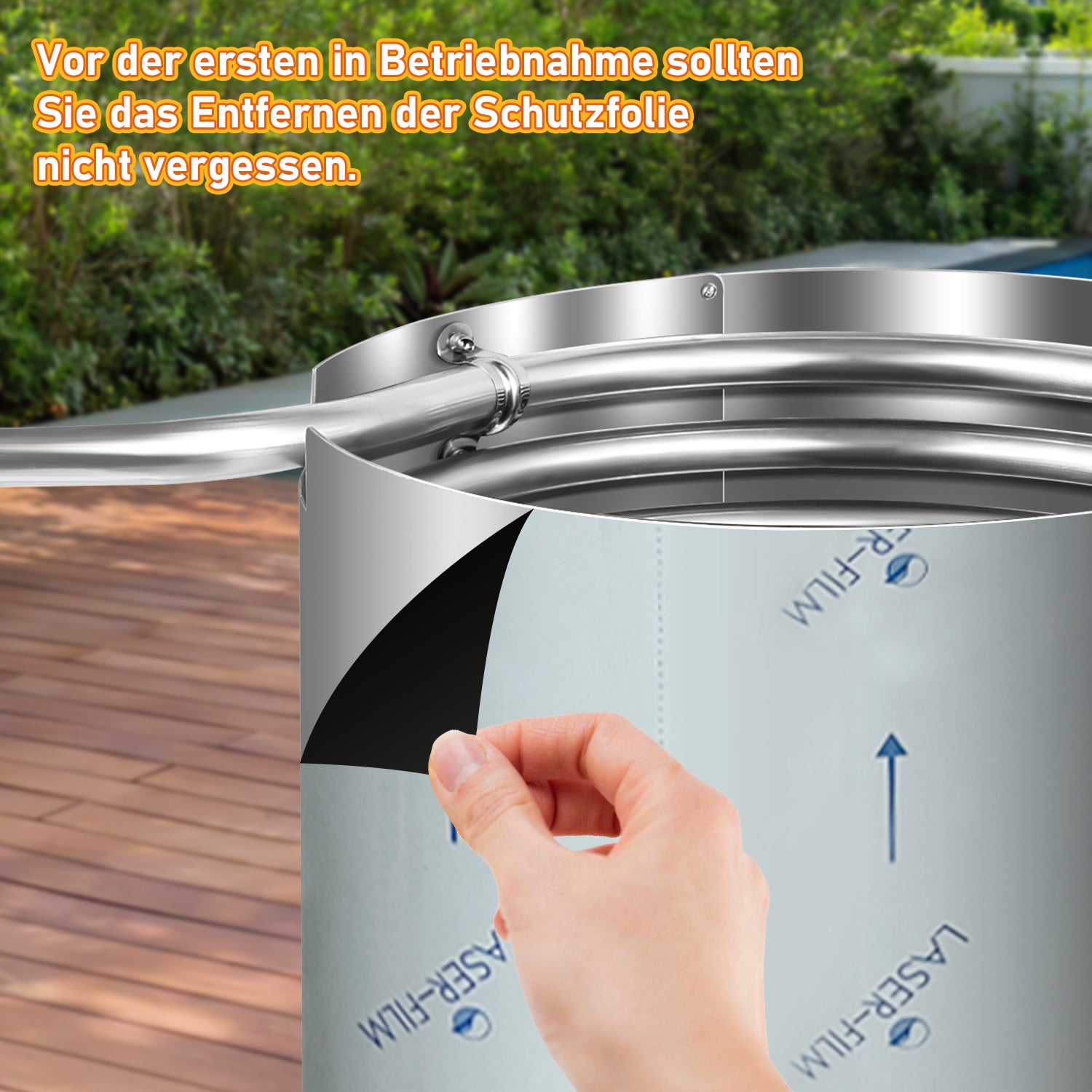 [Langlebige und robuste Feuertonne aus Edelstahl]: Unser Poolofen besteht aus hochwertigem Edelstahl, der rostfrei und temperaturbeständig bis 300 °C ist. Das Feuertonne-Design sorgt für eine jahrelange Nutzung im Freien ohne Qualitätsverlust. Zusätzlich ist die Brennholz Poolheizung mit einer schützenden Außenfolie ausgestattet, die für erhöhte Haltbarkeit und Schutz vor äußeren Einflüssen sorgt.