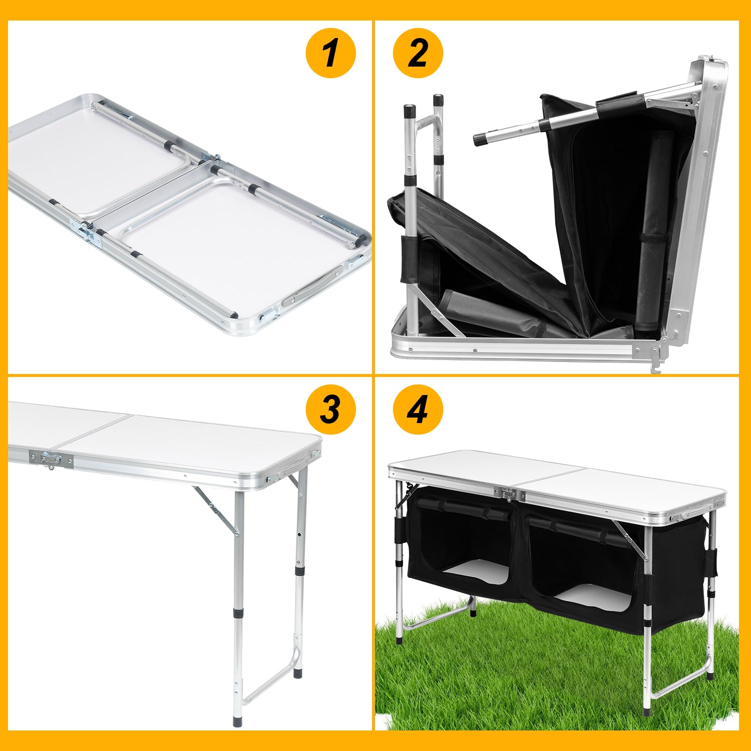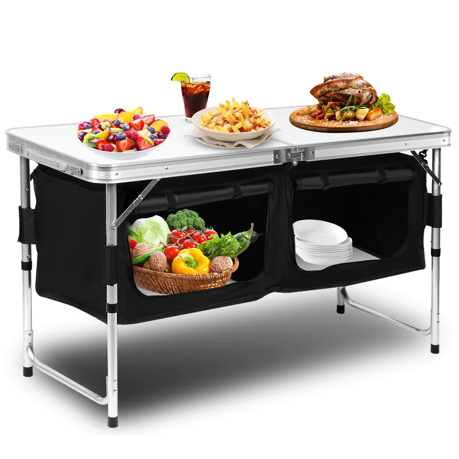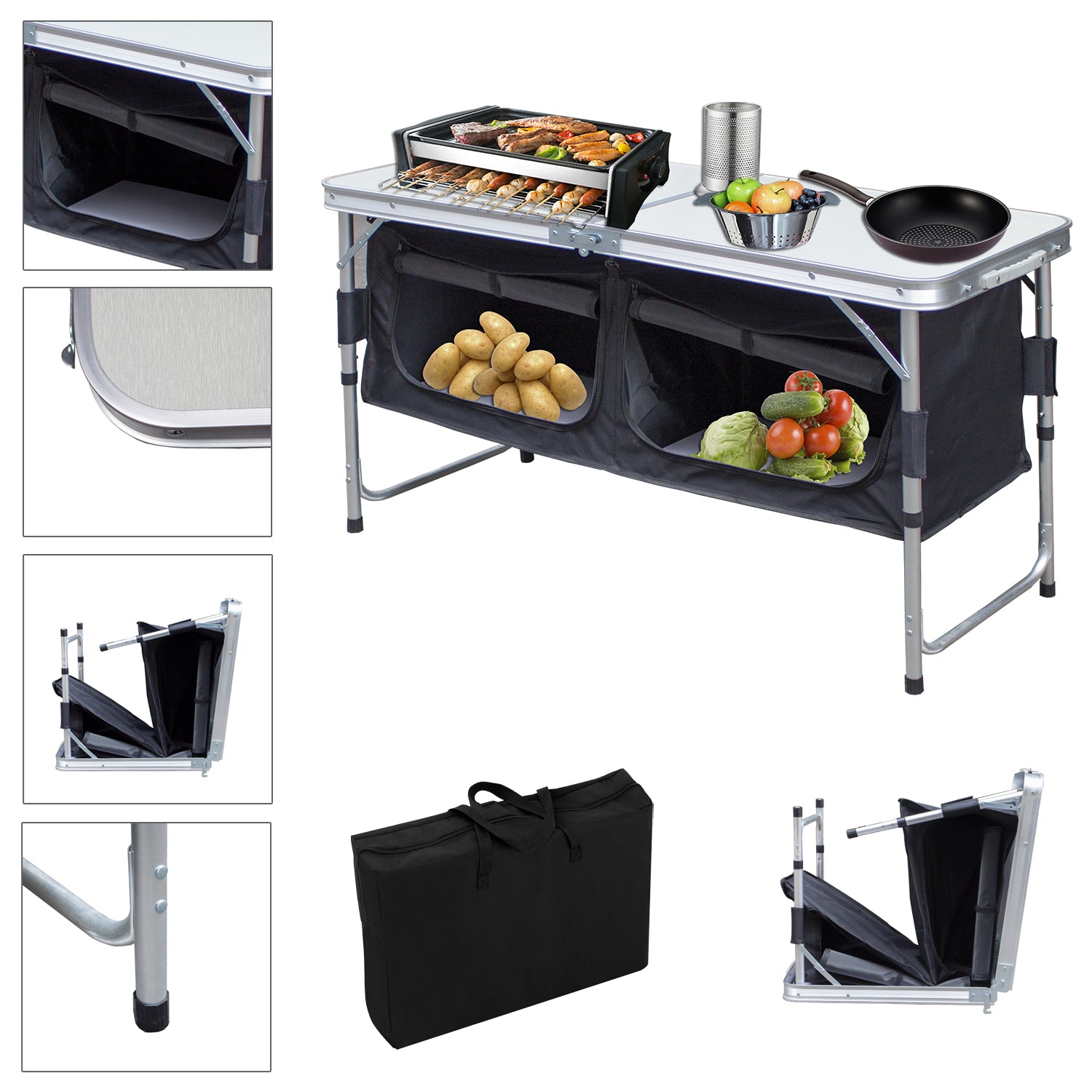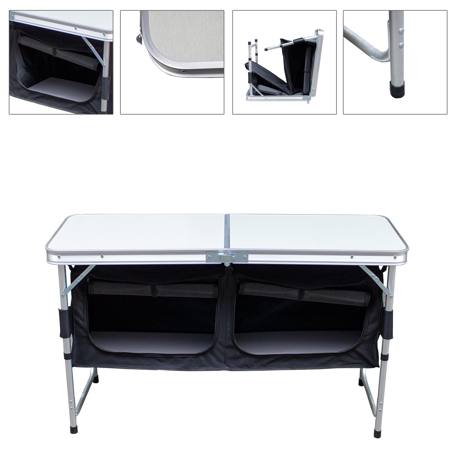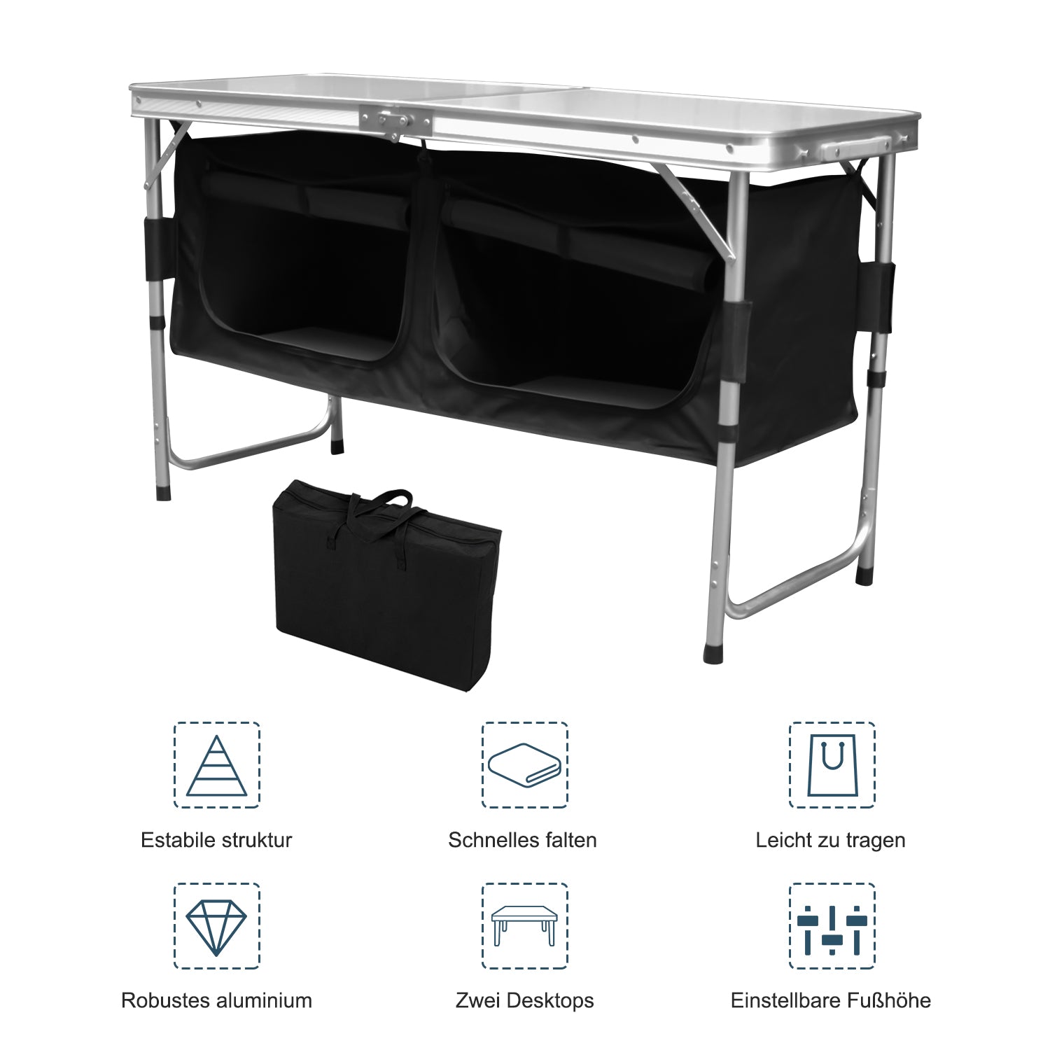 Dieser mobile Camping-Stauraum verfügt über eine große Arbeitsplatte und 2 große Aufbewahrungsboxe. Ideal für Camping und Partys. Die Aufbewahrungsbox ist mit einer Stofftür verschlossen. Die Stofftür kann auch aufgerollt werden, um den Zugang zum Fach freizugeben. Es ist leicht und faltbar, daher ist es leicht zu transportieren. Mit der mitgelieferten Tragetasche ist der Transport und die Lagerung einfach und unkompliziert. Dank seiner robusten Konstruktion hat der Tisch eine hohe Tragfähigkeit von bis zu 30-50 kg. Durch den Metallrahme ist dieser Campingtisch sehr stabil und langlebig. Die Tischplatte ist hitzebeständig, kratzfest und wasserdicht. Die Aufbewahrungsbox besteht aus PVC-beschichtetem Stoff für eine lange Lebensdauer.