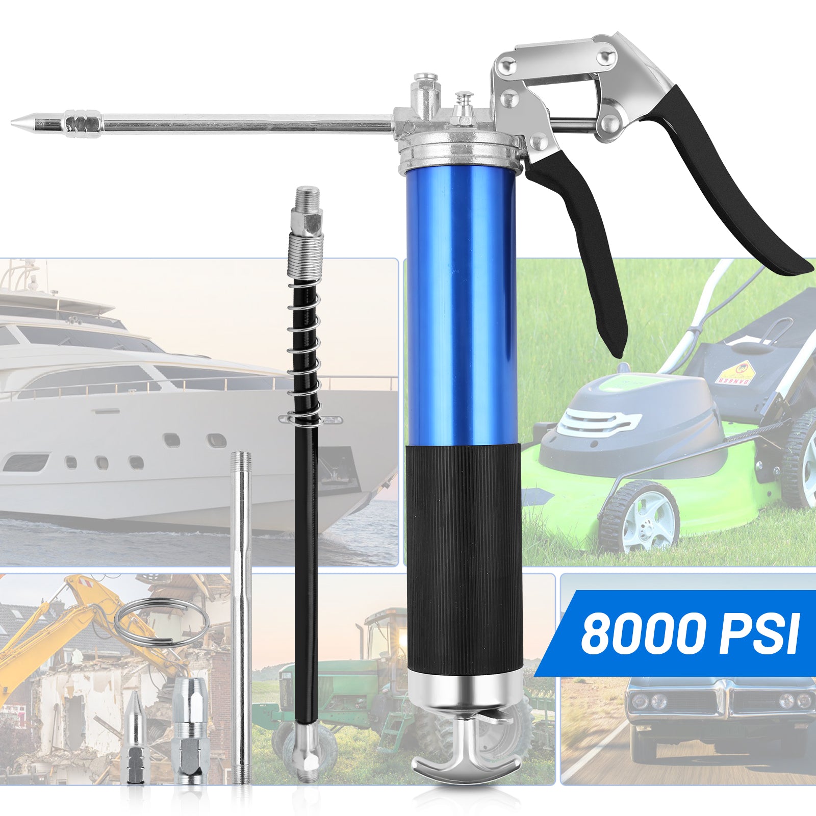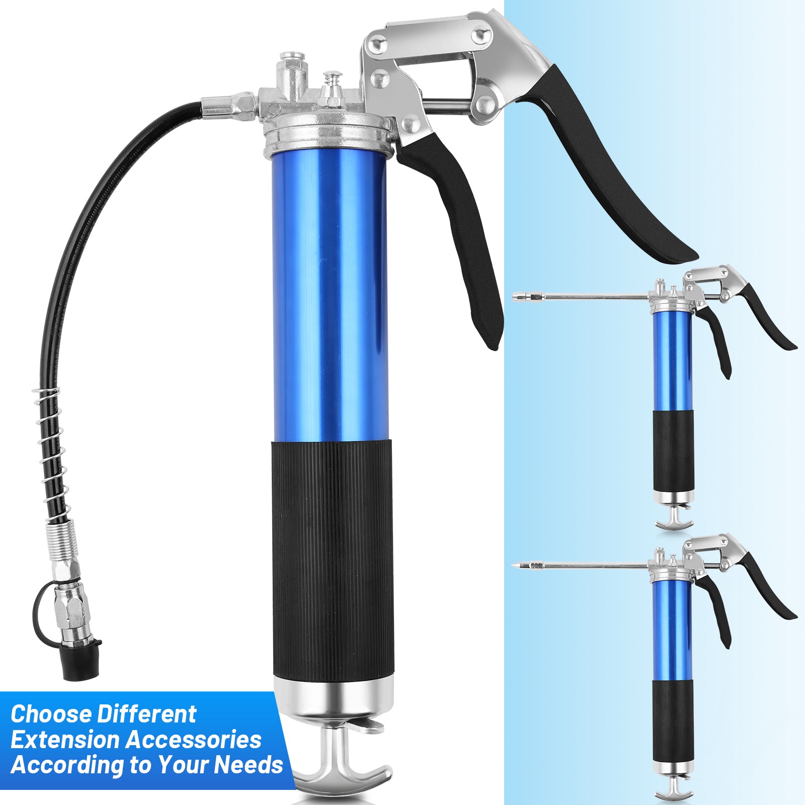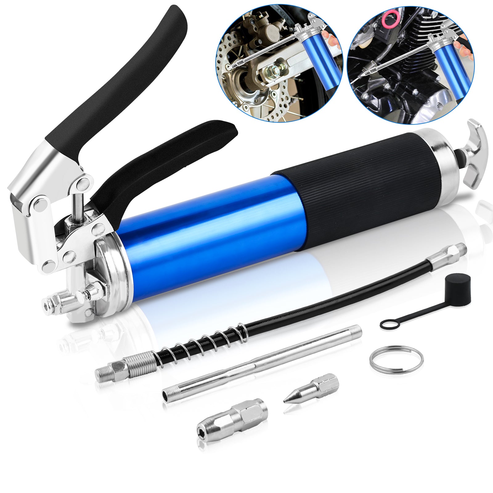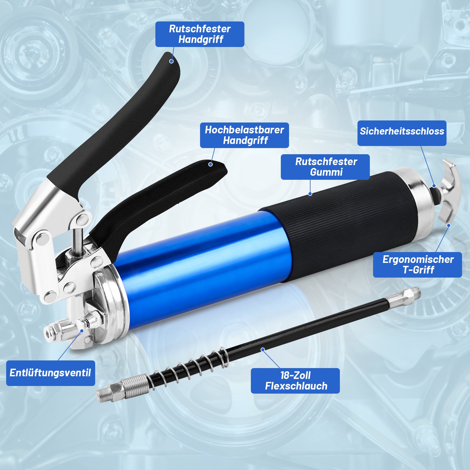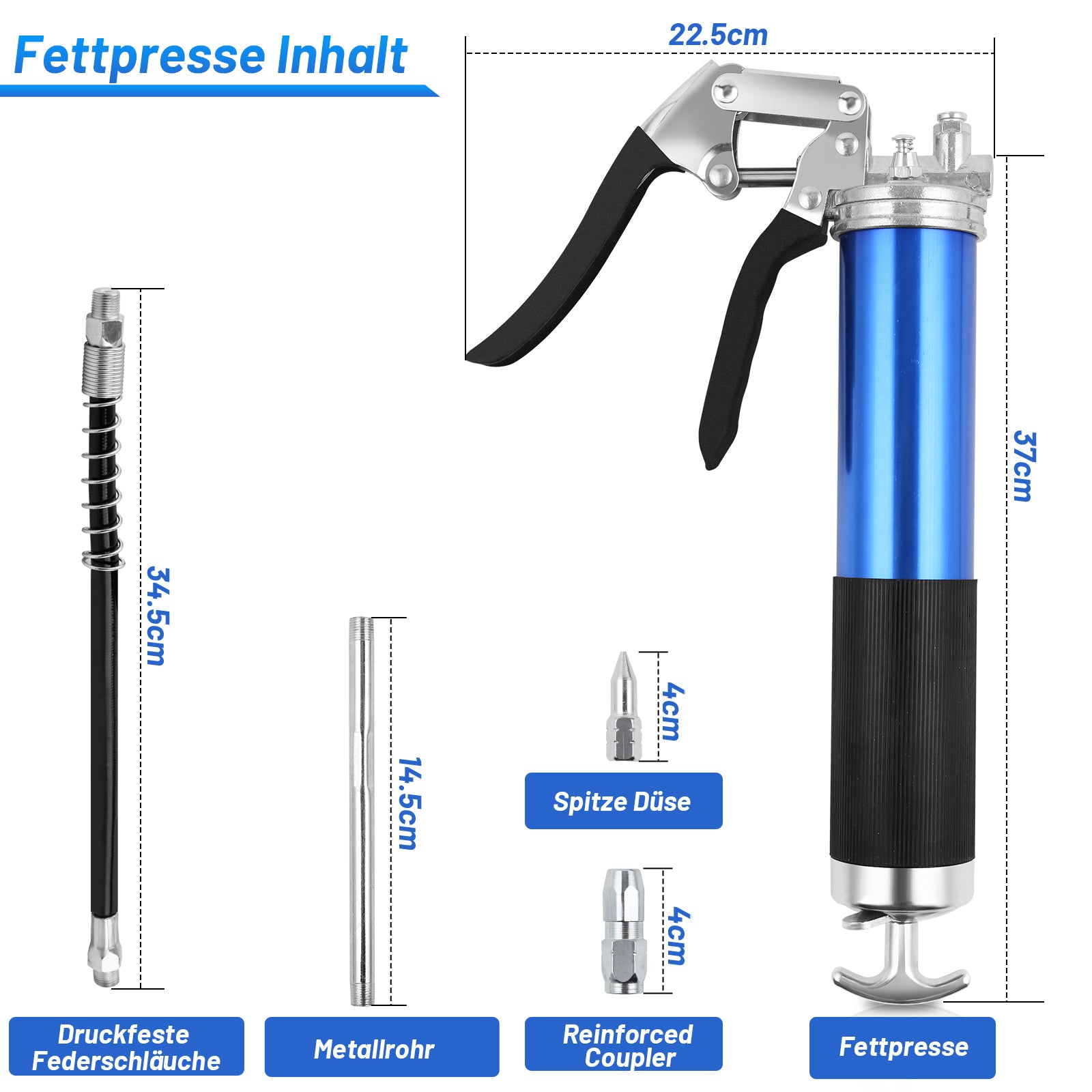 Upgrade-Fettpresse:Verstärkter Feder mit der bessere Versieglung wird den Drück bis zu 550 bar (8000 PSI) unterstützen. O-Ring versiegeltes Hochdruck-Kolben-Design verhindert, dass das Fett aus dem Pumpkopf ausläuft.