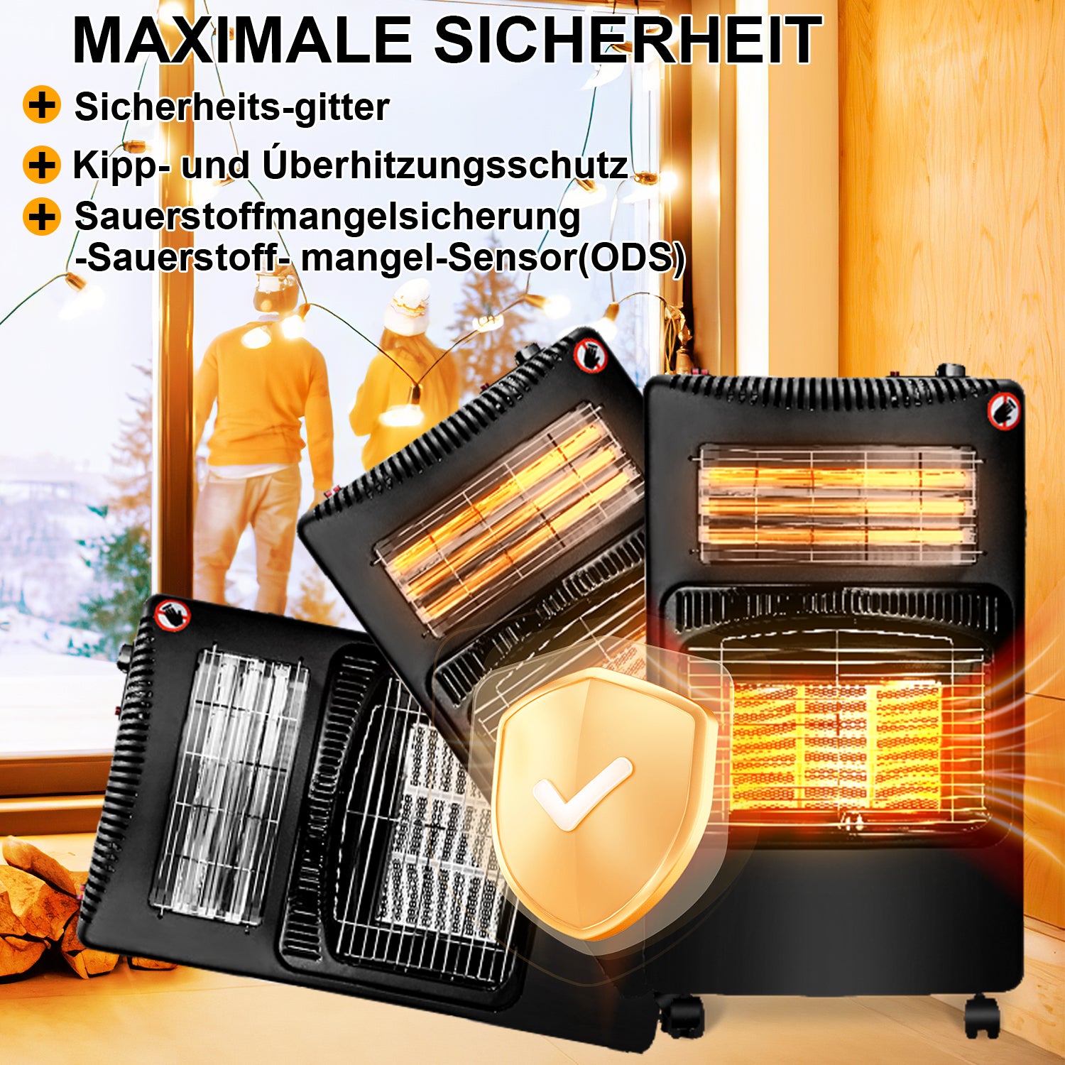 Dreifaches Sicherheitsdesign. Der elektrische Gasheizer ist mit Kippschutz, Sauerstoffmangelschutz (ODS) und Flammenausfallschutz (FFD) ausgestattet. Wenn der elektrische Gasheizer versehentlich umfällt oder einen Sauerstoffmangel in der Umgebung feststellt, schaltet er sich automatisch ab, um die Sicherheit während des Gebrauchs zu gewährleisten.