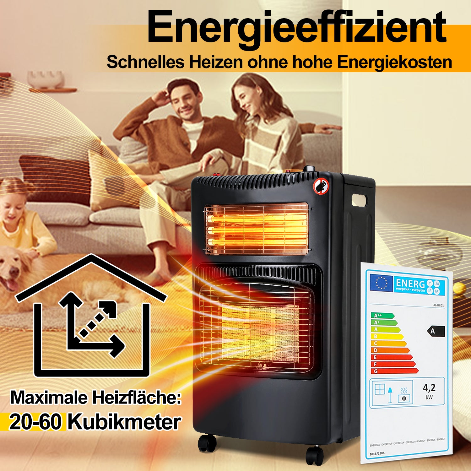 Starke Heizleistung. Wenn der Winter naht, ist unser Gasheizung für innenräume die ideale Wahl. Er bietet drei einstellbare Heizstufen (1300/2750/4200 W) und verteilt die Wärme gleichmäßig. Er kann gleichzeitig mit der elektrischen Heizfunktion verwendet werden und sorgt so für eine kontinuierliche und effiziente Wärmeabgabe. Ideal für Räume von 20 bis 60 Quadratmetern.