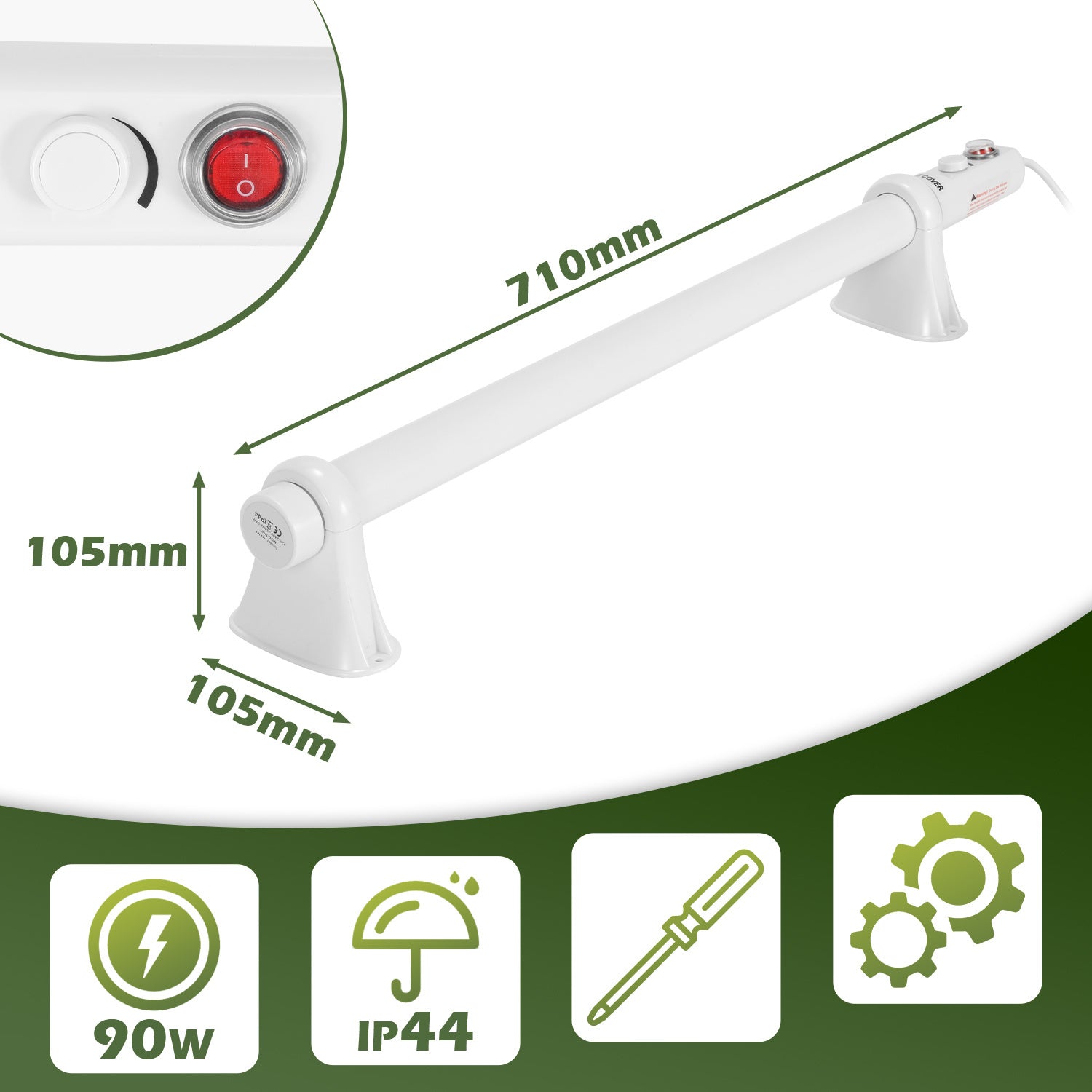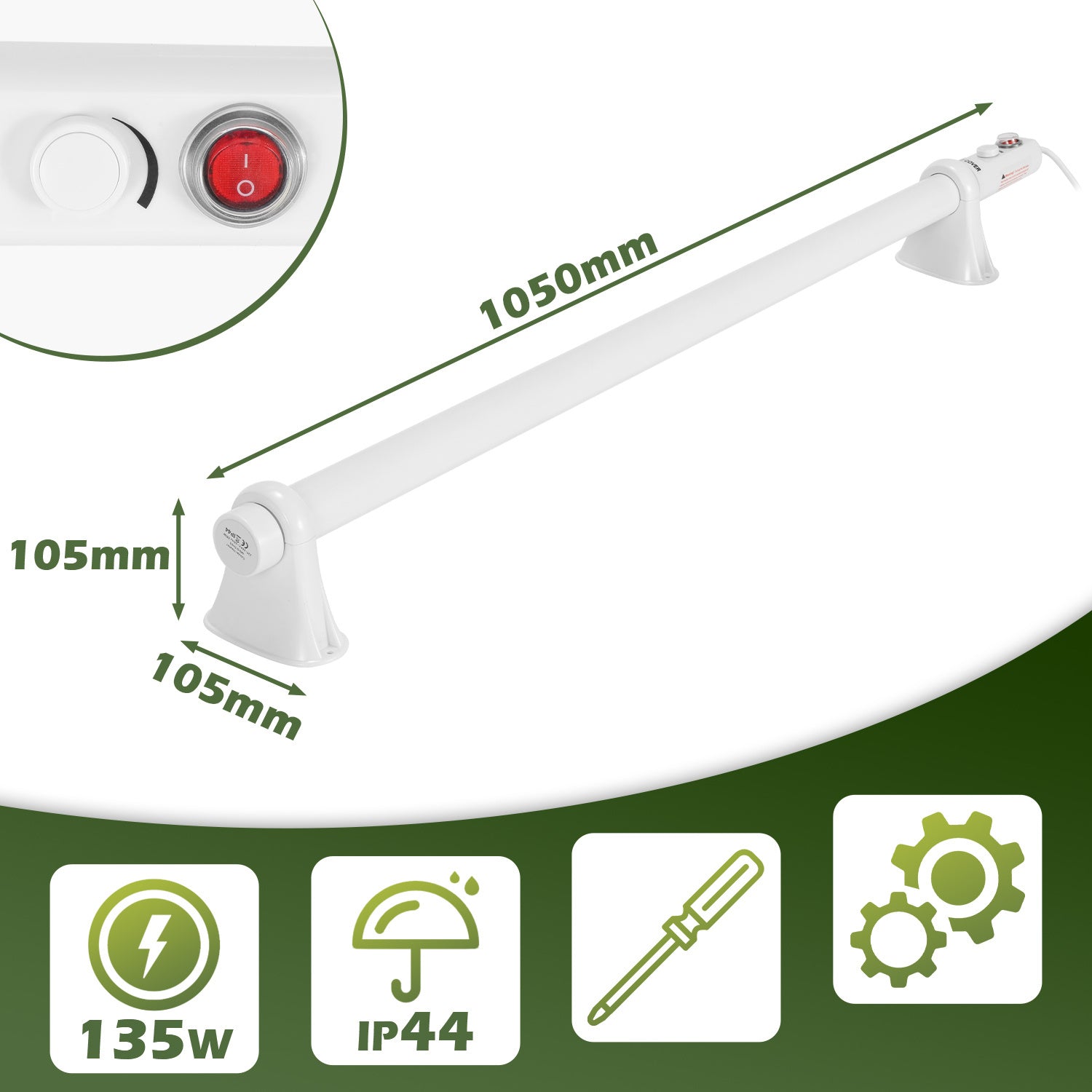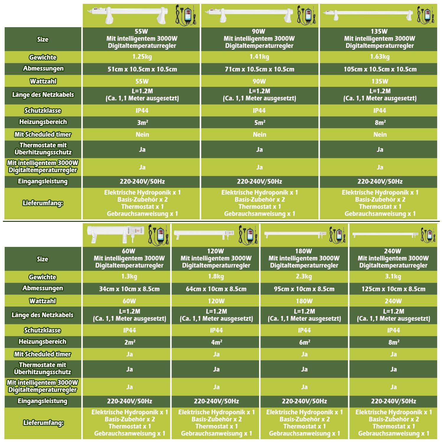 3 Längenvarianten verfügbar: Die gewächshausheizung bietet 3 Optionen: 55 Watt (50 cm), 90 Watt (70 cm) und 135 Watt (100 cm) – passend für verschiedene Räume und Pflanzengrößen.