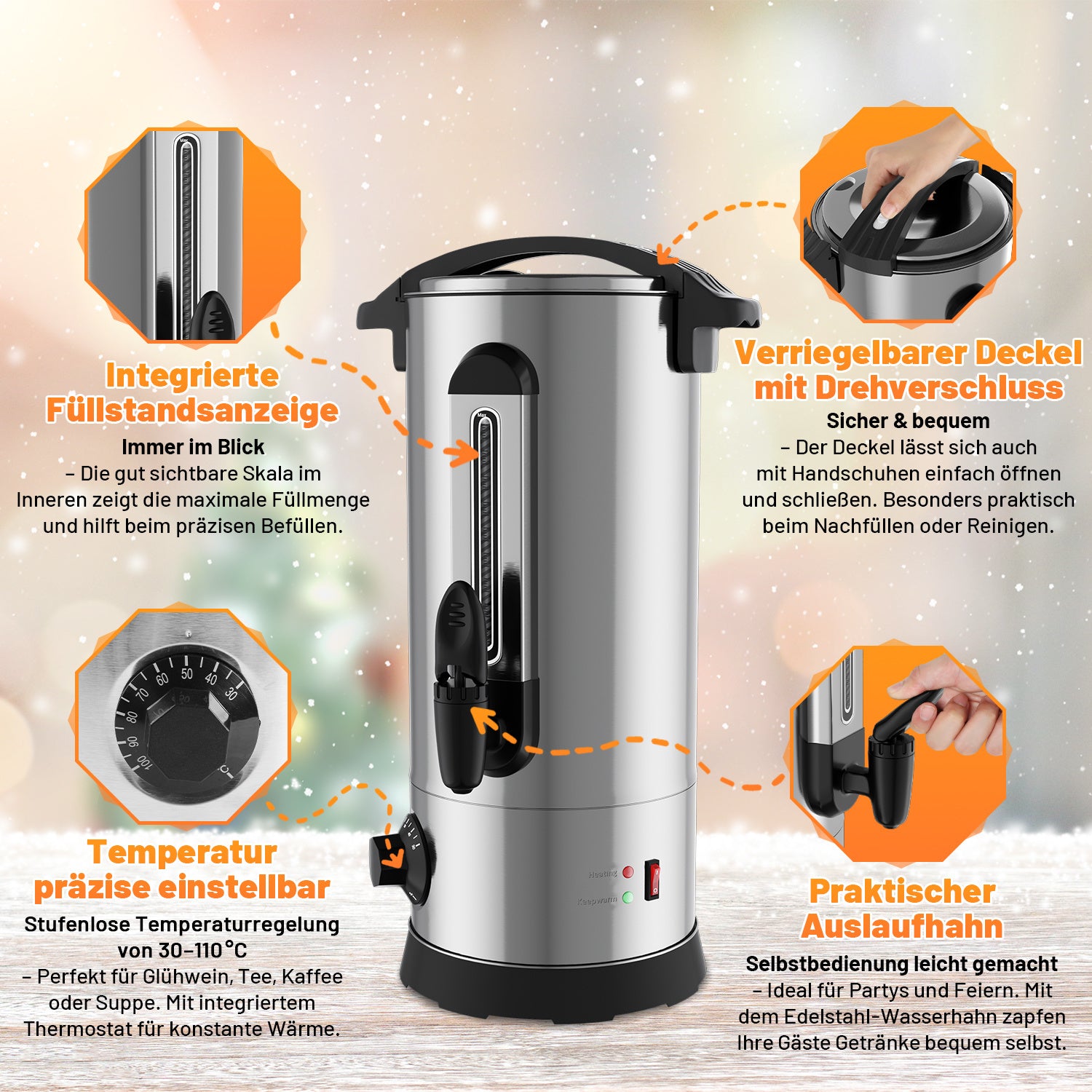 Das perfekte Paket für festliche Stunden: Ihr perfekter Partner für gemütliche Runden & festliche Feste! Ob Weihnachtsmarkt-Stand, Familienfeier oder kleiner Catering-Service – unser glühweinkessel ist die ideale Lösung. Inklusive 10 winterlich gestalteten Bechern für sofortigen Servierspaß und stimmungsvolle Atmosphäre!