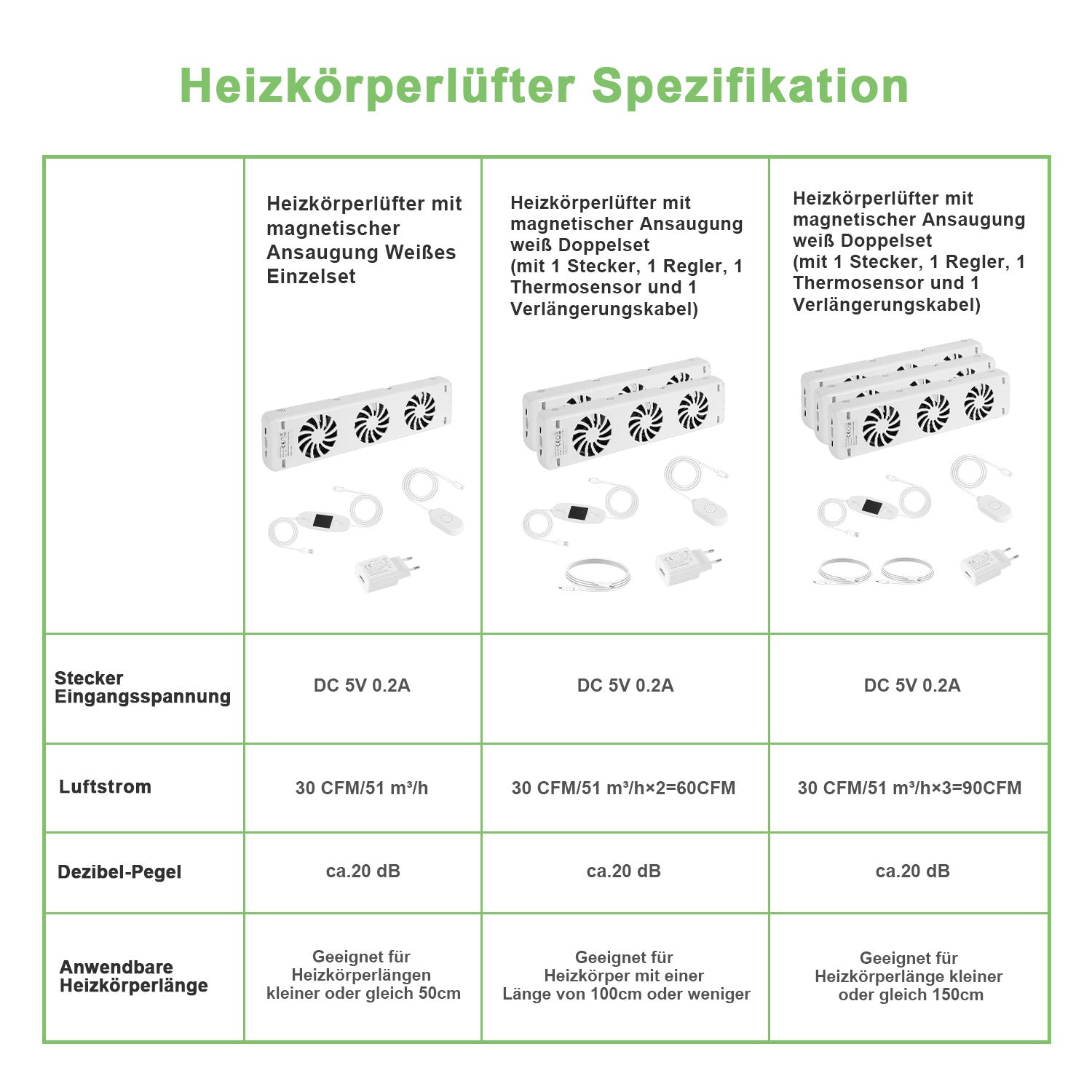 Heizkörperlüfter mit magnetischer Ansaugung weiß Doppelset (mit 1 Stecker, 1 Regler, 1 Thermosensor und 1 Verlängerungskabel)