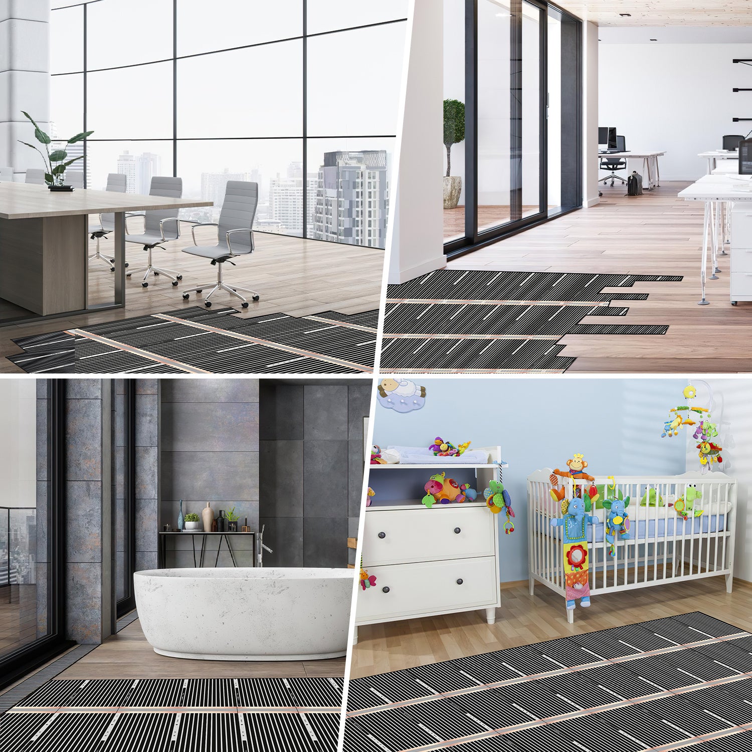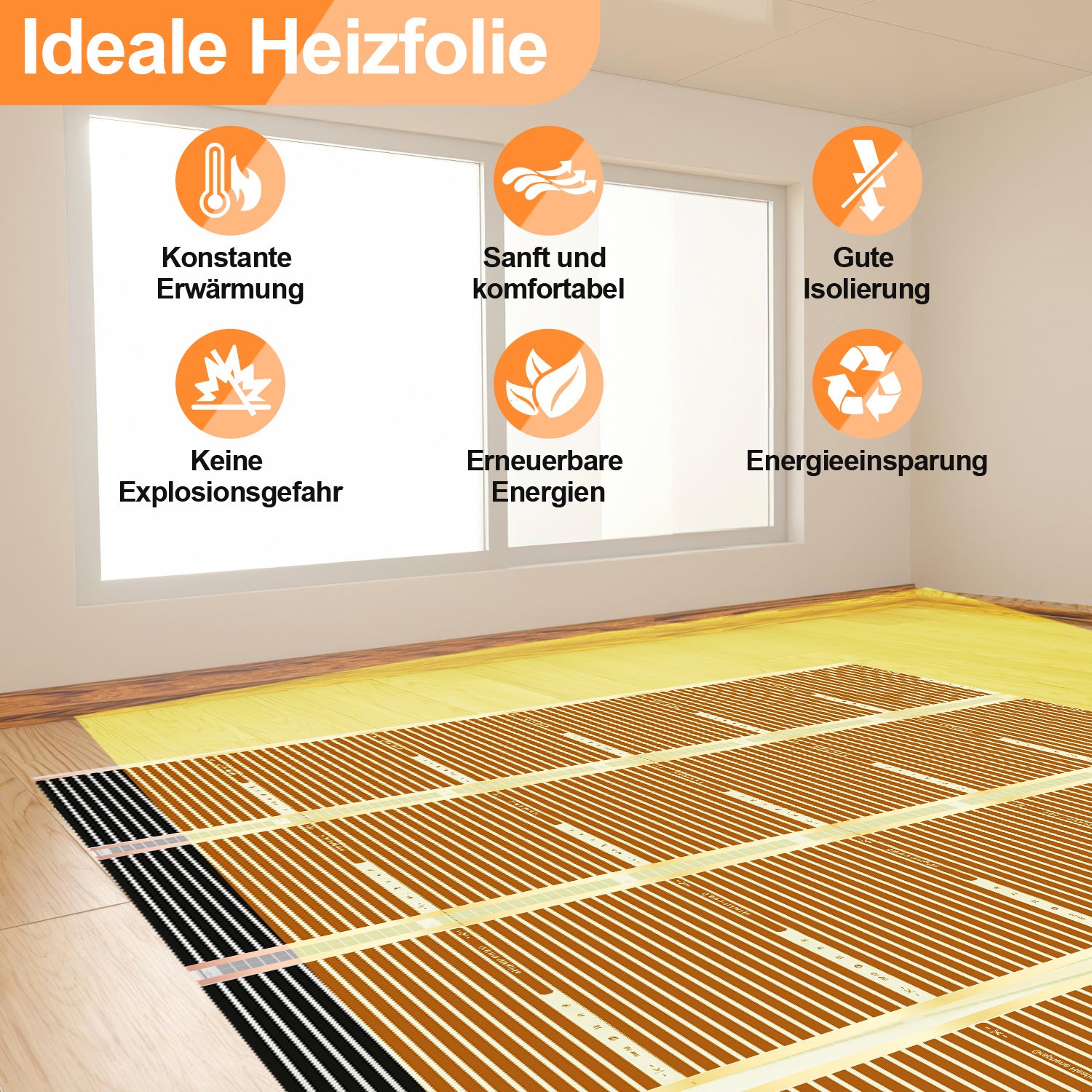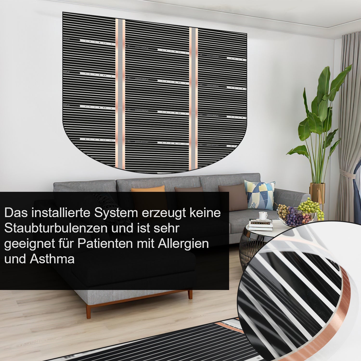♨ Einfach zu installieren: 0.3mm hoch, geeignet für fast alle Bodenbeläge, einschließlich Parkett, Laminatboden, Vinylboden und Teppiche mit Klicksystemen. Bei einem Leistungsniveau von 3-220 W/m2 können alle 25mm entlang ausgewiesener Linien geschnitten werden, mit gleichmäßiger Wärmeverteilung über 85% der Folienoberfläche ist mit Heizelementen bedeckt.
