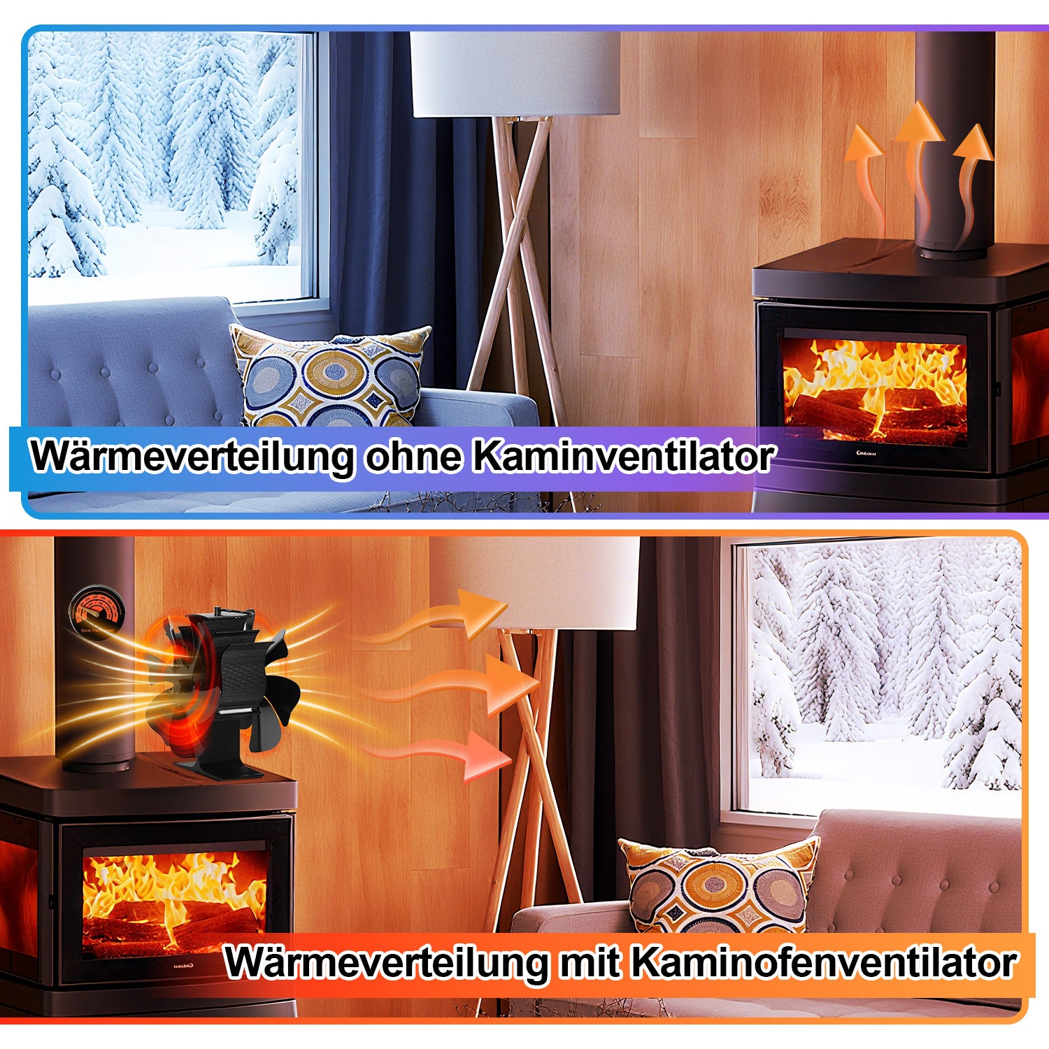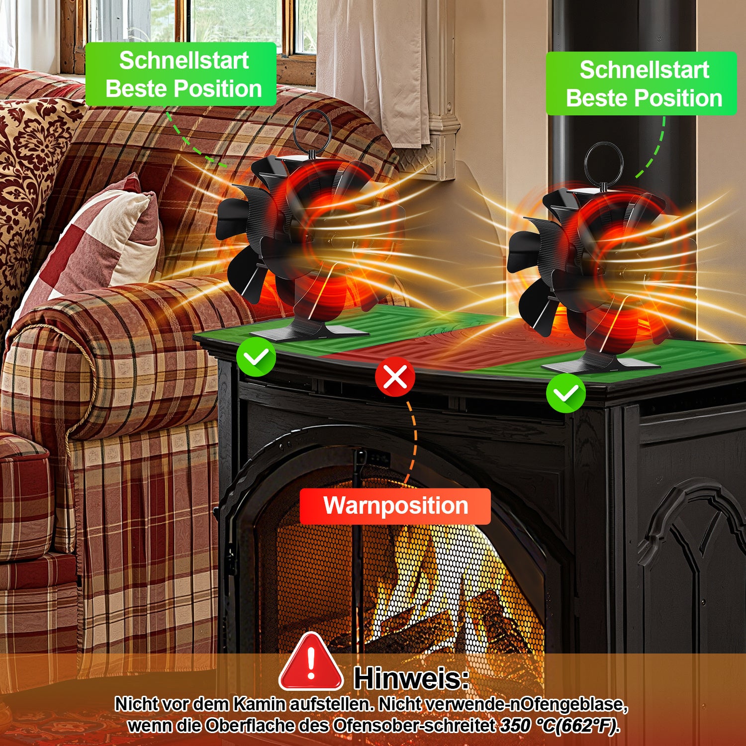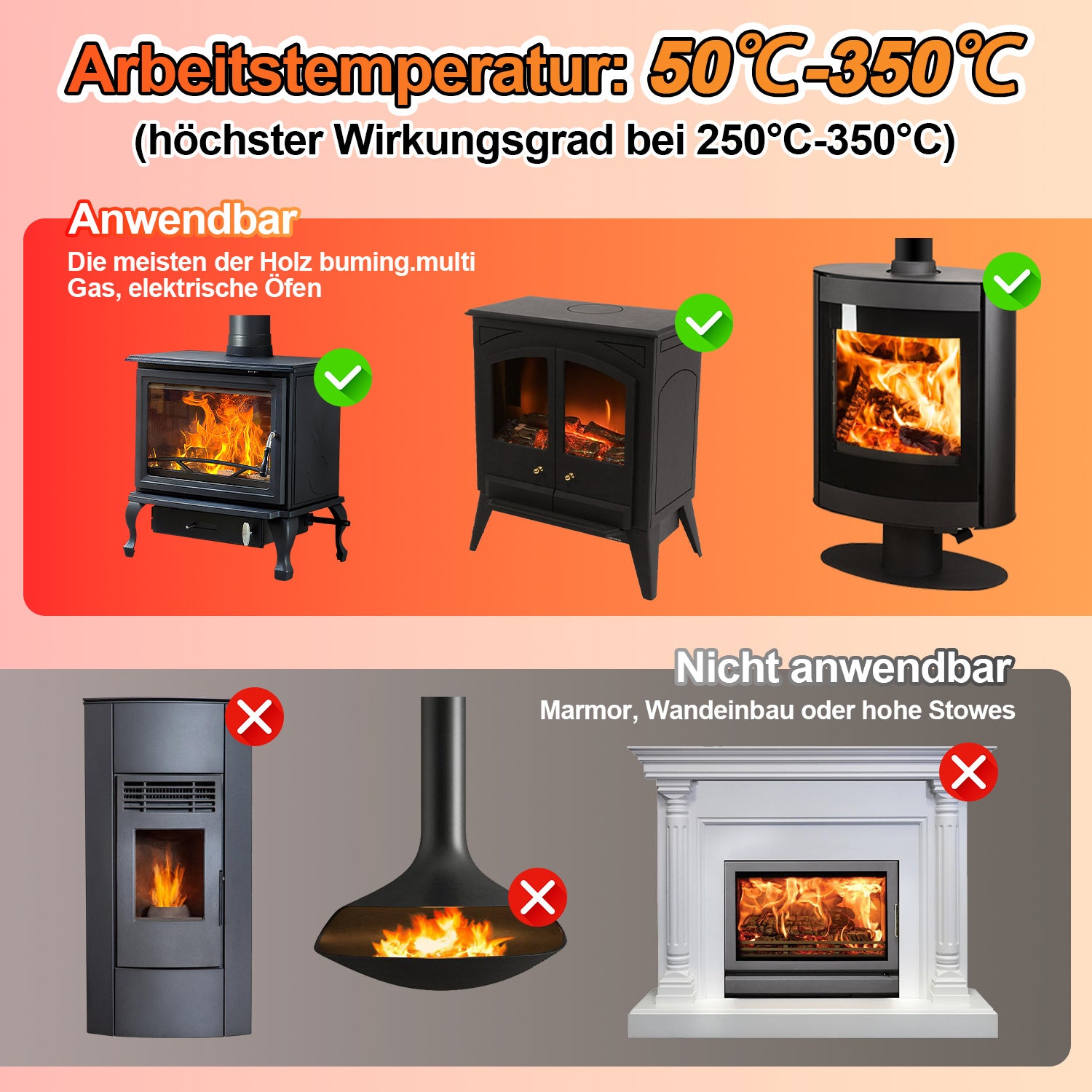 GRÖSSERER LUFTSTROM UND EFFIZIENZ: 6-Blatt-Ventilatoren die die Wärme des Ofens effektiver verteilen und die Raumtemperatur schnell erhöhen können. Der Lüfter startet automatisch, wenn die Oberflächentemperatur 50 °C erreicht. Kaminventilatoren nutzen die vom Holzofen erzeugte Wärme voll aus und können den Holzverbrauch um 40 % senken.