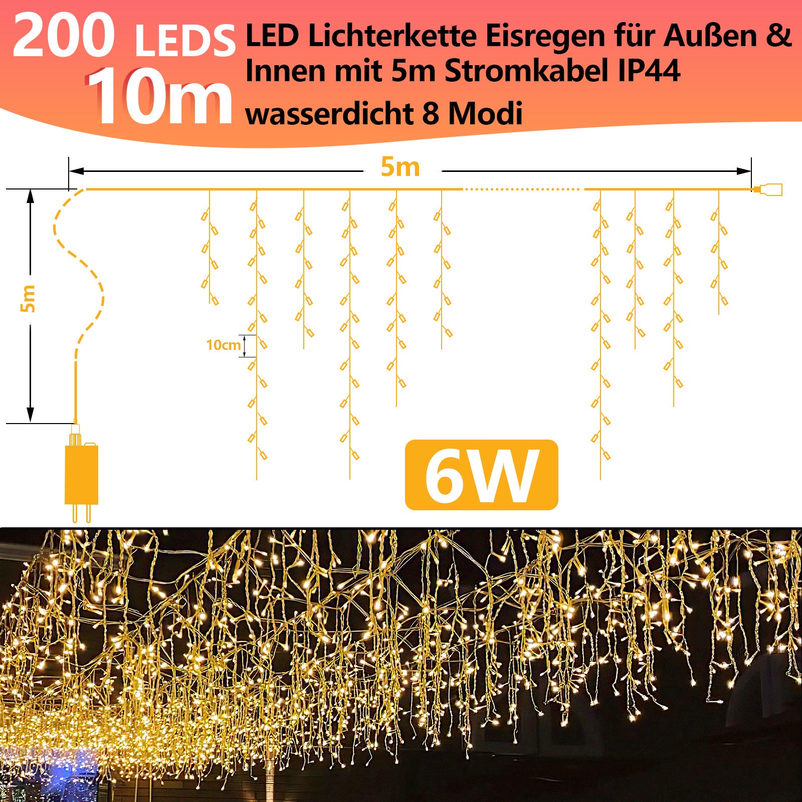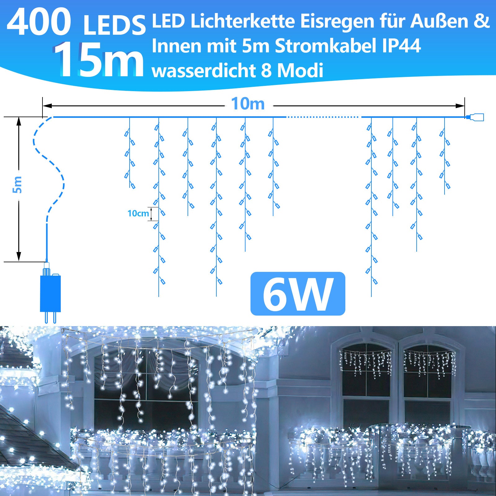 Hohe Qualität: LED Eisregen Lichterkette 5/10/15M Warmweiß/Kaltweiß 200/400/600 LEDs; 5/10/15 Meter lichterkette Eisregen + 5 Meter Stromkabel;Der Abstand jedes Lichts beträgt 10 cm. Material: Hochwertigem Kupferdraht.Kann an Wände,Fenster,Türen,Vorhänge,Pavillons,Treppenhäuser und Weihnachtsbäume gehängt werden.