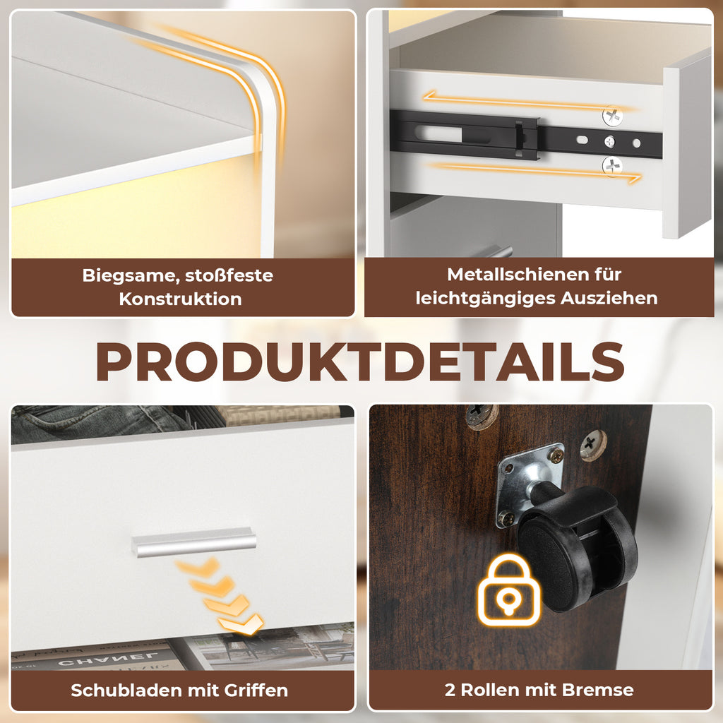 🗄️ STABIL UND LANGLEBIG: Dieser LED-Nachttisch besteht aus hochwertiger Spanplatte, ist stabil und sehr belastbar. Die Oberfläche ist wasserfest, kratzfest und leicht zu reinigen. Die Schubladen laufen auf hochwertigen Schienen leicht und leise. Zusammen mit dem verstärkten Fußteil garantiert das lange Haltbarkeit.