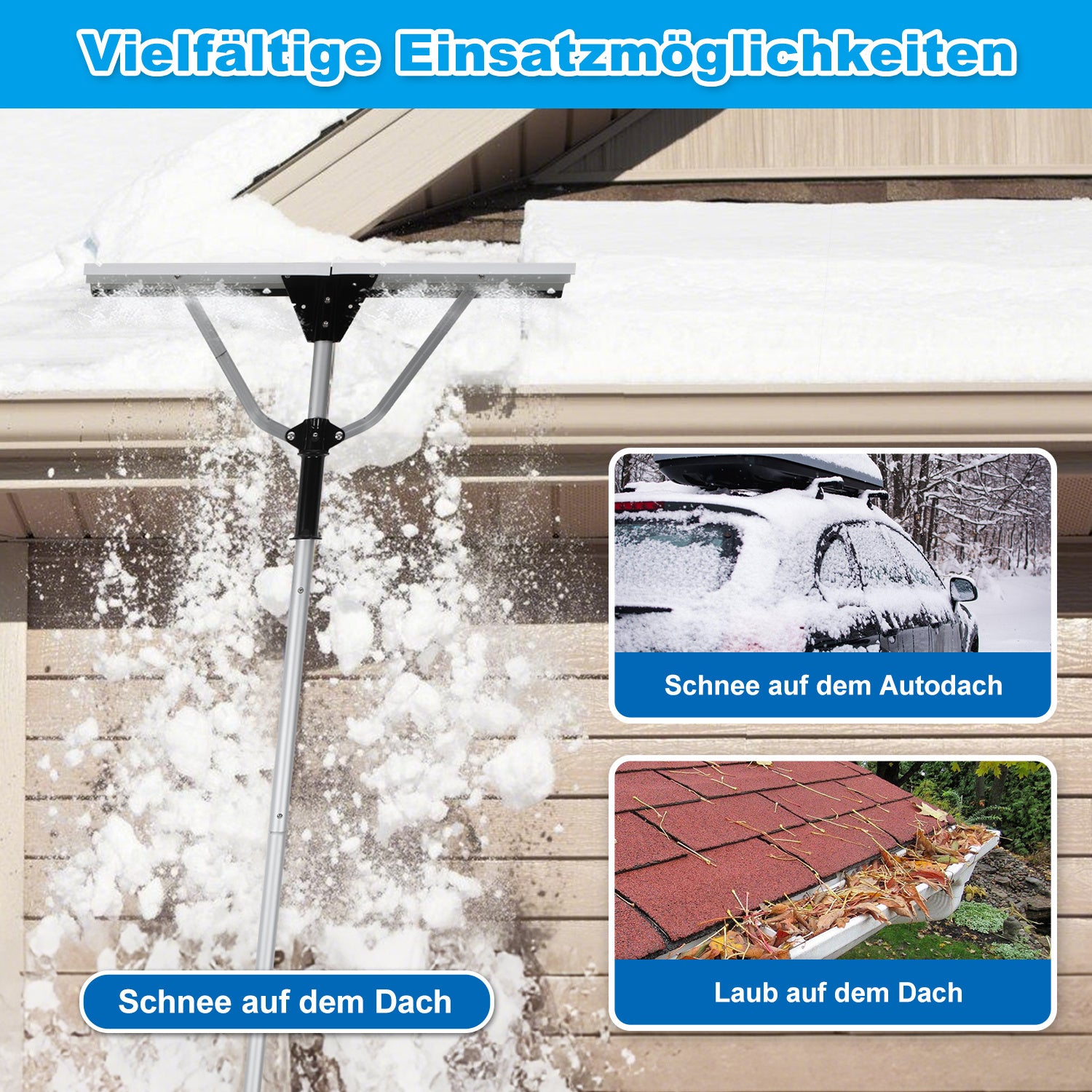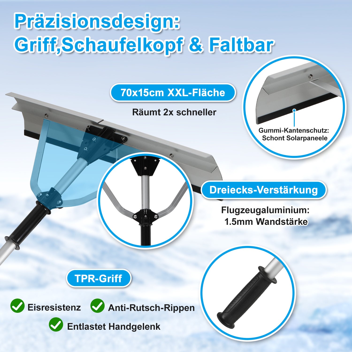 Sicher arbeiten vom Boden aus: Photovoltaik Schneeschieber mit teleskopierbarer Stange bis 636 cm Länge. Sie müssen nicht auf das Dach steigen – der Photovoltaik-Schneeschieber ermöglicht sicheres und komfortables Schneeräumen aus sicherer Entfernung.