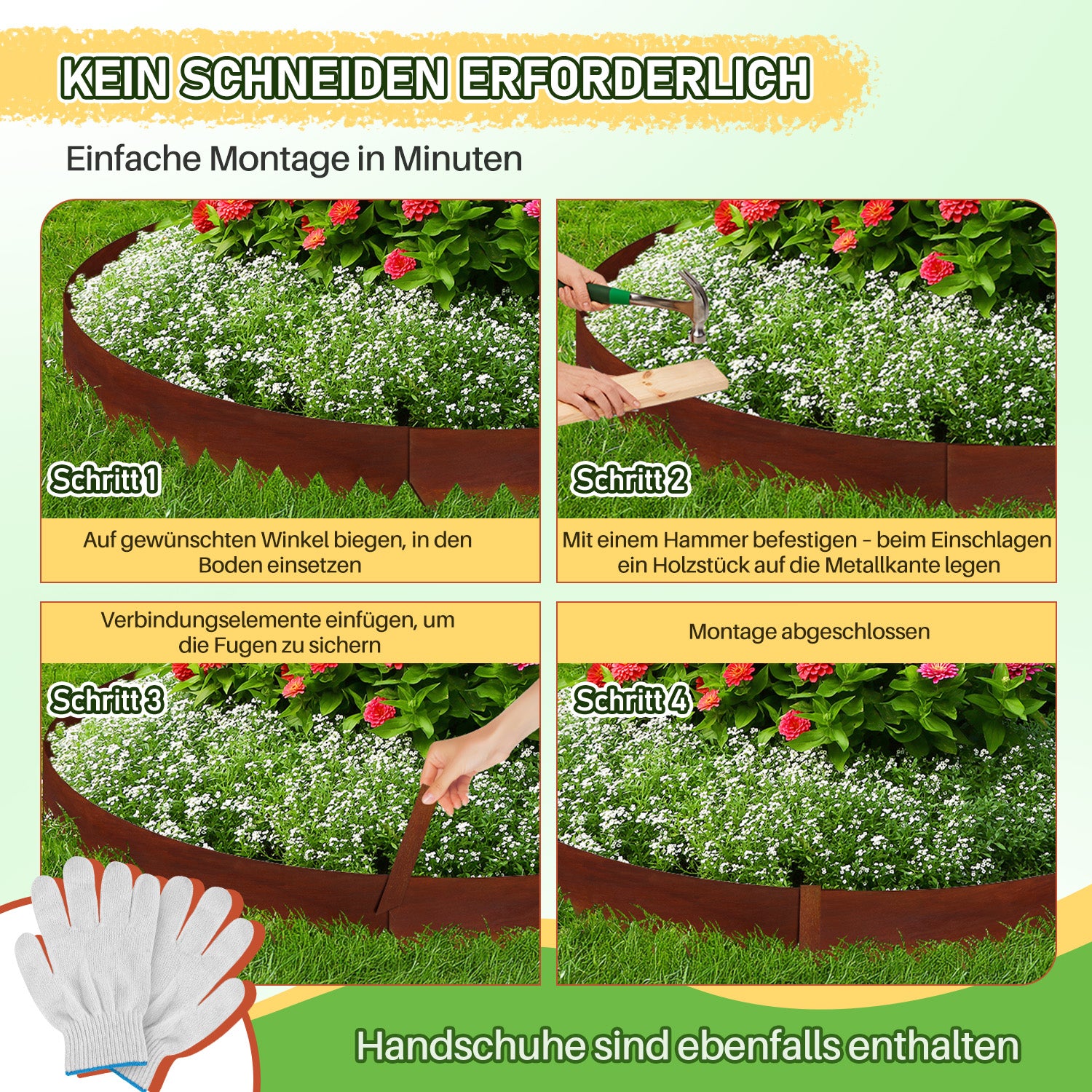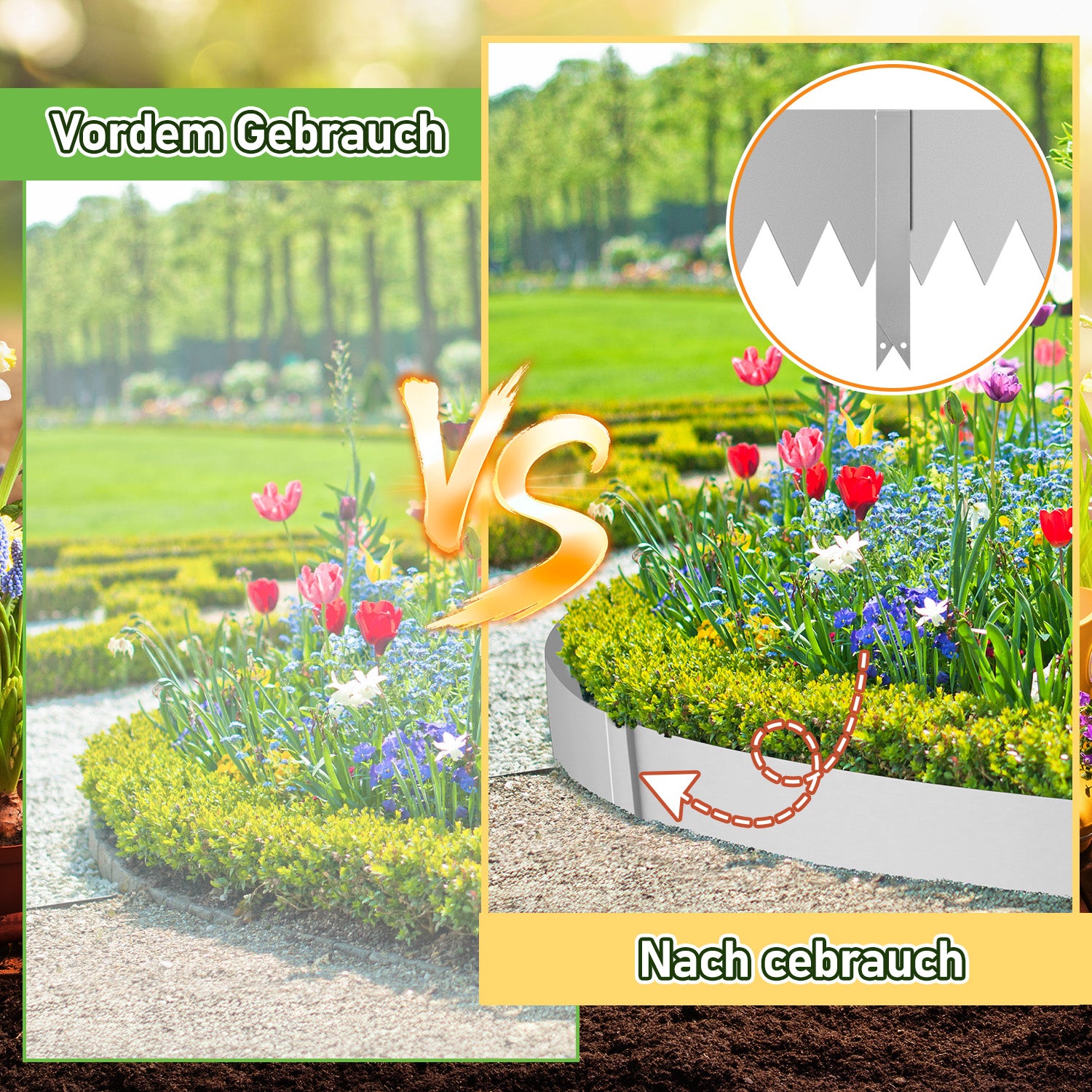 Vielseitig einsetzbar, flexibles Design: Dieser Eisenzaun eignet sich für verschiedene Anwendungen, z. B. zur Abgrenzung von Beeten, Bäumen oder Wegen. Er dient nicht nur als Schutz, sondern auch als dekorative Umrandung für Ihren Garten und sorgt für eine ordentliche und gepflegte Optik.
