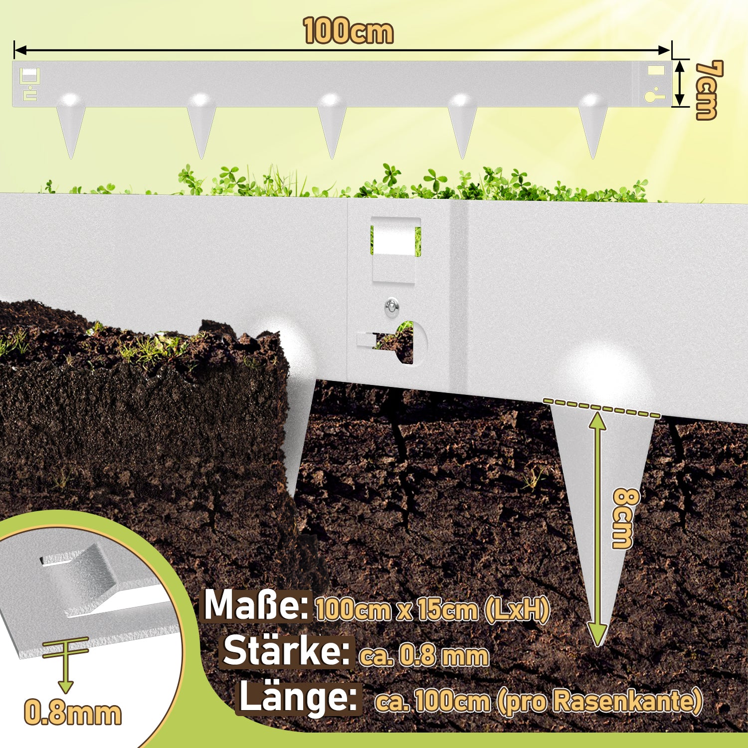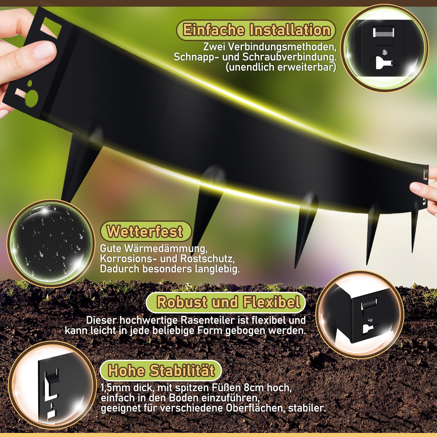 🌷 Praktikalität: Mit dem Stecksystem lassen sich die einzelnen Rasenkanten einfach miteinander verbinden. 0.8mm dick Stahlblech, Einfach zu biegen, beliebige Formen gerade, rund, oval, eckig möglich, beliebig verlängerbar. Passen Sie die Rasenkante an Ihren Garten an.