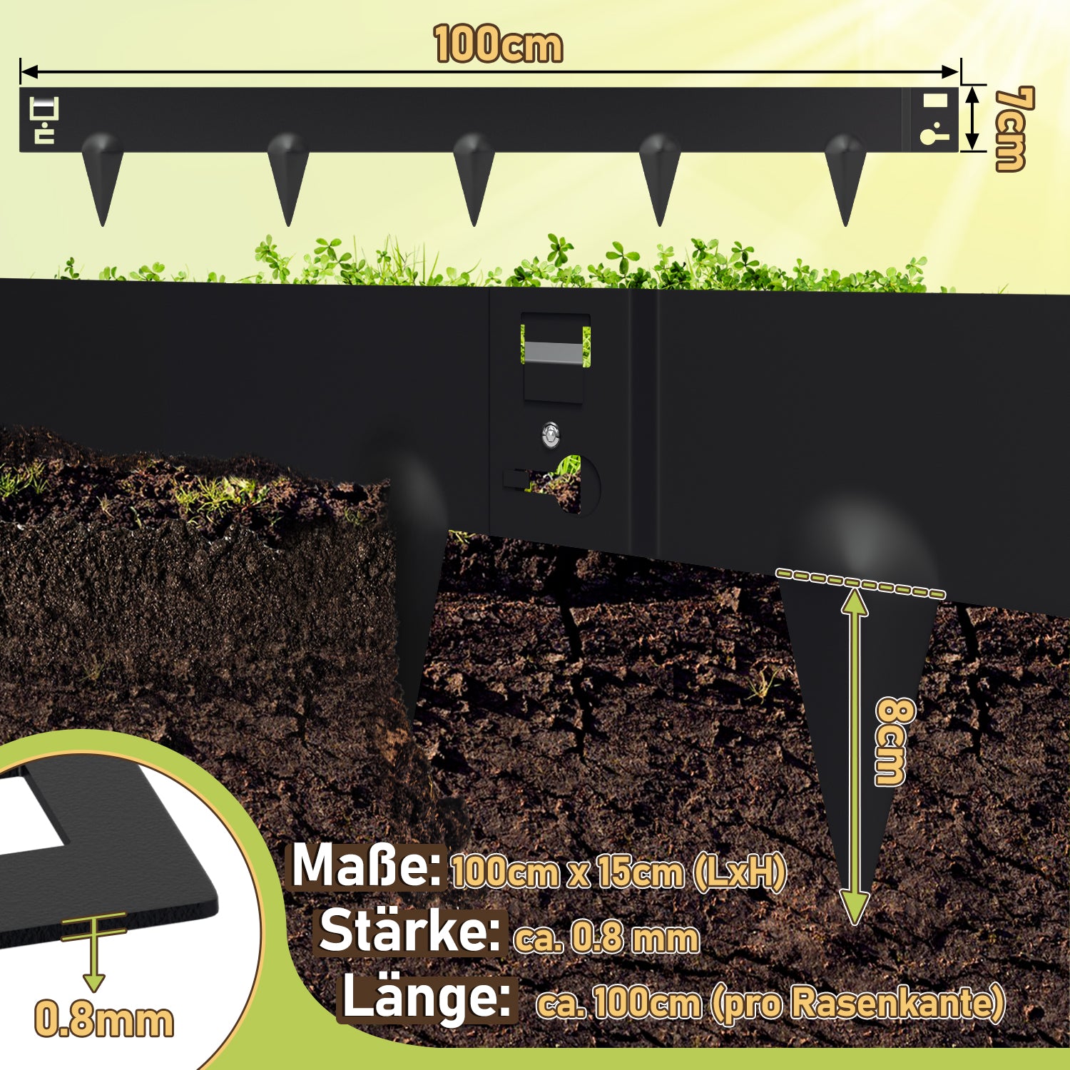 🌷 Größe: Rasenkanten 30m, inkl. 30 Kanten. Einzeln 100cm Länge x 15cm Höhe,einschließen die Spikes), die Höhe der Spikes ist 8cm, und der Teil über dem Boden ist 7cm. Dicke: 0.8mm. Die länglichen Spikes können sicher am Boden befestigt werden, so dass Sie saubere Linien und Platz auf dem Rasen schaffen können.