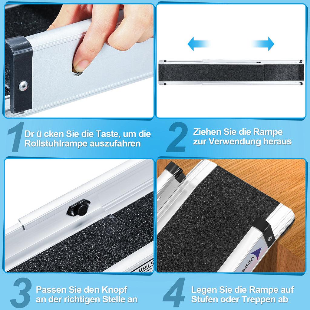 Einstellbare Größe: Rampe rollstuhl's einstellbare Länge 105-183cm, ausgestattet mit einem Knopf, der gedrückt werden kann, um die Rollstuhlrampe leicht zu teleskopieren, um sie schnell und einfach zu verstellen, können Sie es auf die richtige Länge einstellen, um nach Ihren Bedürfnissen zu verwenden, sehr bequem.